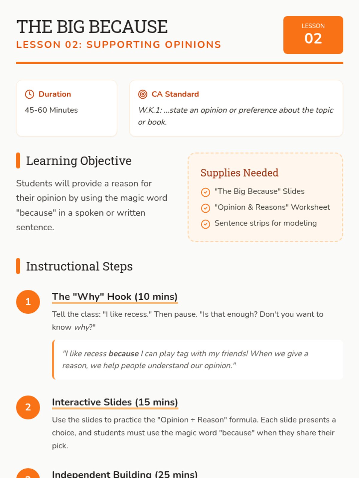 Students learn to bridge their opinions with reasons using the conjunction 'because', transitioning from simple statements to supported claims.