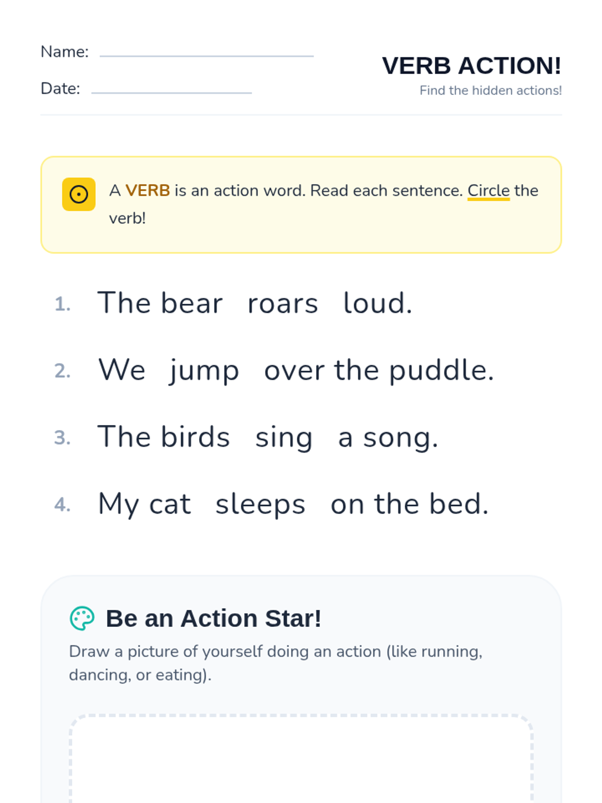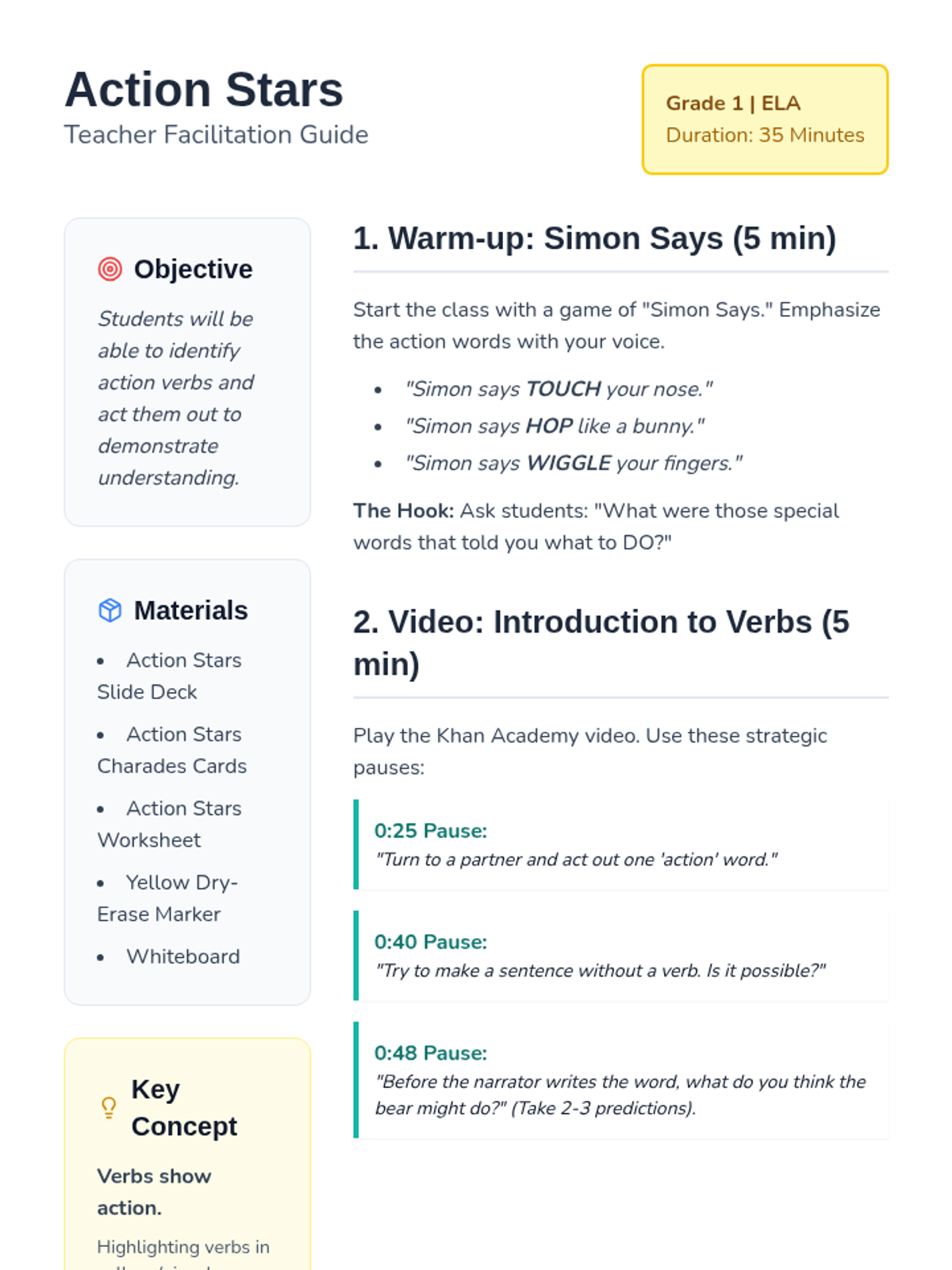 In this high-energy 1st-grade lesson, students become 'Action Stars' as they discover the power of verbs. Through a game of Simon Says, an interactive video, and a lively round of Verb Charades, students learn to identify and demonstrate action words in sentences.