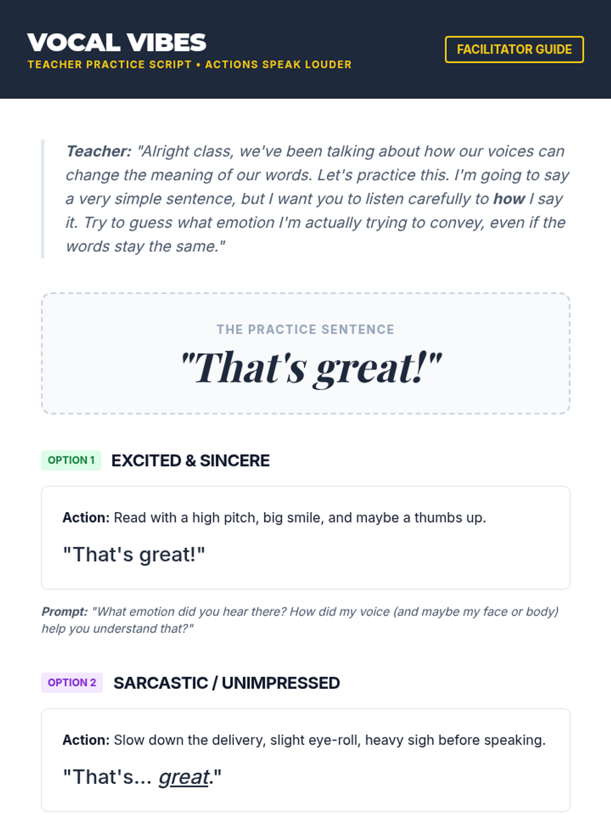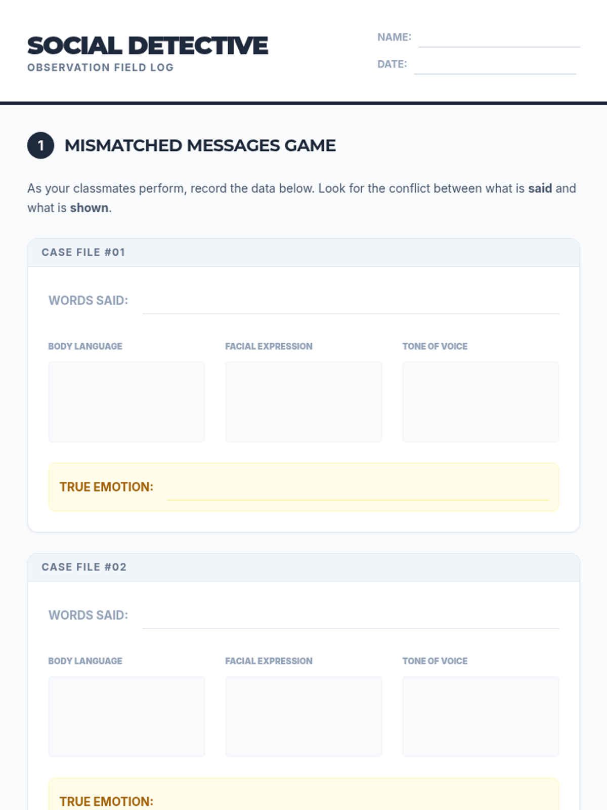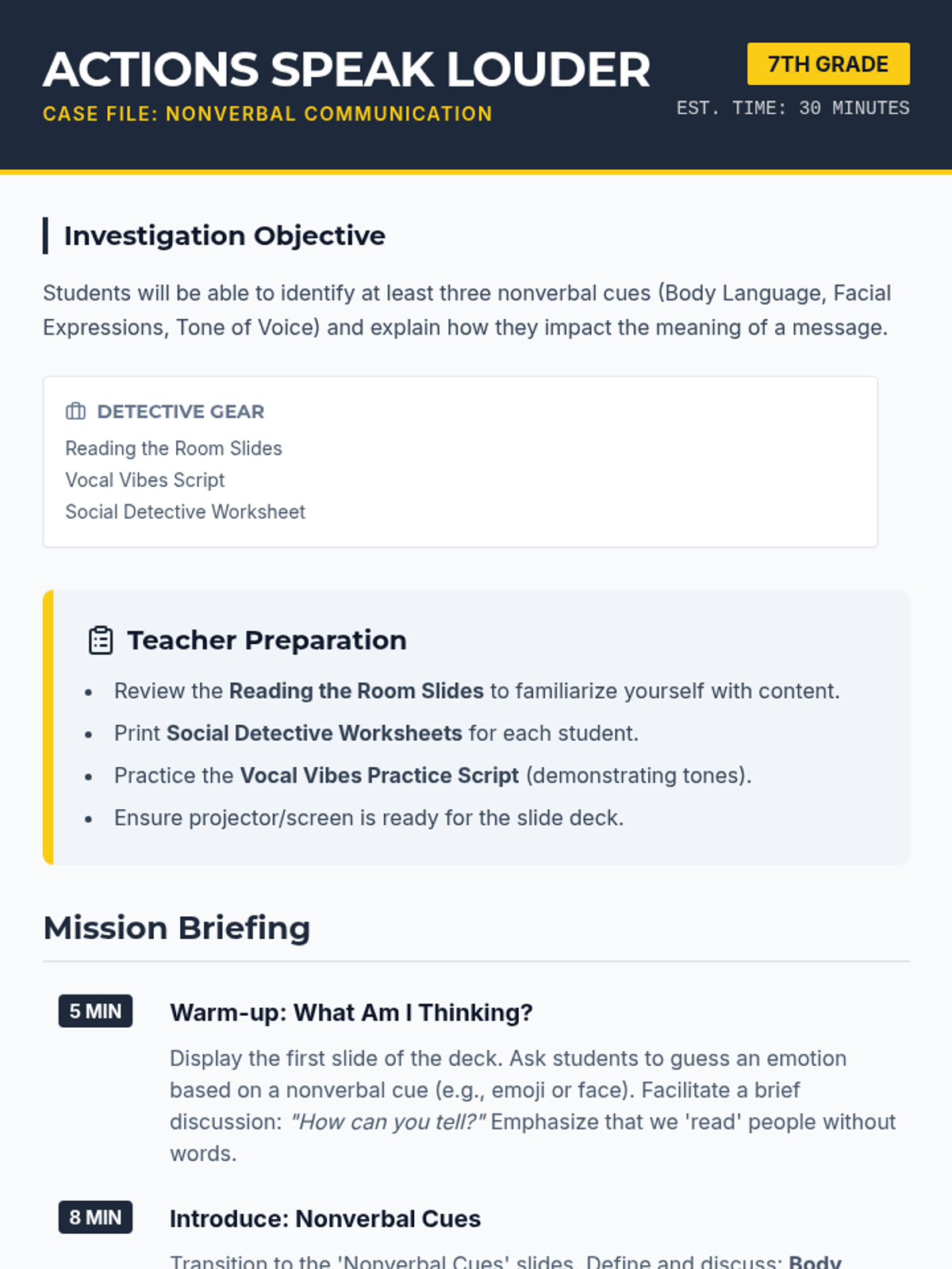 This 30-minute lesson for 7th graders helps students understand and interpret nonverbal communication. By recognizing body language, facial expressions, and tone of voice, students will improve their communication and social awareness skills.