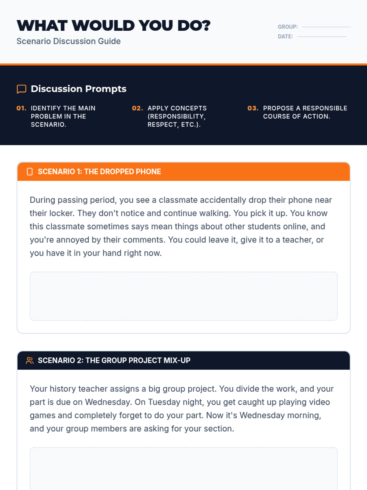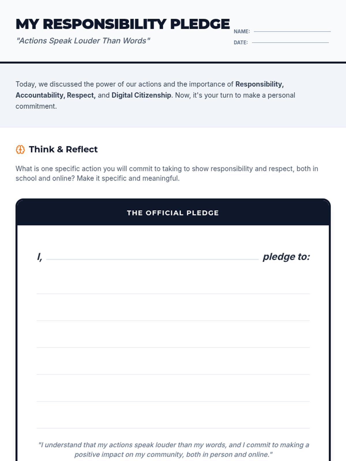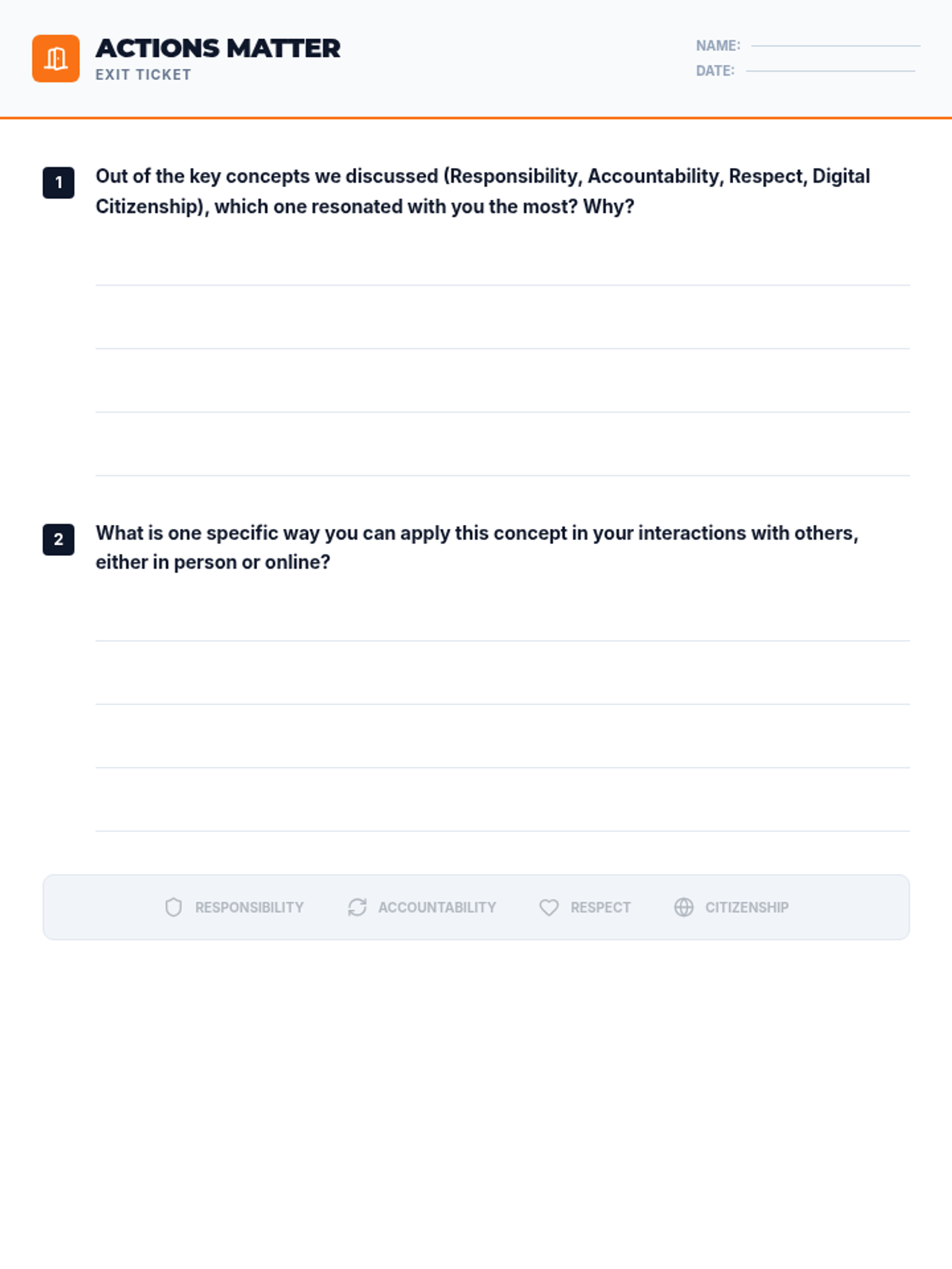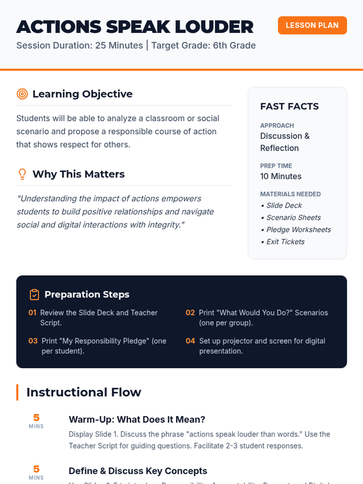 A 25-minute lesson for 6th graders exploring the impact of their actions on their community and digital world, focusing on responsibility, accountability, and respect.