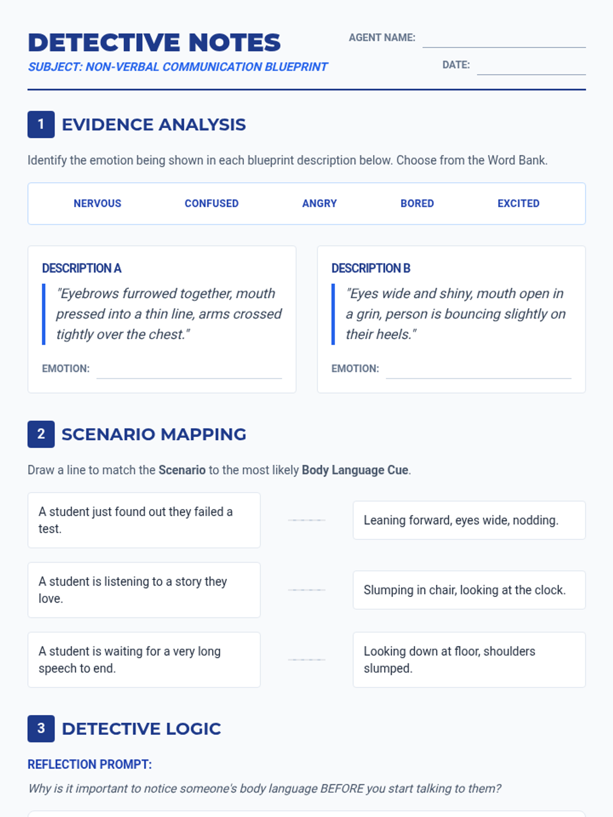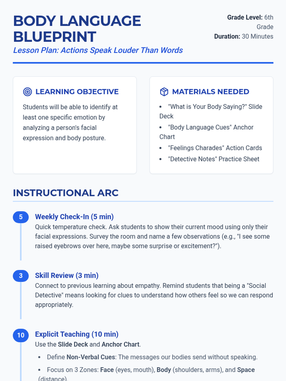 A 30-minute SEL lesson for 6th graders on identifying emotions through non-verbal cues like facial expressions and body posture.