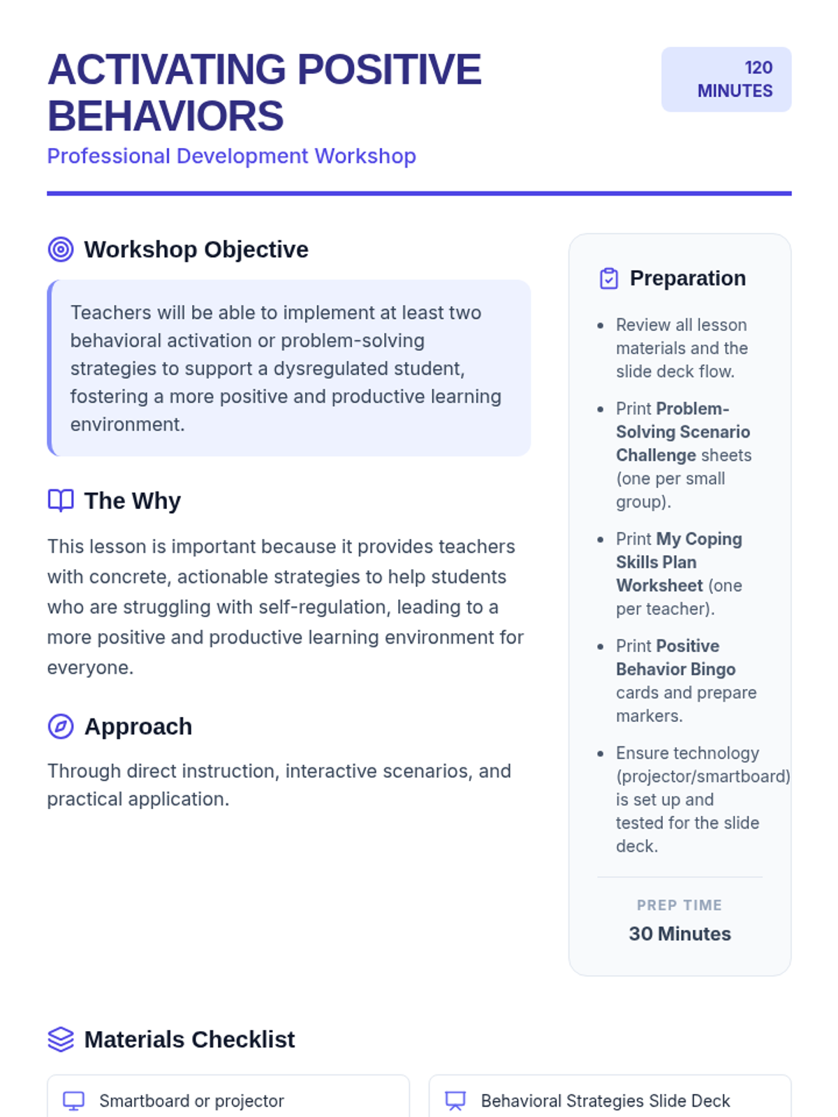 This 120-minute teacher training session focuses on practical strategies like behavioral activation and a 5-step problem-solving model to support dysregulated students and foster positive classroom behaviors.