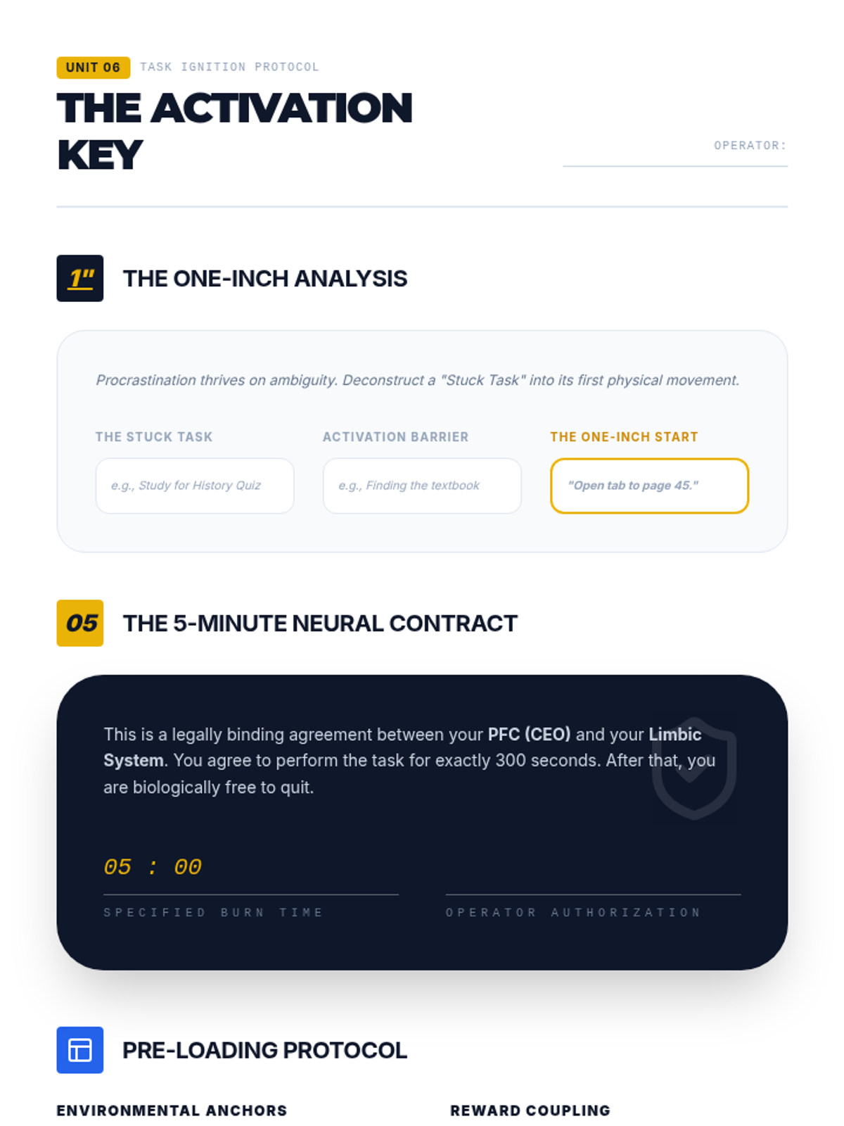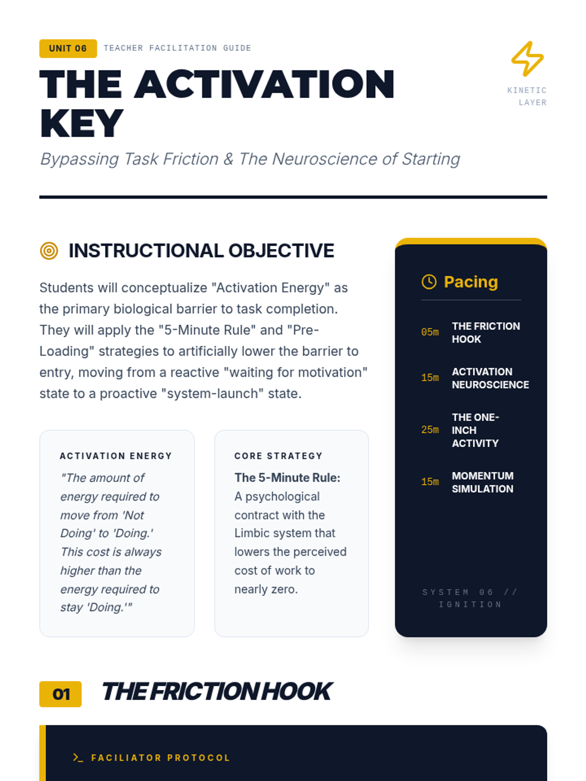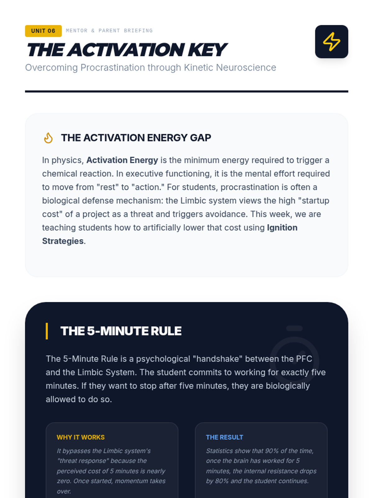 Addresses the 'procrastination-activation' gap. Teaches the neuroscience of 'Activation Energy' and strategies like the 5-Minute Rule to overcome task-start friction.