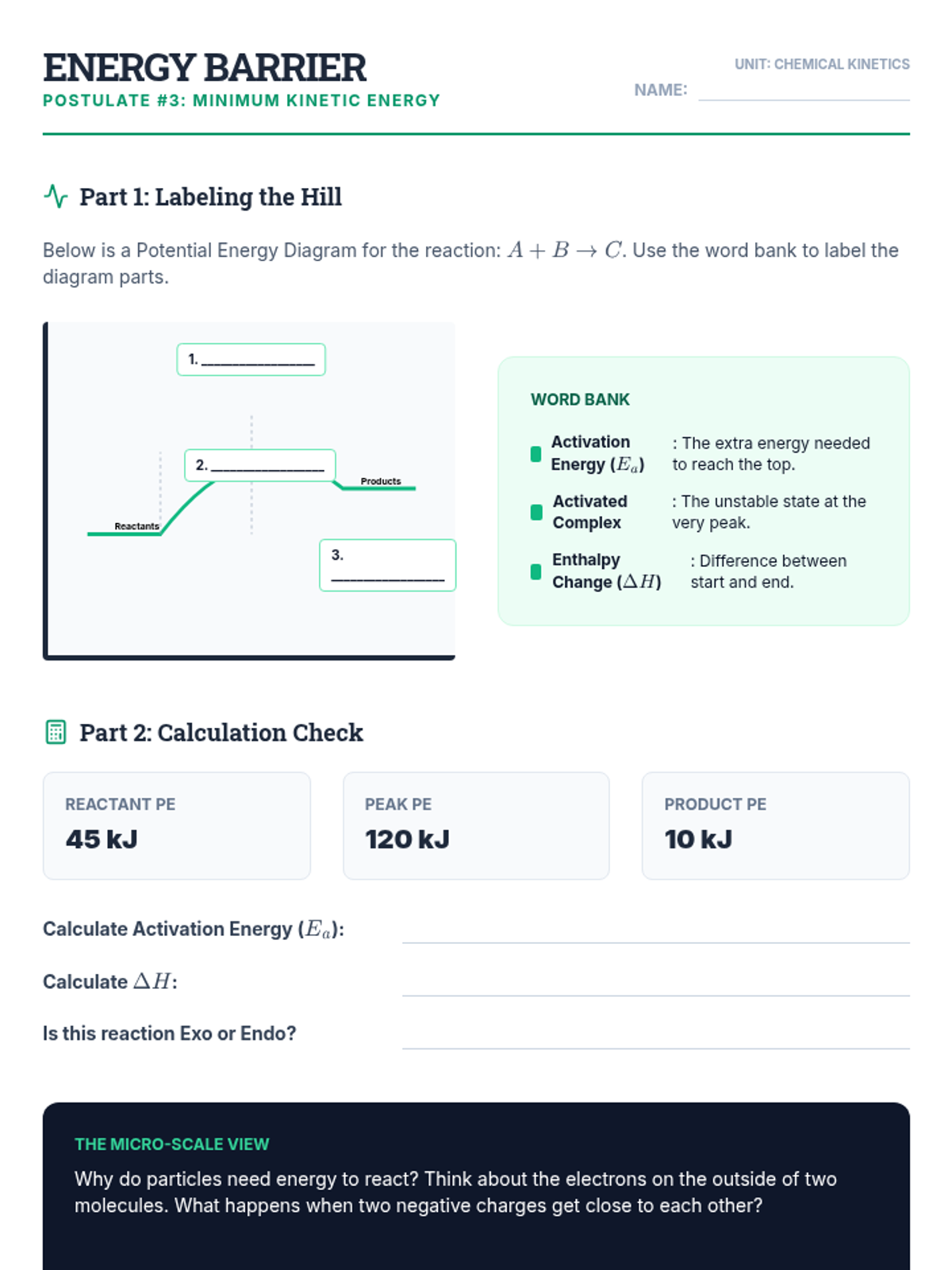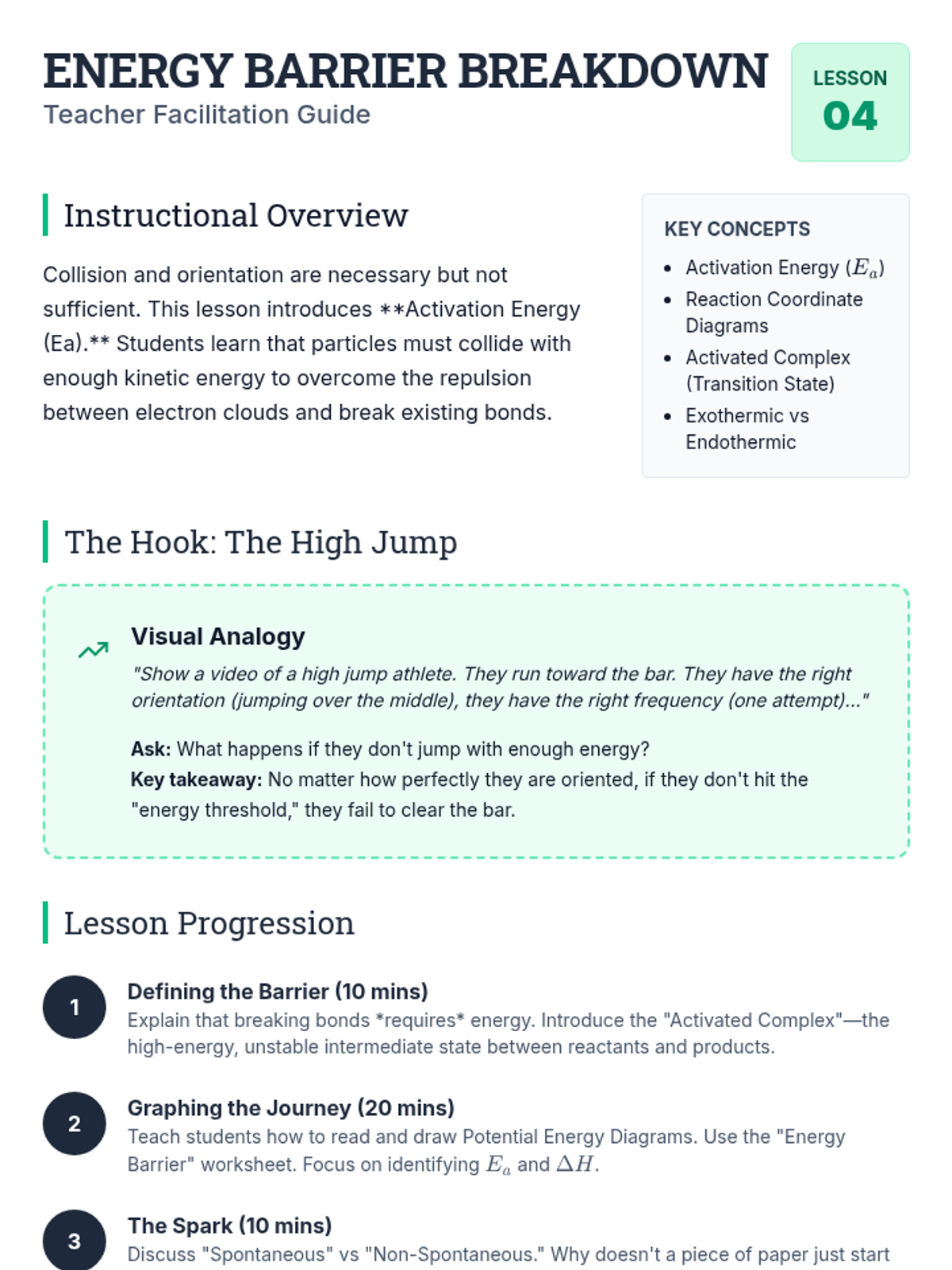 This lesson introduces the minimum energy threshold required for a reaction to occur, using potential energy diagrams to visualize the activation energy barrier.