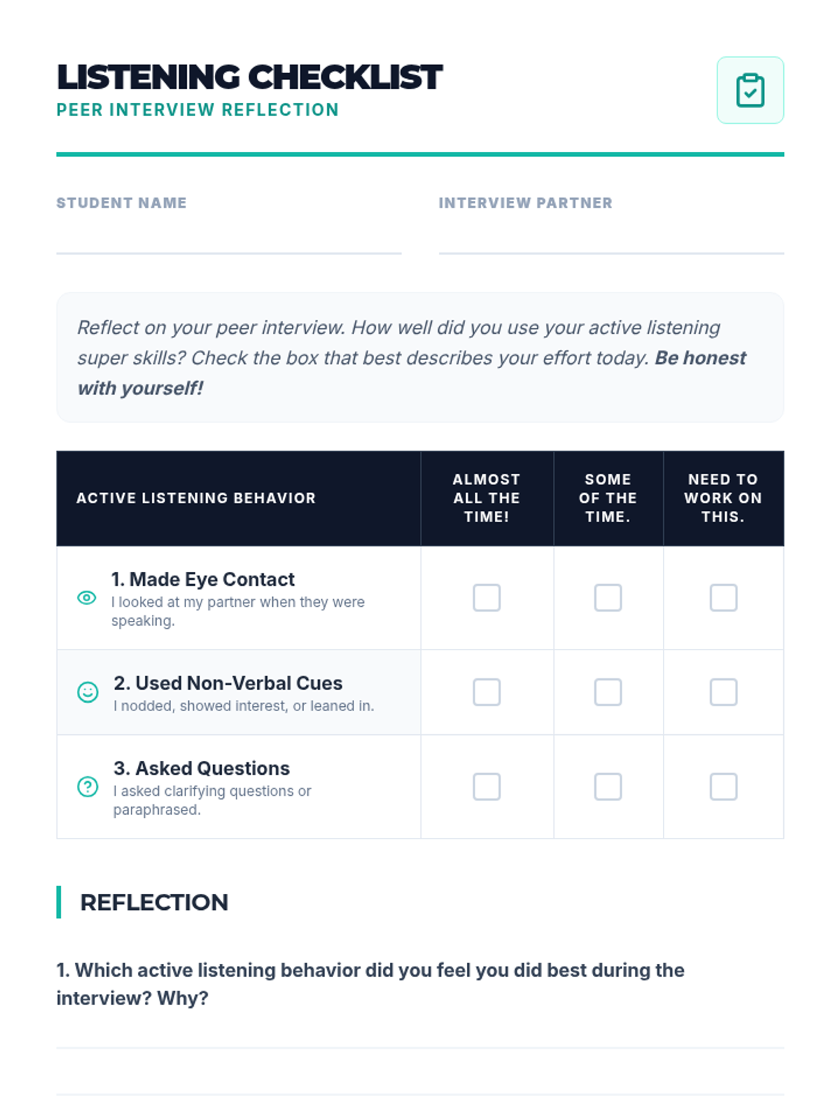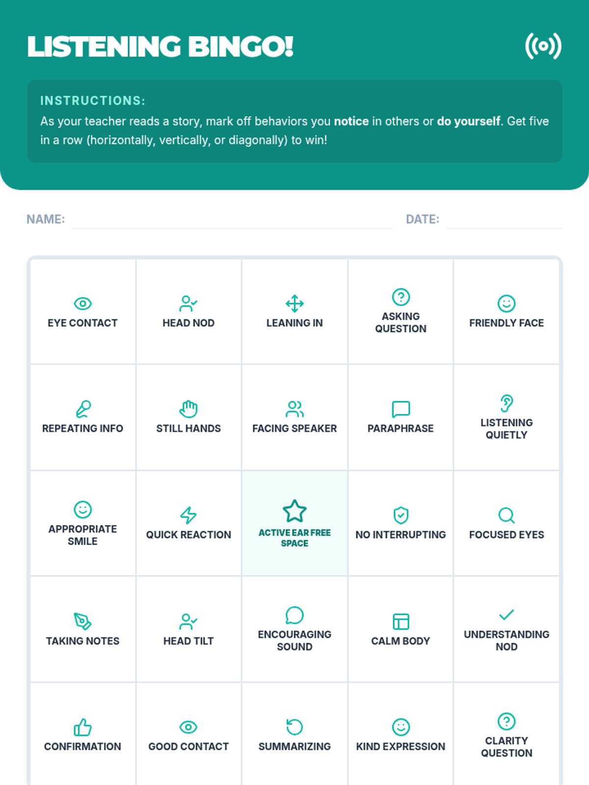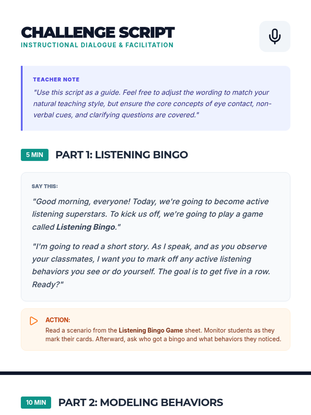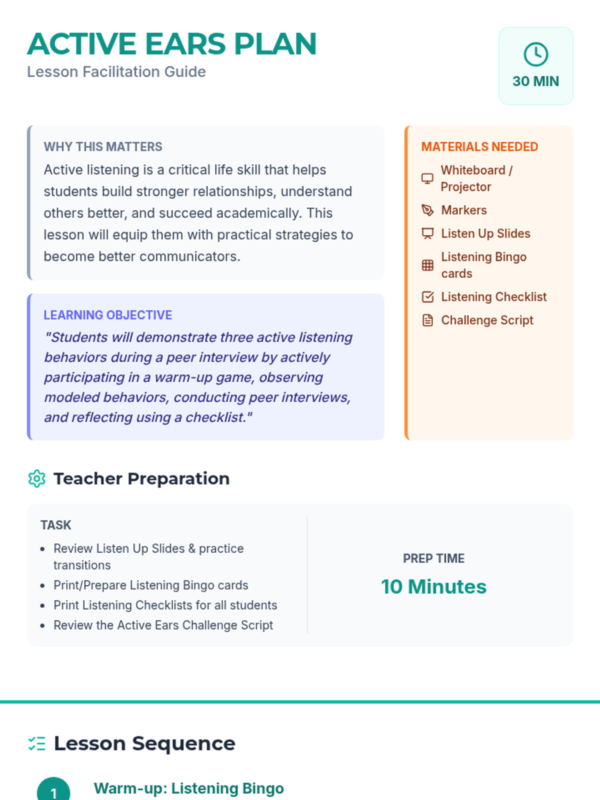 A 30-minute interactive lesson for 5th graders to master active listening through a bingo warm-up, modeled behaviors, and peer interviews.