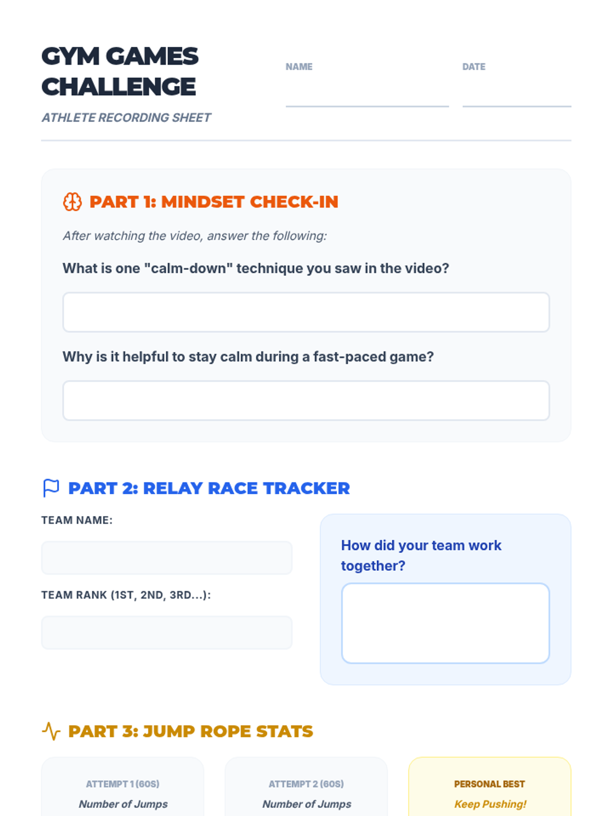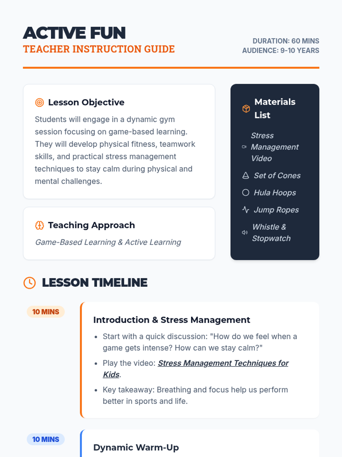 A high-energy gym session for 9-10 year olds that combines physical activity, teamwork, and stress management techniques. Students participate in relay races and jump rope challenges while learning how to stay calm and focused under pressure.