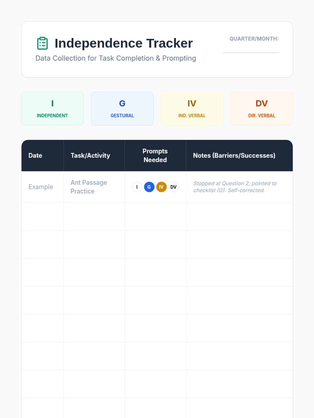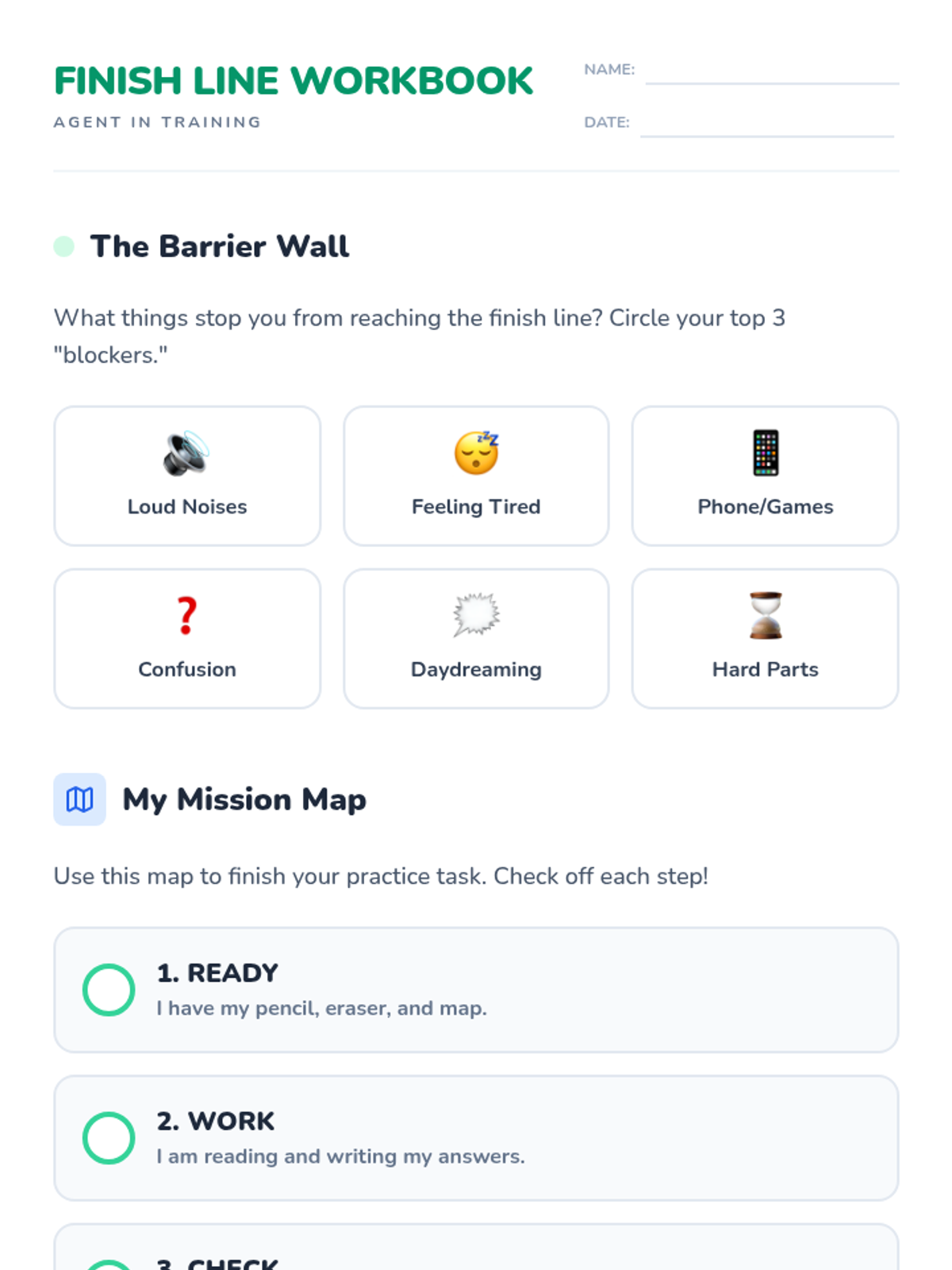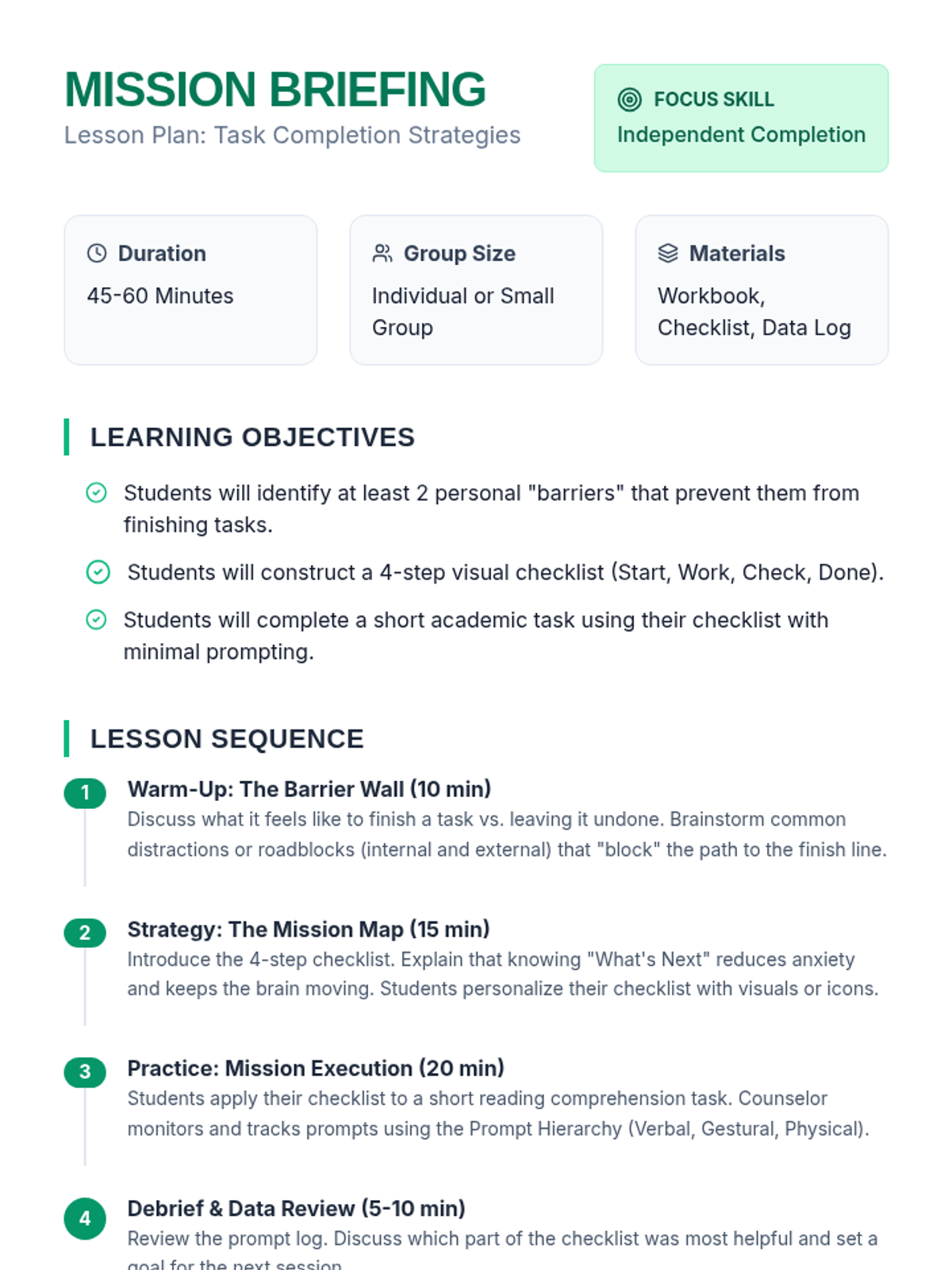 A focused lesson designed to help students identify personal barriers to task completion and implement a visual checklist strategy to increase independence and decrease prompt dependency.