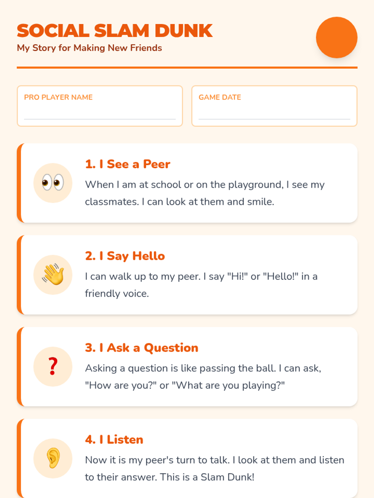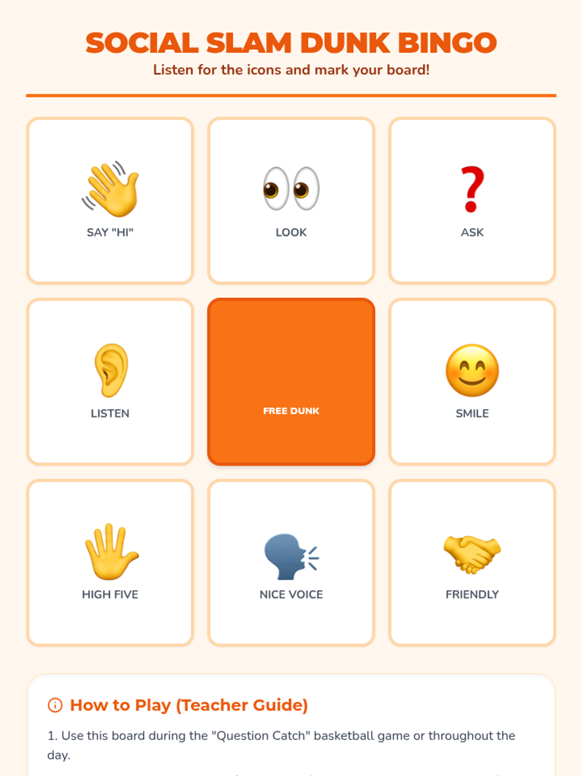 A social skills lesson designed for students with intellectual disabilities, focusing on initiating conversations and asking questions through a basketball-themed social story, role-playing, and an active movement game.