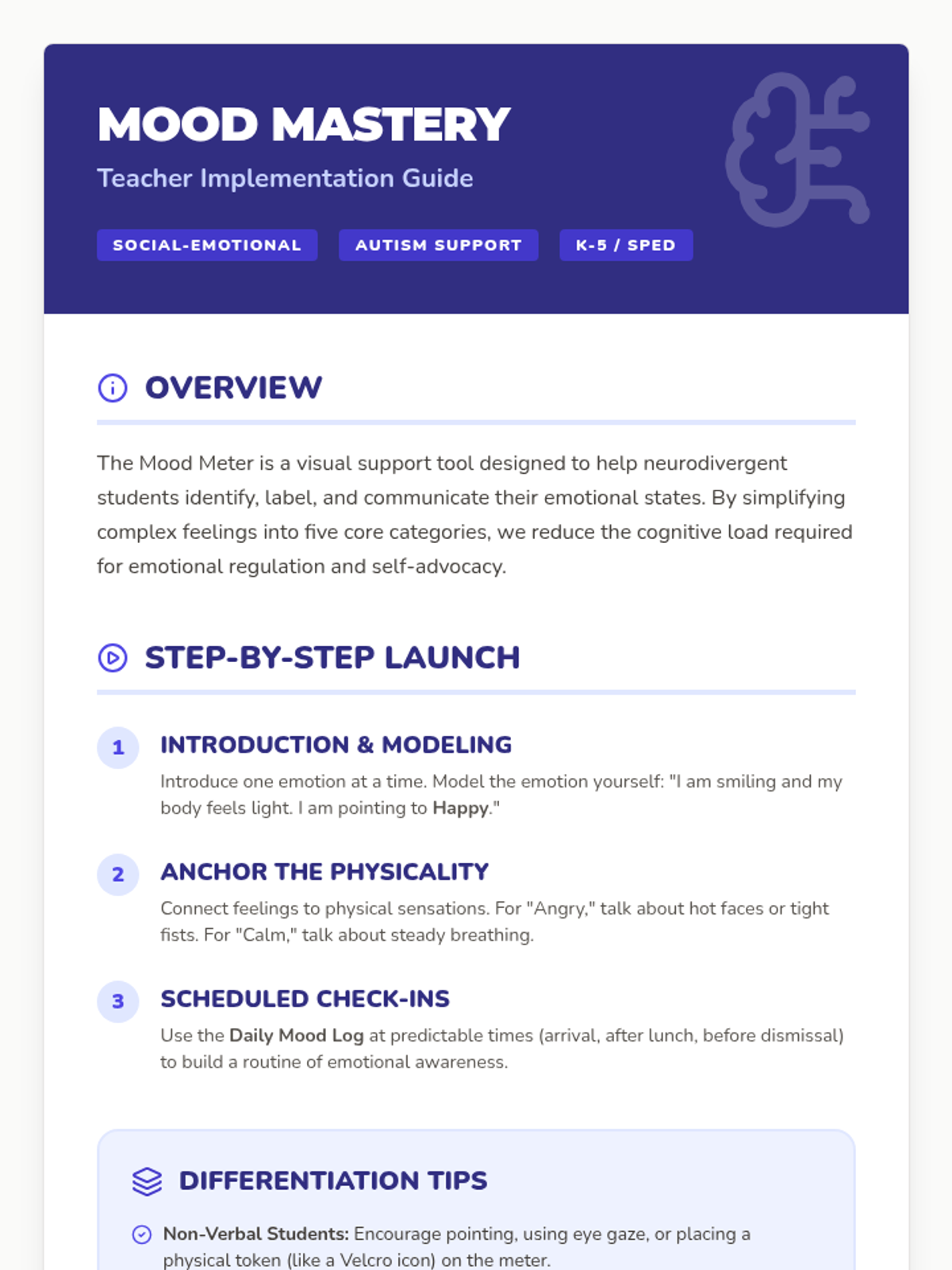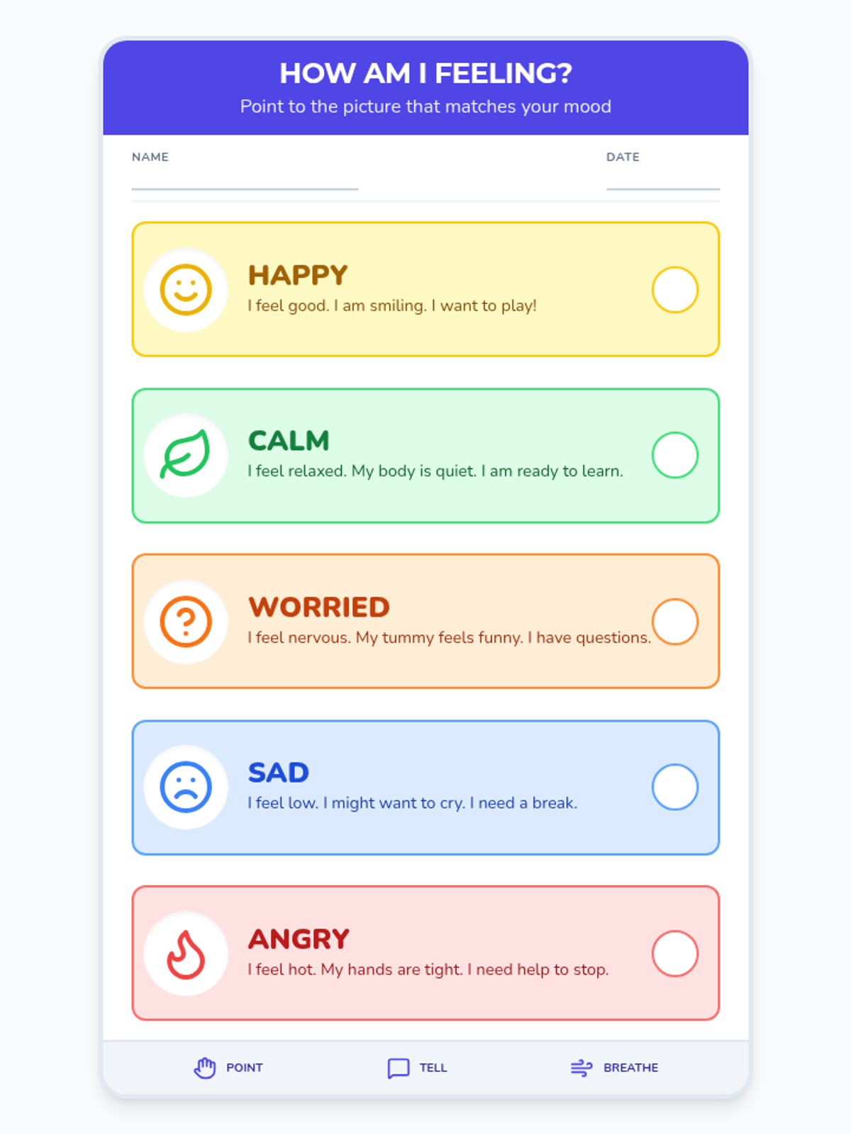 A set of visual tools and strategies to help students with learning disabilities and autism identify, communicate, and regulate their emotions using a simplified mood meter.
