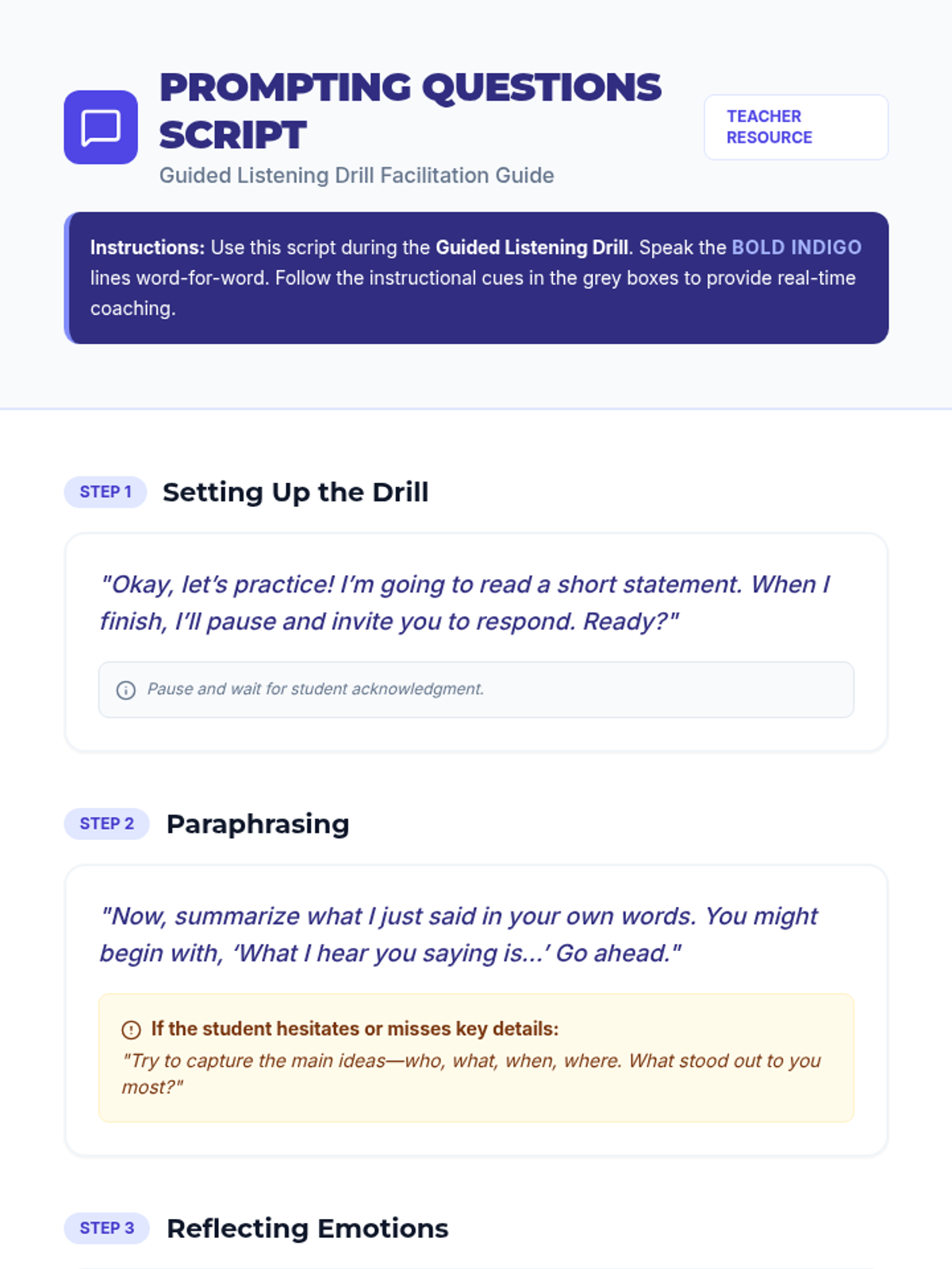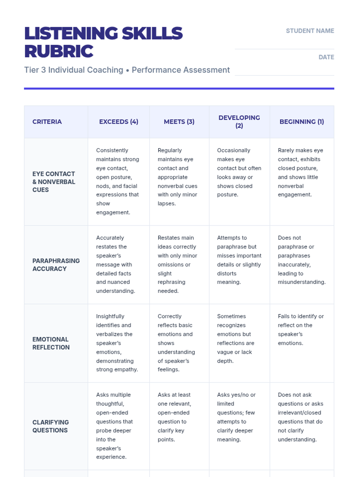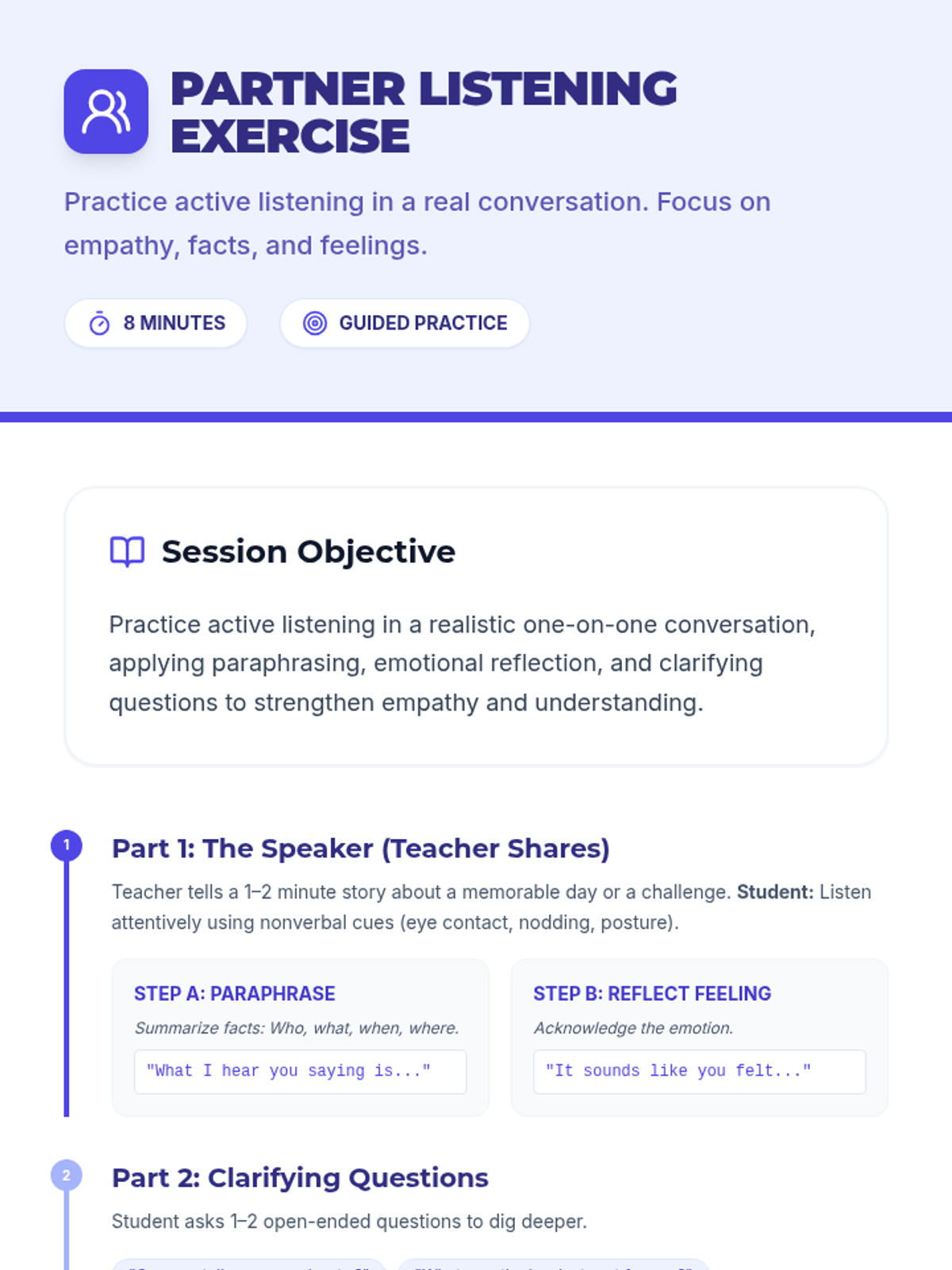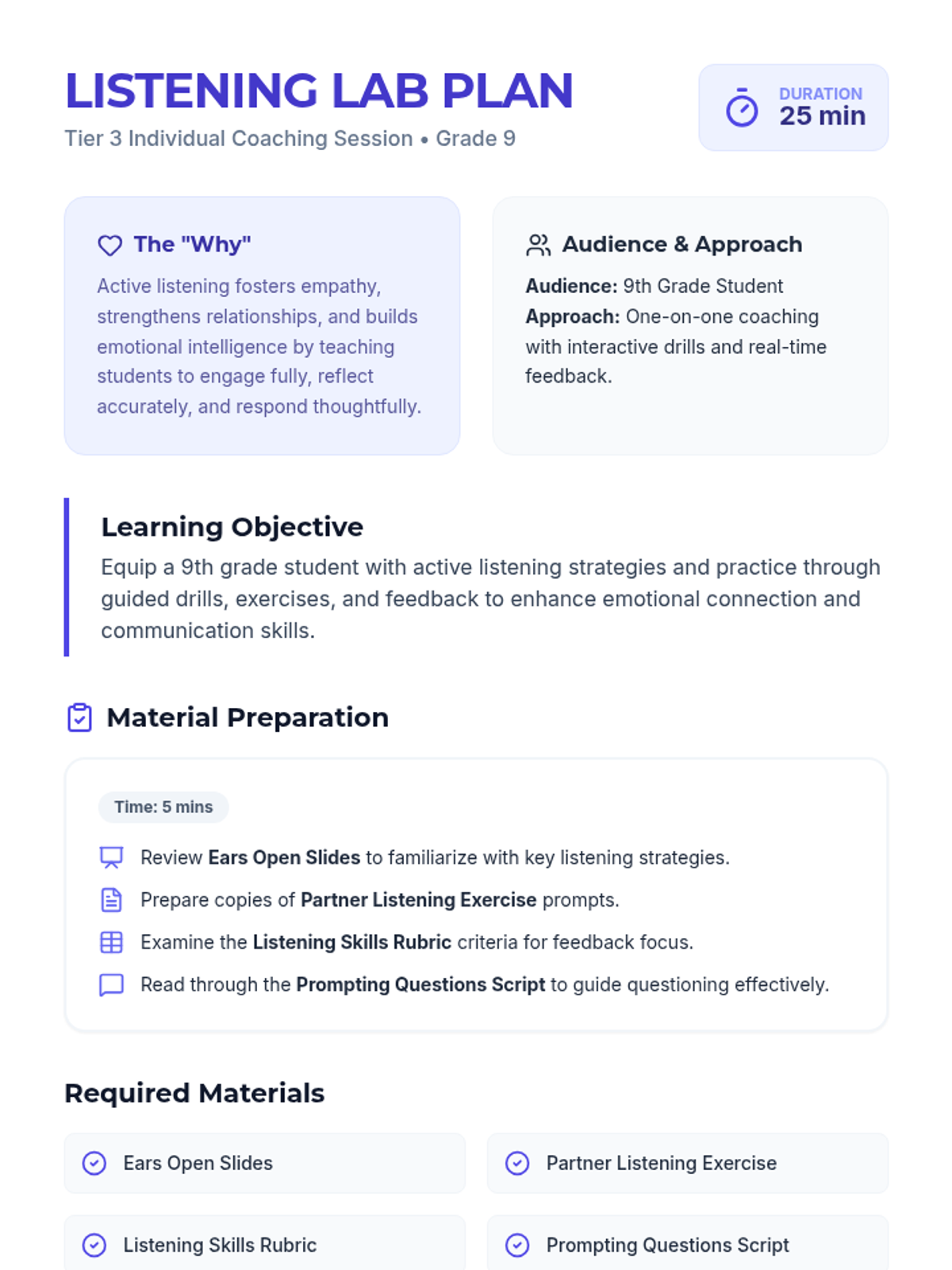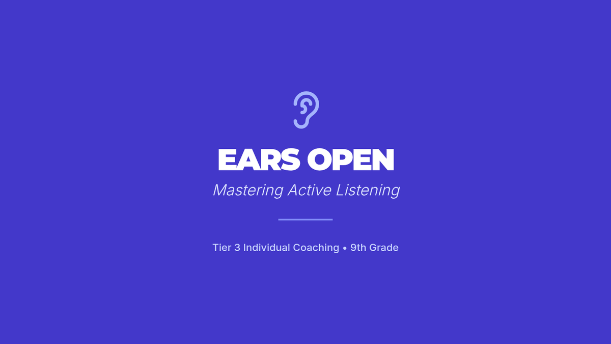 A 25-minute, one-on-one coaching session for 9th-grade students to master active listening through targeted drills, reflective practice, and real-time feedback. Students will learn to use nonverbal cues, paraphrase effectively, and reflect emotions to build stronger relationships.