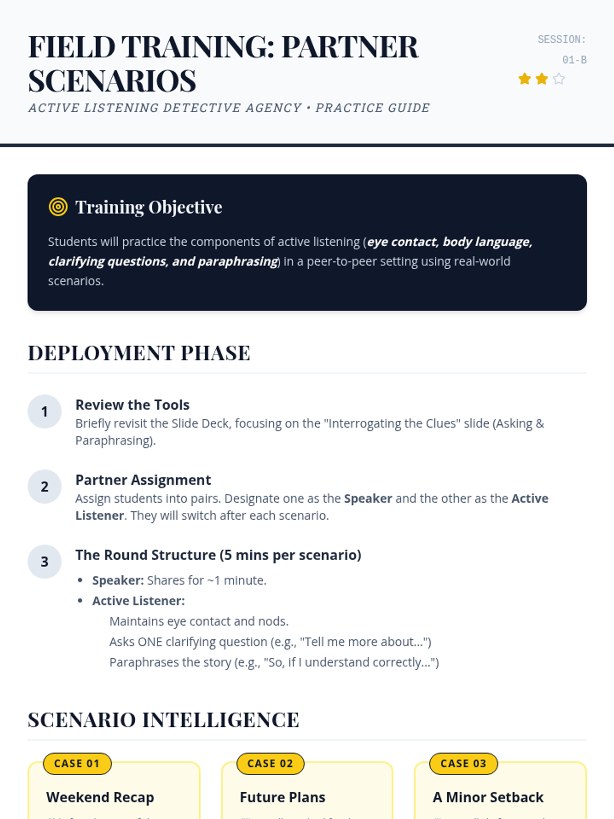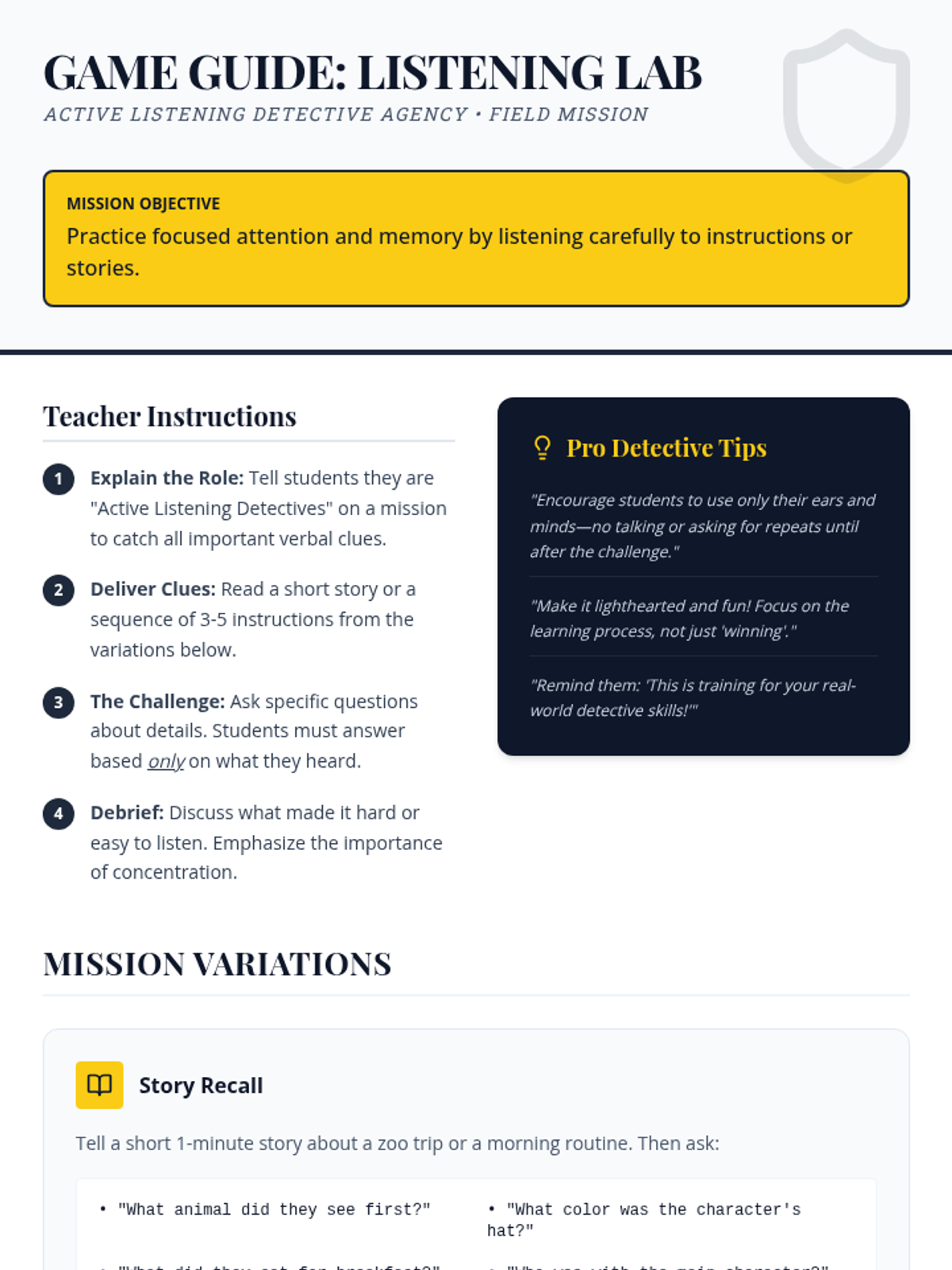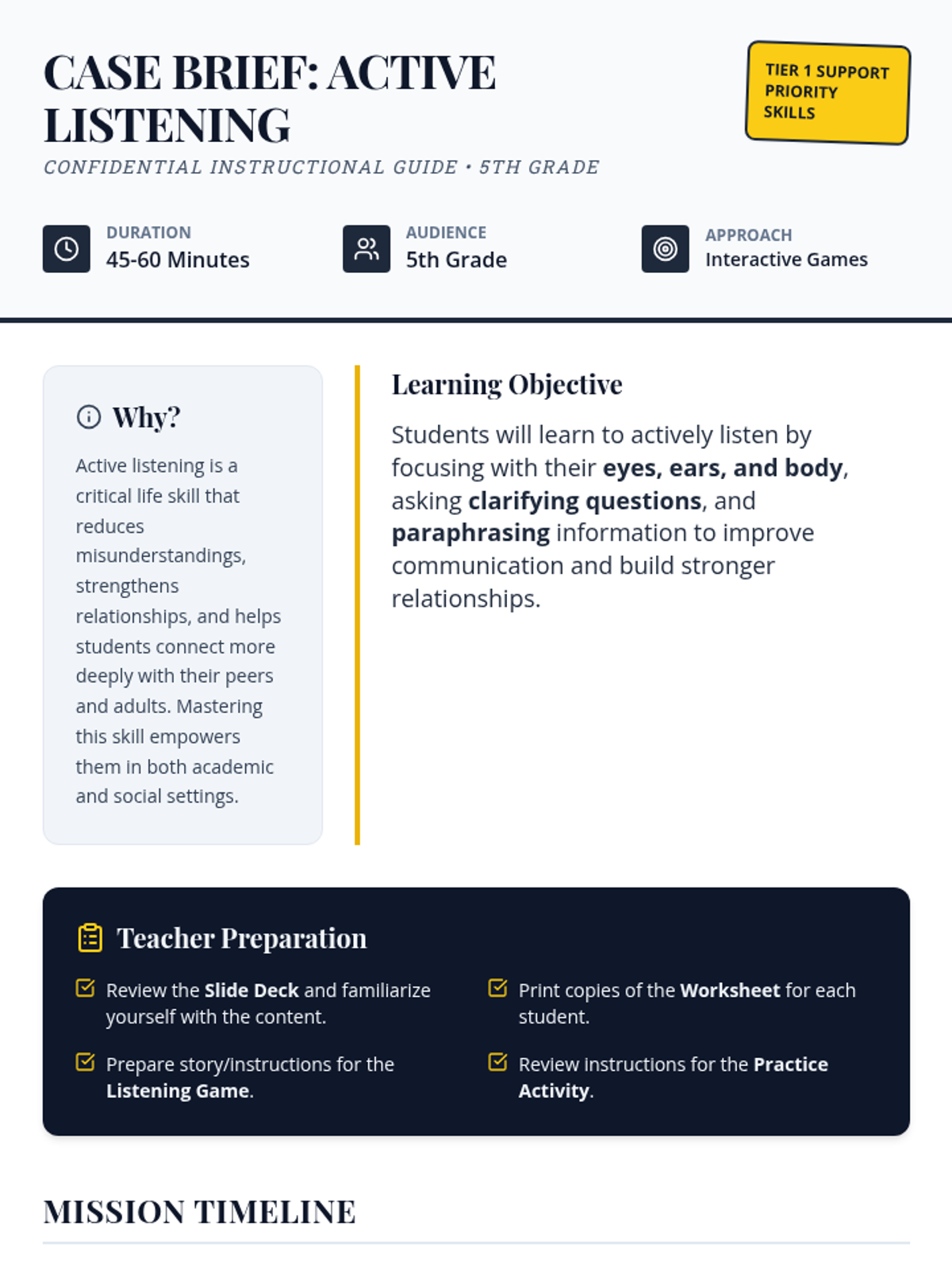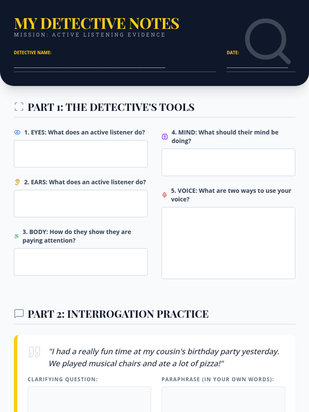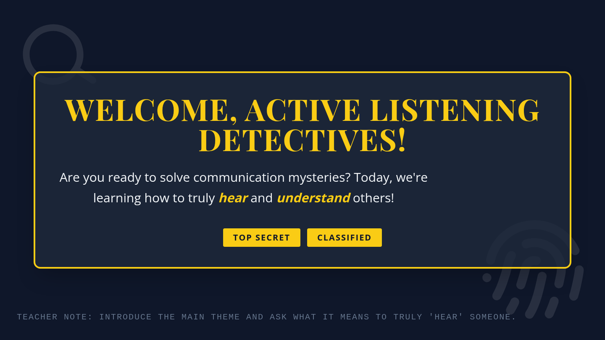 A comprehensive 45-60 minute lesson for 5th graders that uses a 'detective' theme to teach active listening skills, including body language, clarifying questions, and paraphrasing.