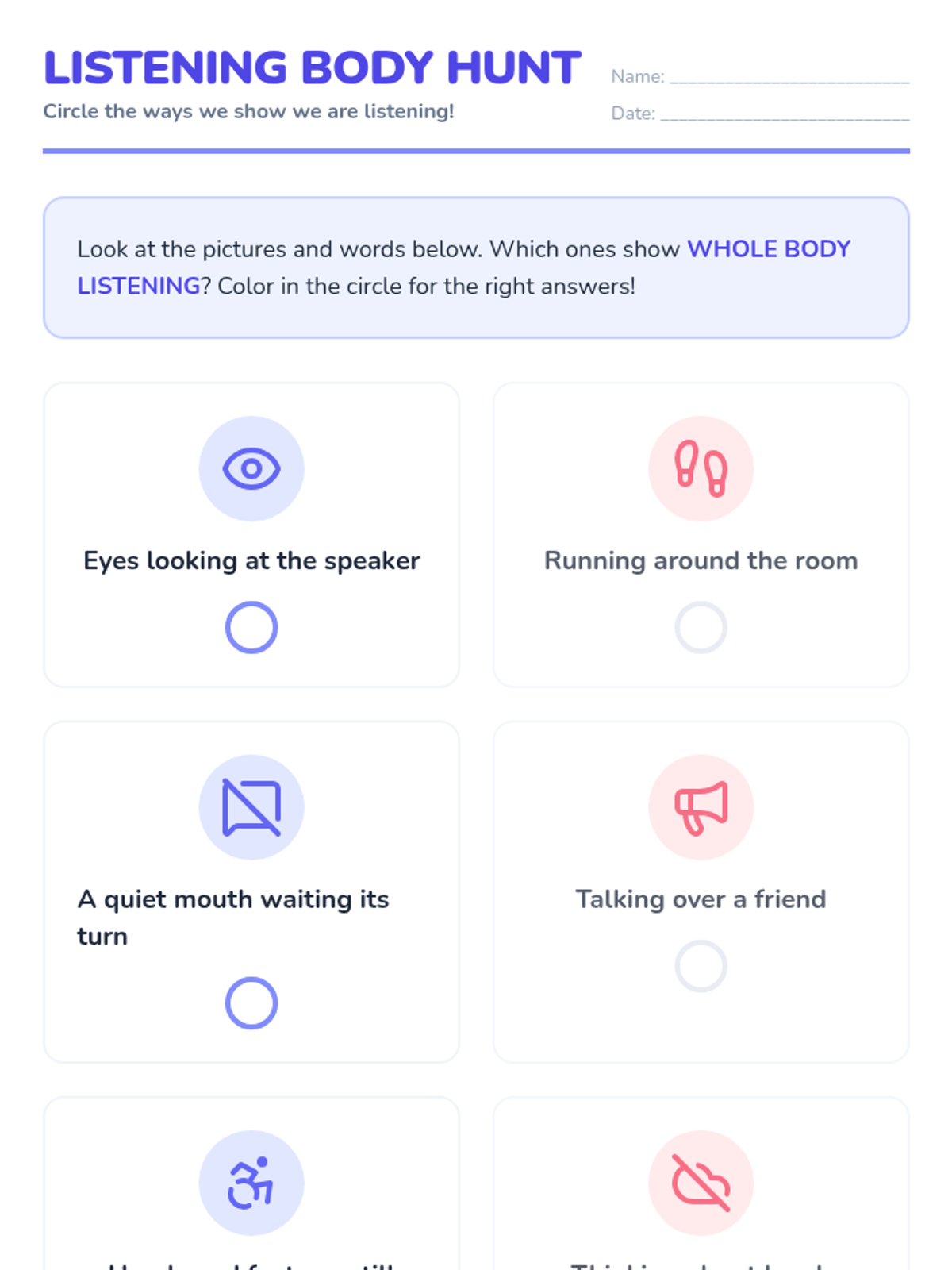 Students learn the rules of being a respectful audience when a peer shares their check-in status, practicing 'whole body listening' to show they care.