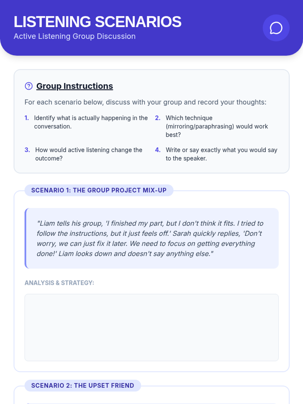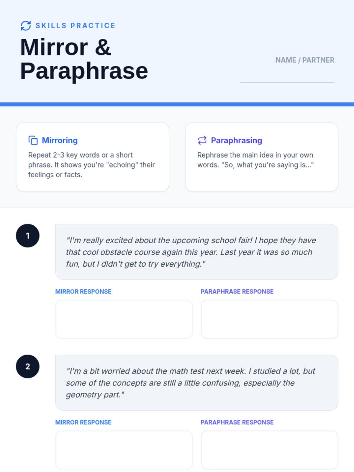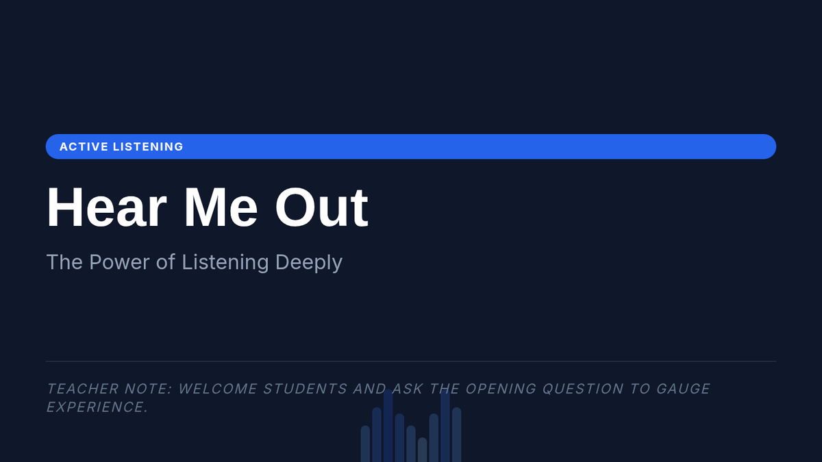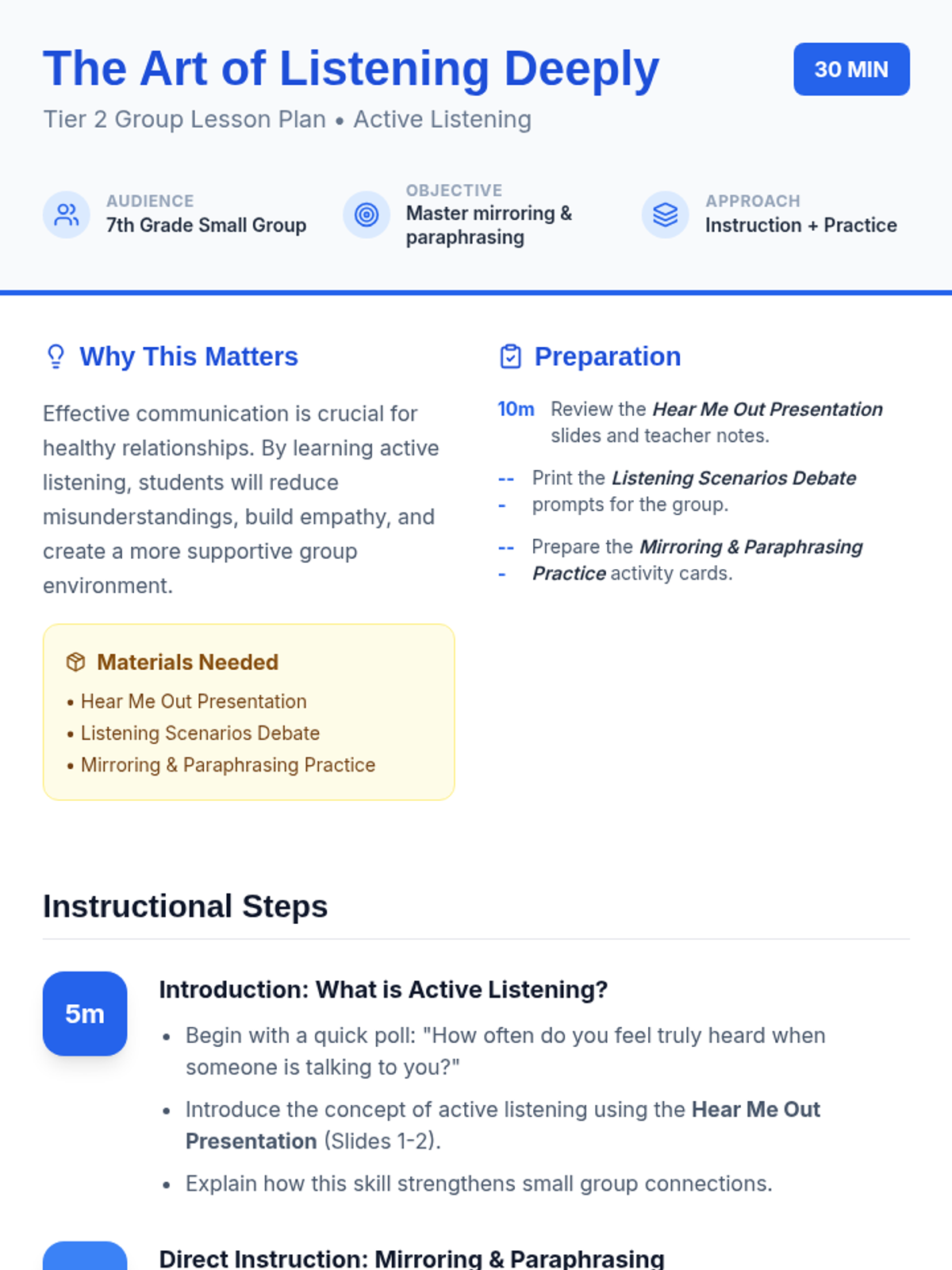 Focuses on developing active listening skills, specifically mirroring and paraphrasing, to enhance communication and empathy within small groups for 7th-grade students.