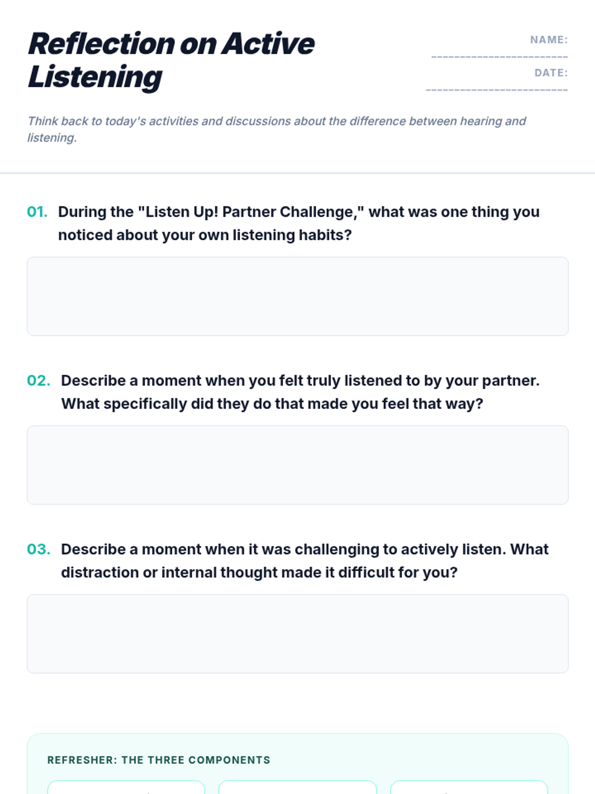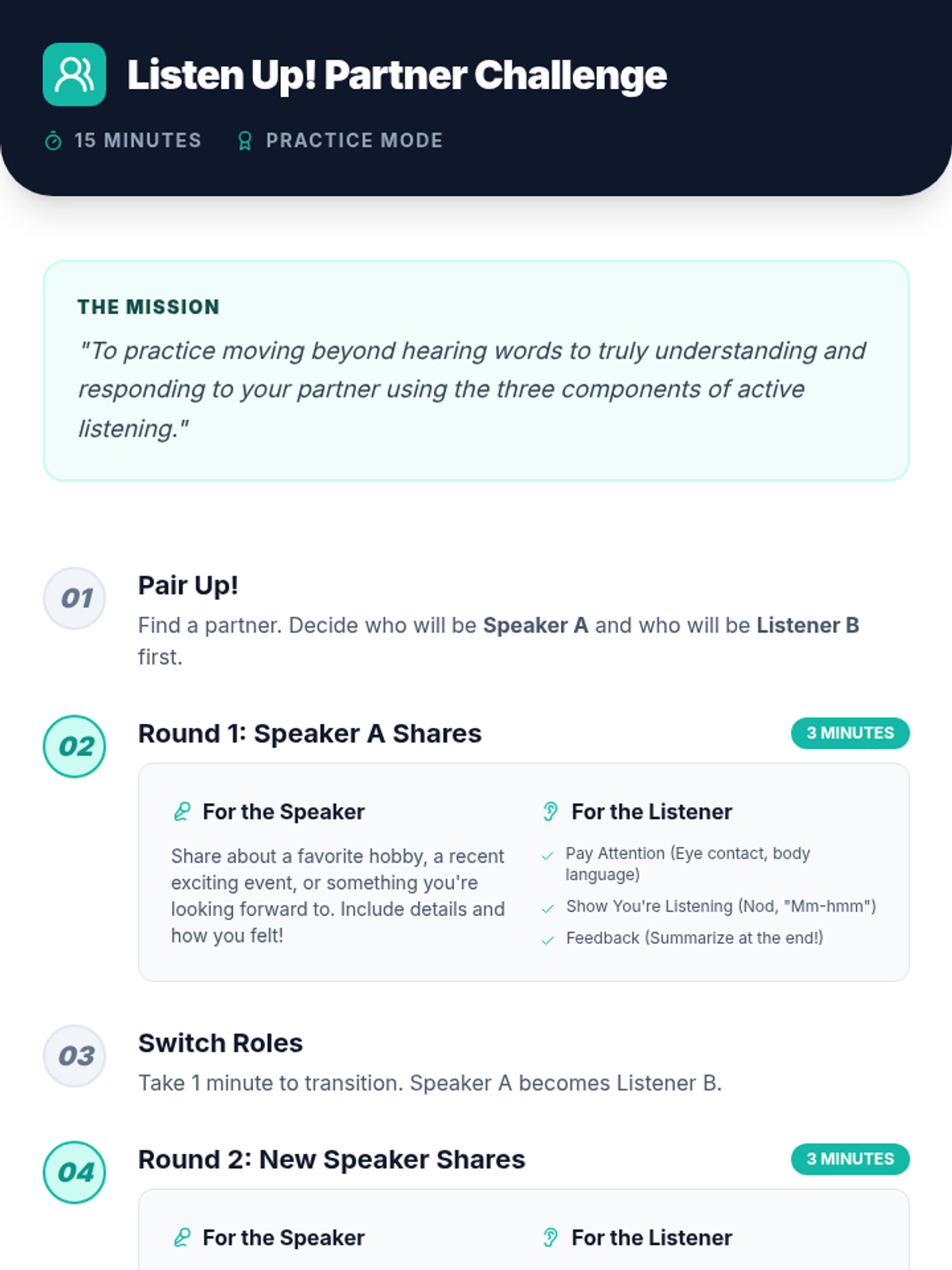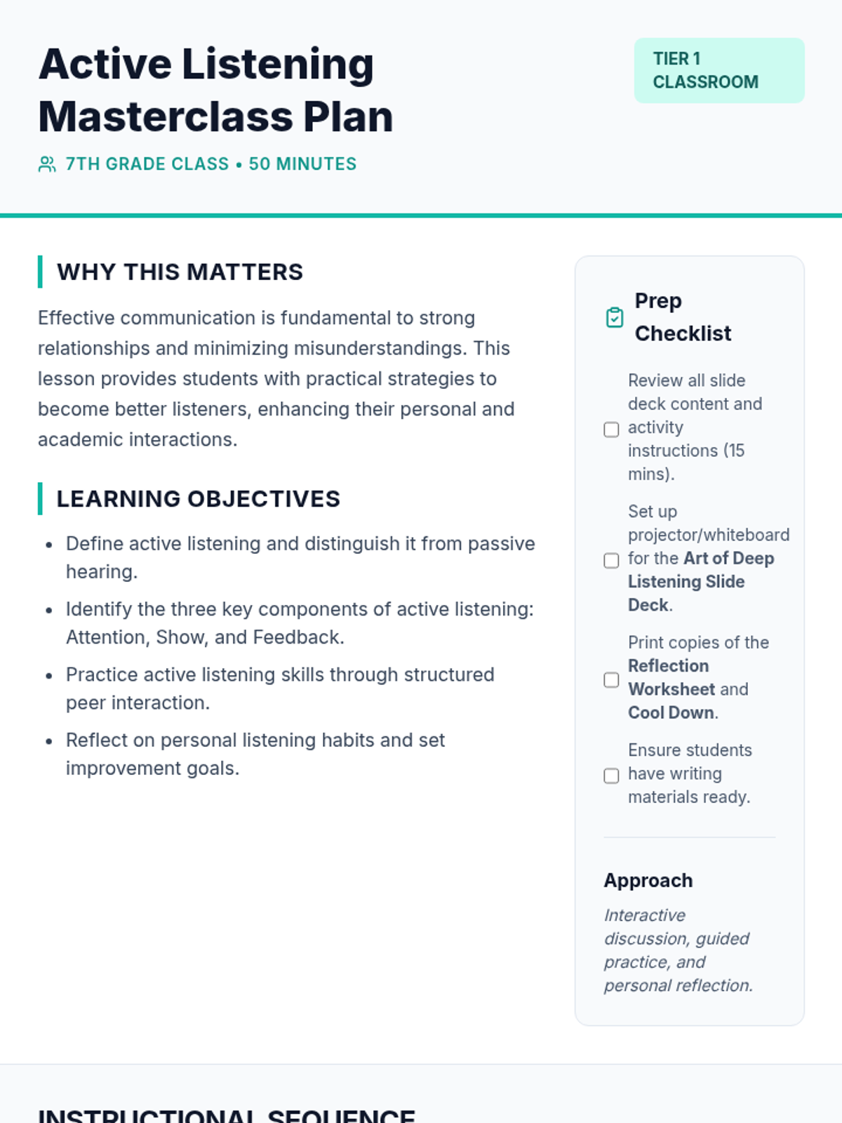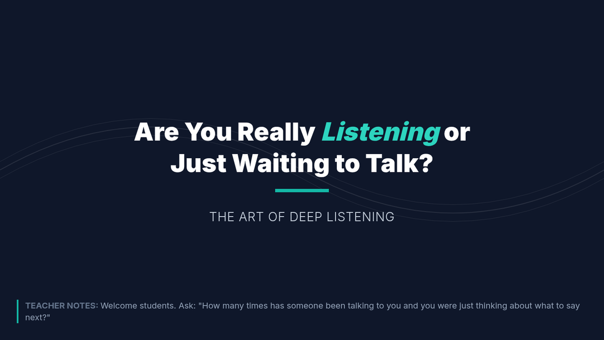 A 50-minute lesson for 7th graders on the art of active listening, helping them distinguish between simply hearing and truly understanding others to improve relationships and reduce conflict.