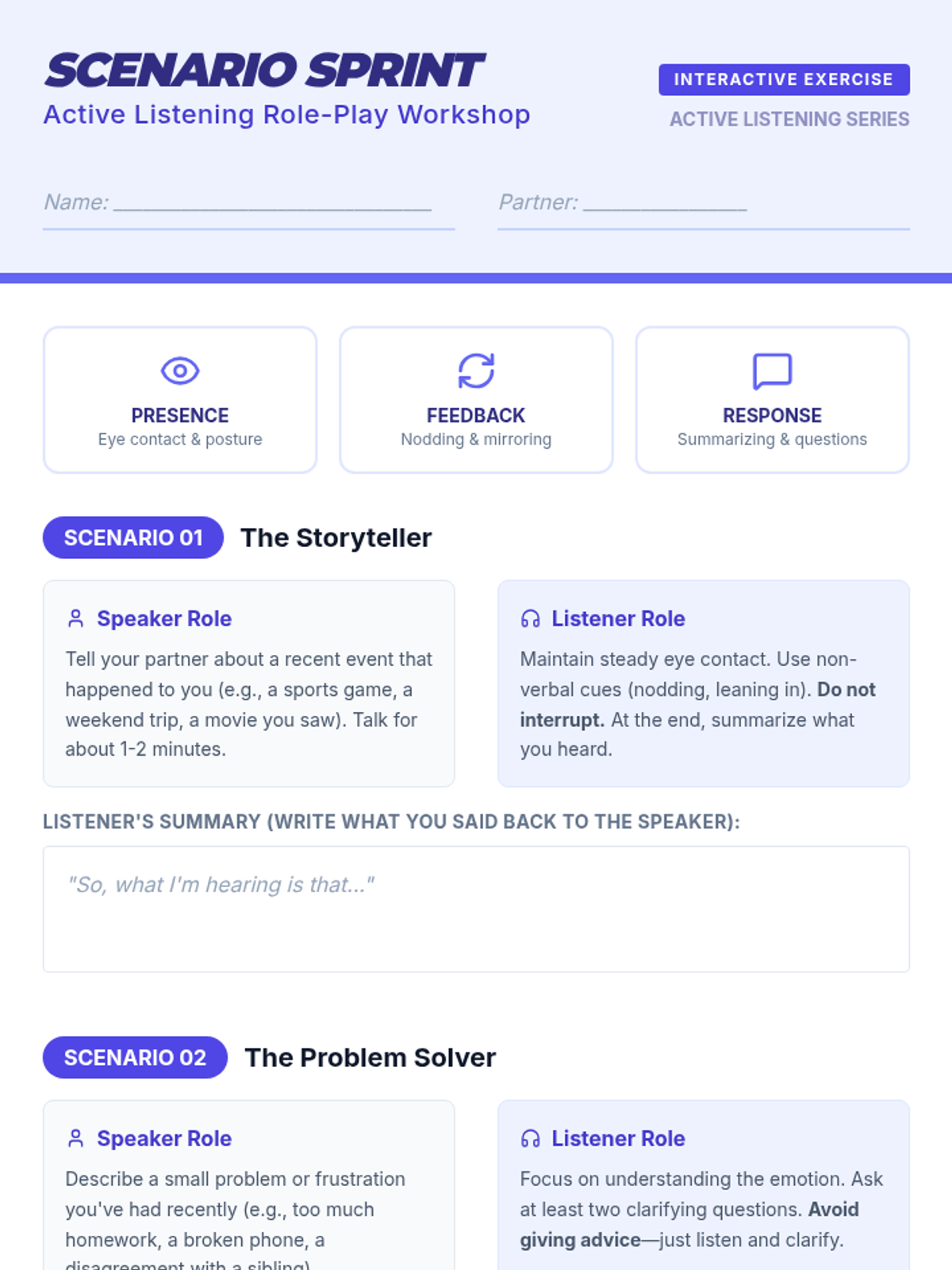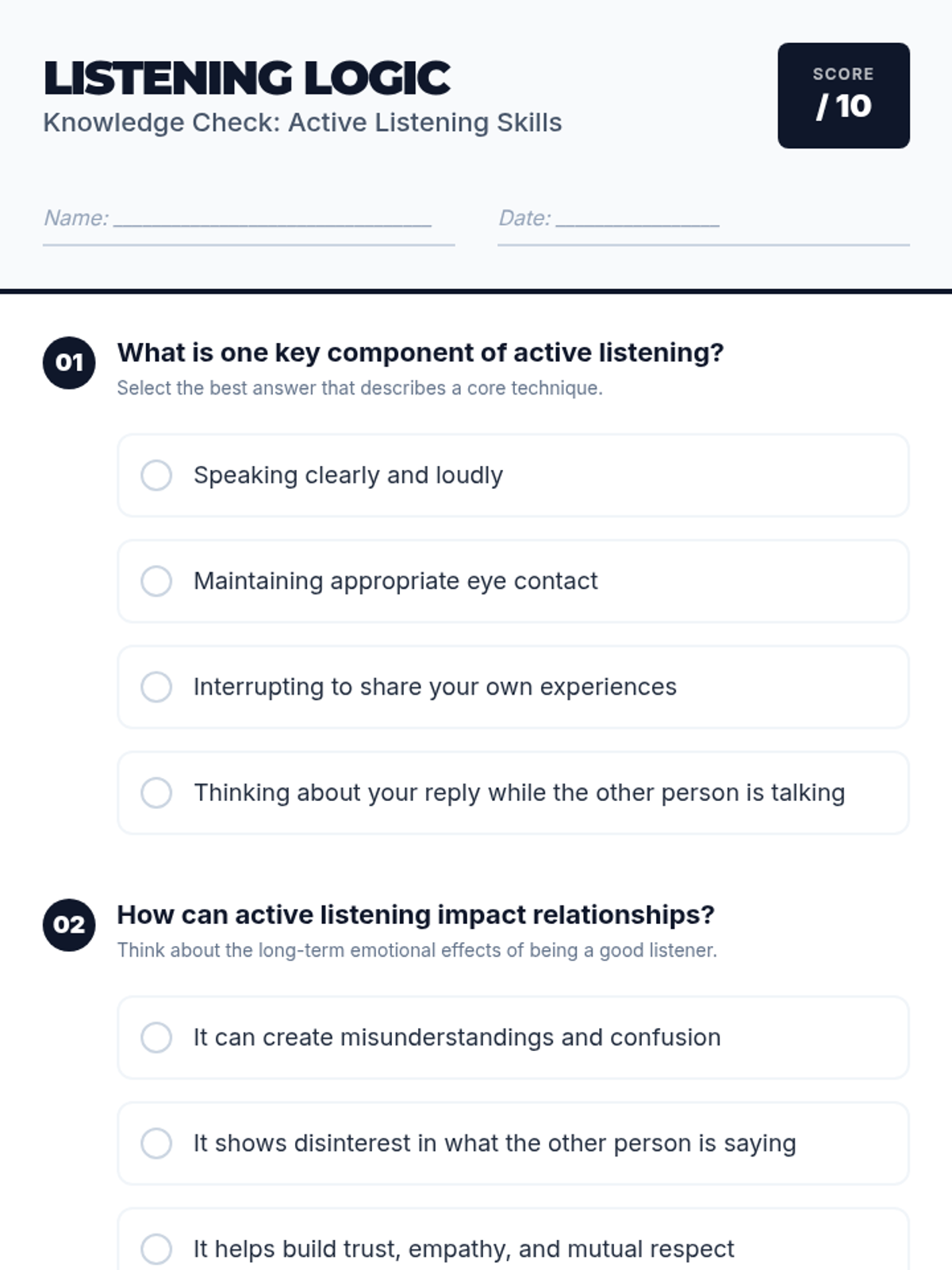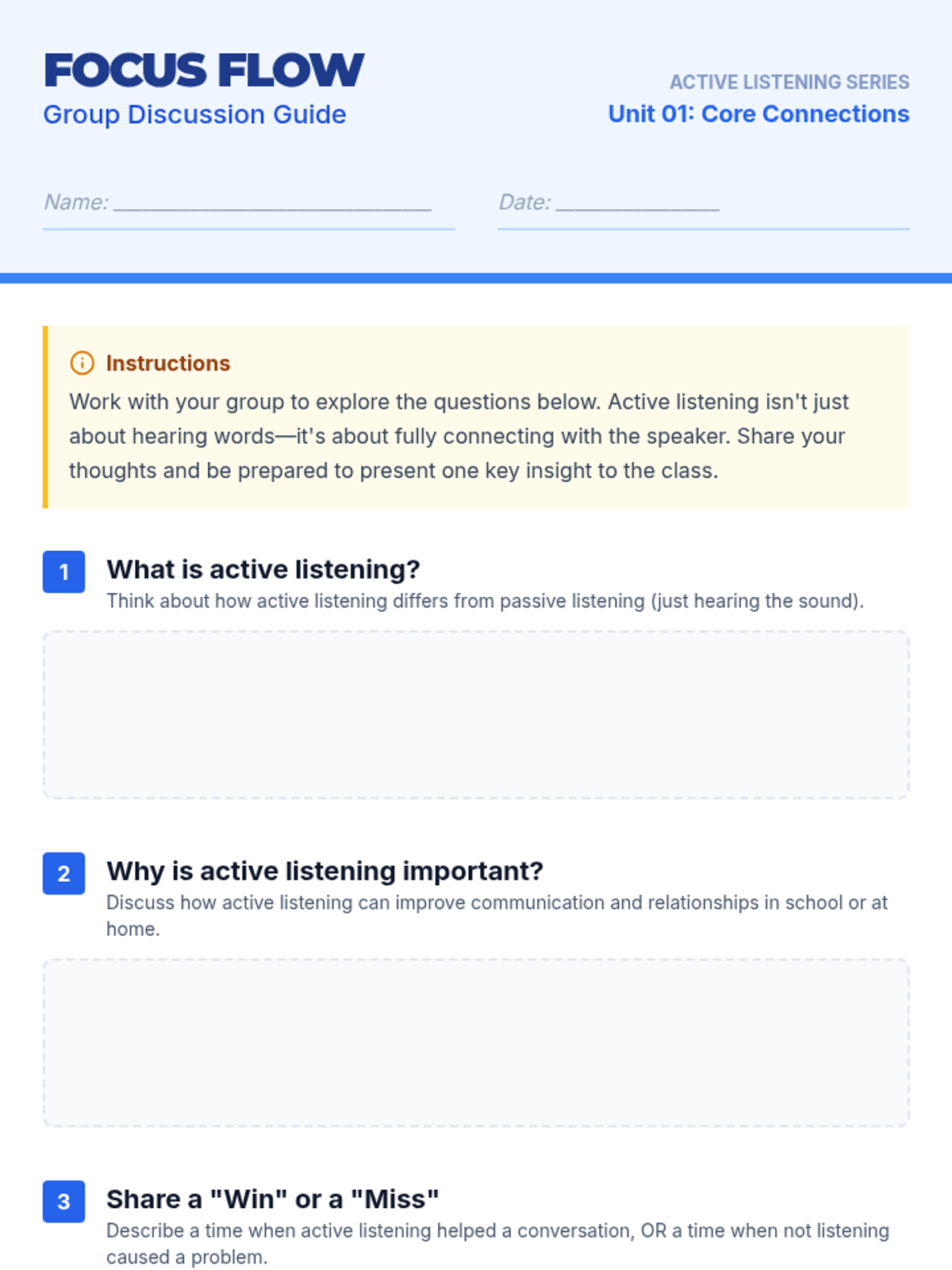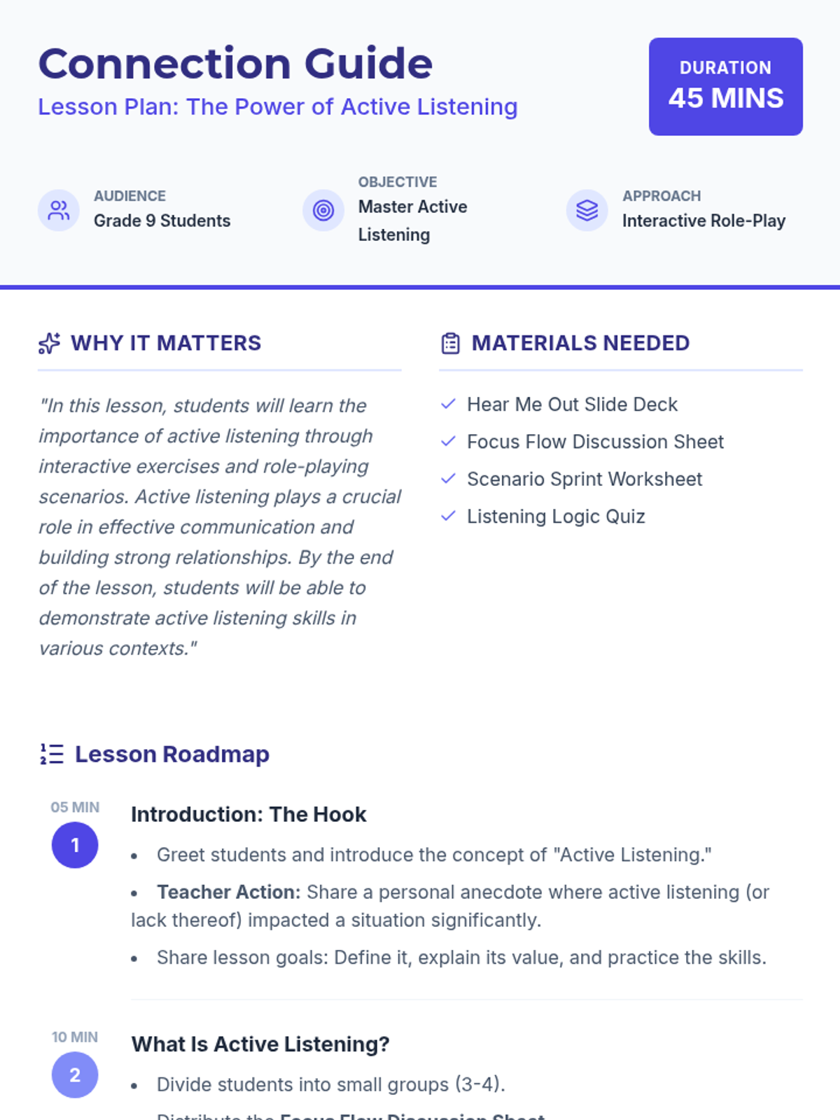 A comprehensive 45-minute lesson for 9th graders on the art of active listening. Students explore communication through guided discussion, role-playing scenarios, and reflective assessments to build stronger interpersonal skills.