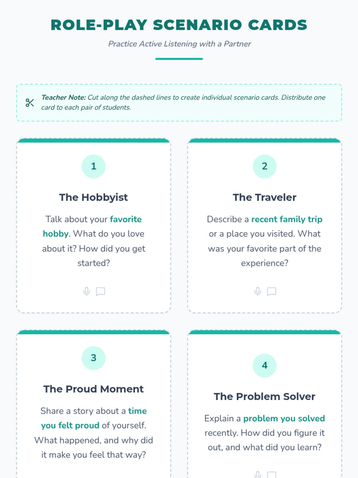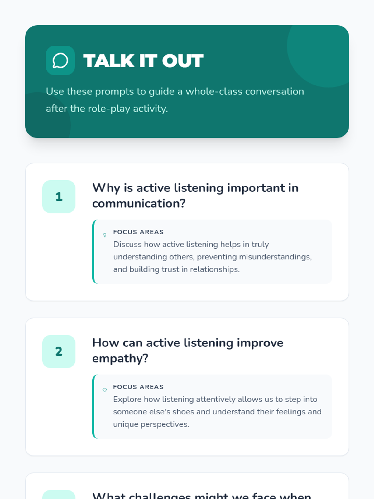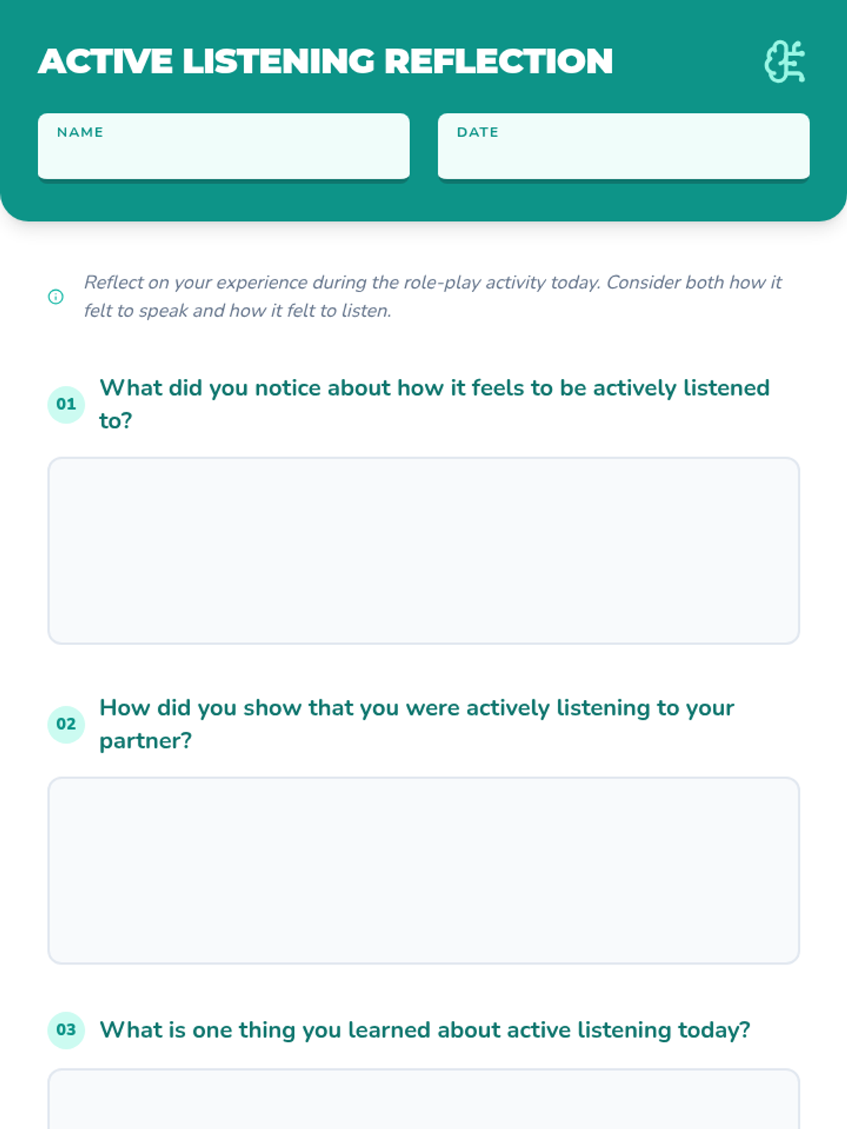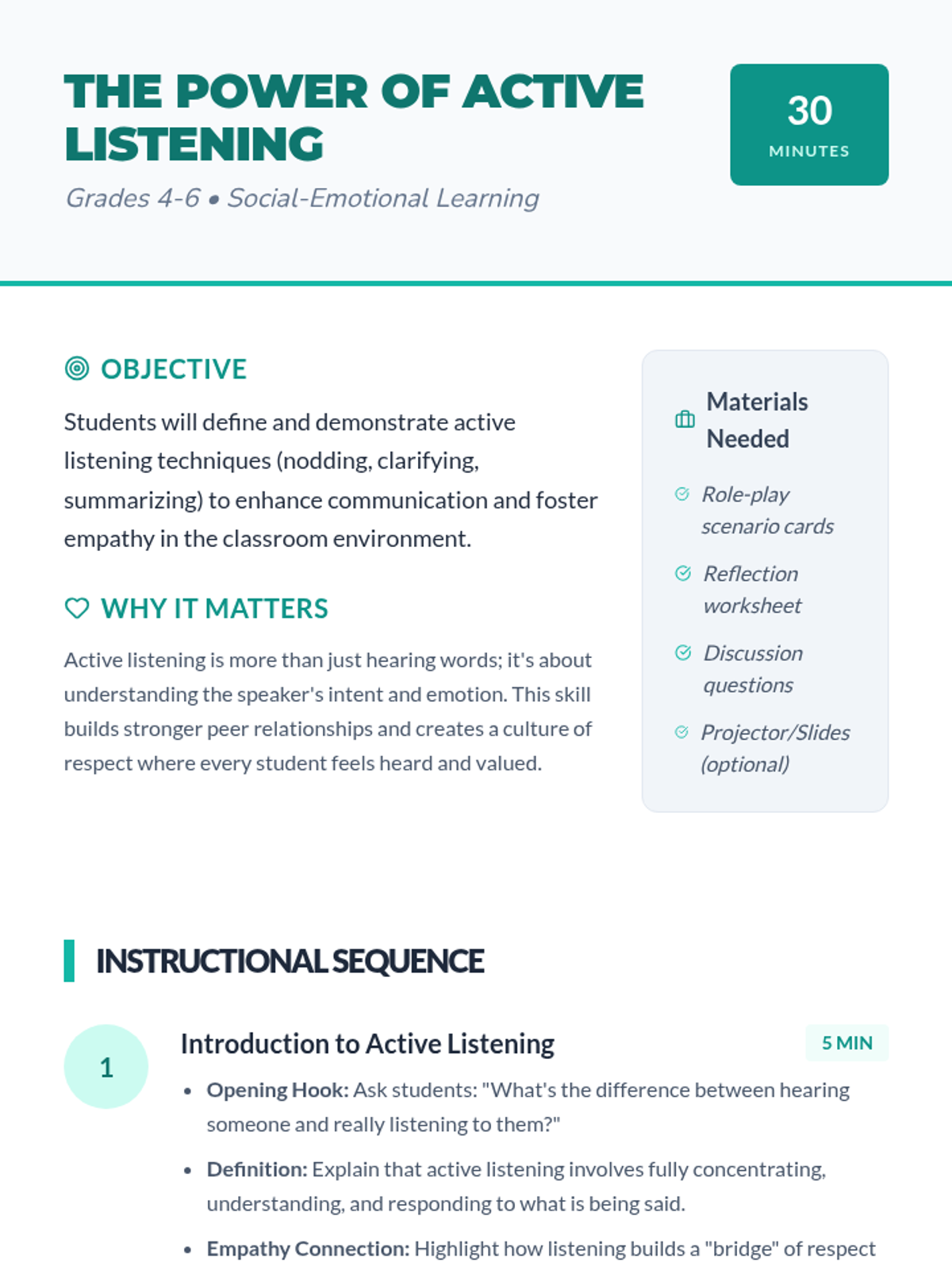 This lesson introduces students to active listening techniques through engaging role-plays and reflective exercises, fostering empathy and effective communication in the classroom.