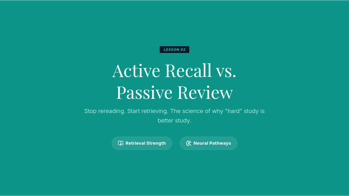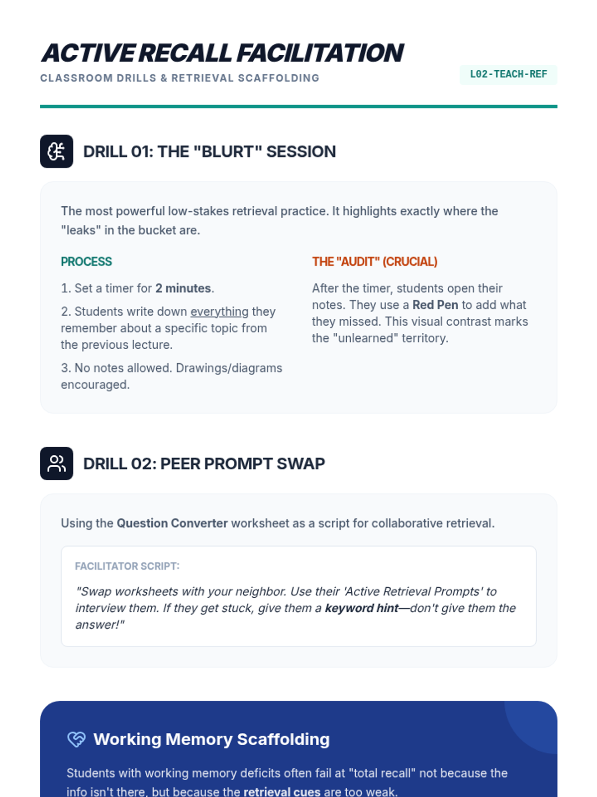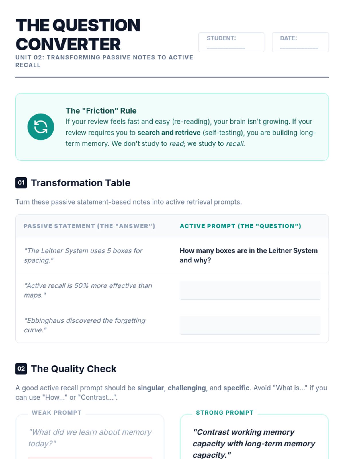 This lesson differentiates between re-reading (passive) and self-testing (active). Students practice converting static notes into question-and-answer pairs designed to trigger memory retrieval efforts.