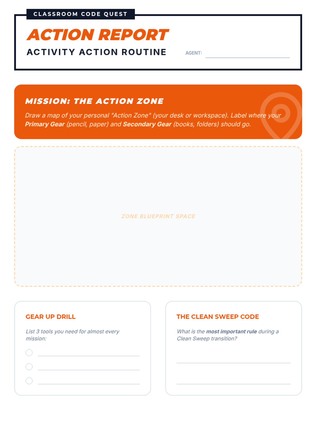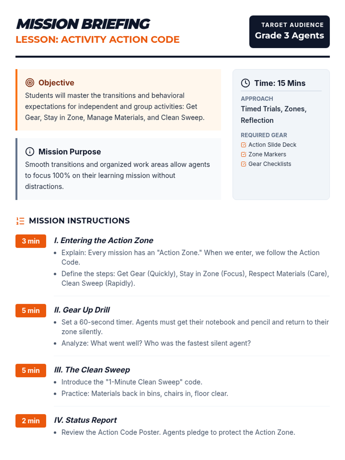 Focuses on the transitions and behavioral expectations during independent and group activities, emphasizing material management and focus.