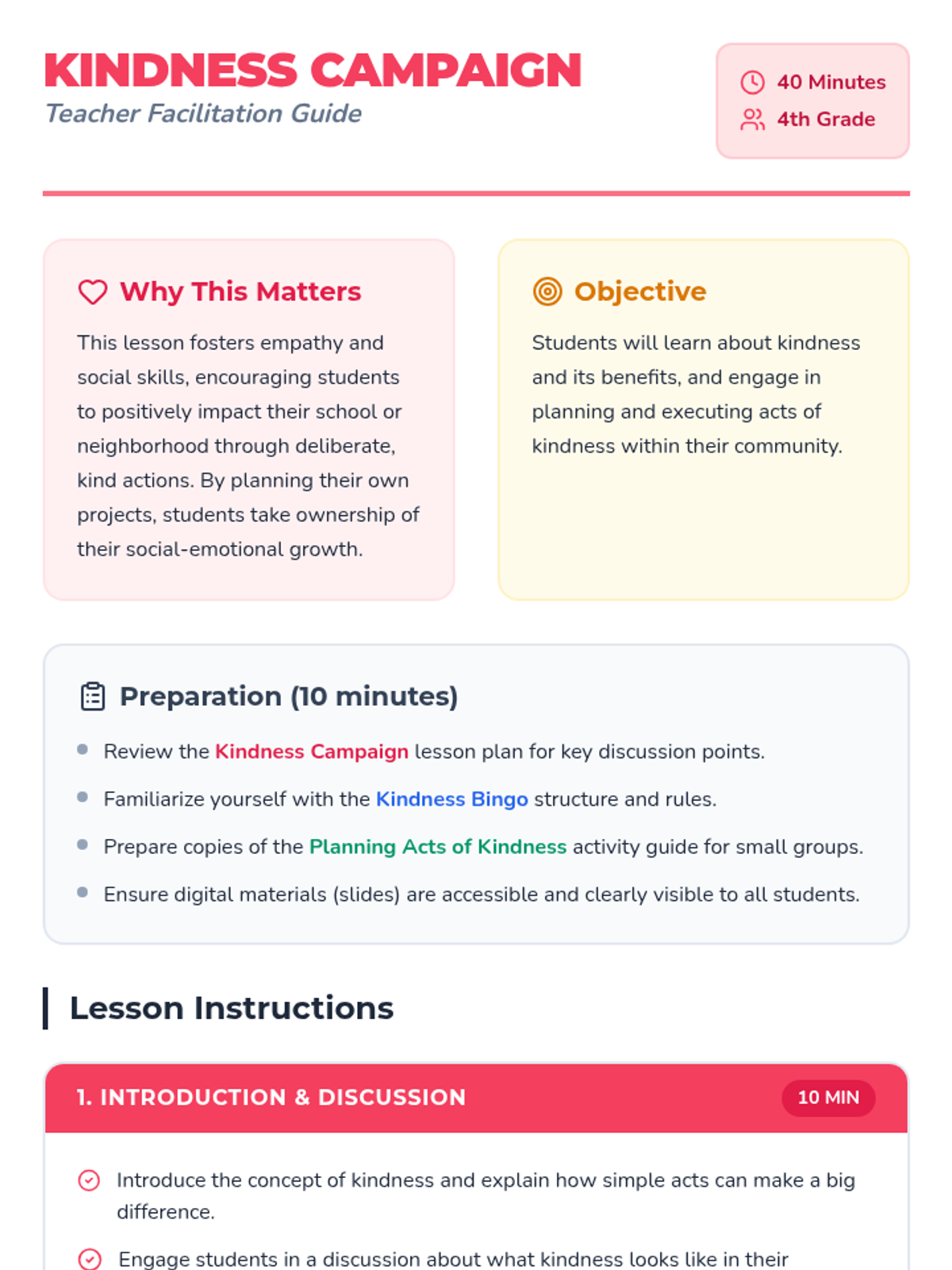 A fast-paced, 10-minute social-emotional learning lesson focused on building self-confidence through self-acceptance and kindness toward others. Students define self-esteem and set immediate goals for personal growth and peer acceptance.