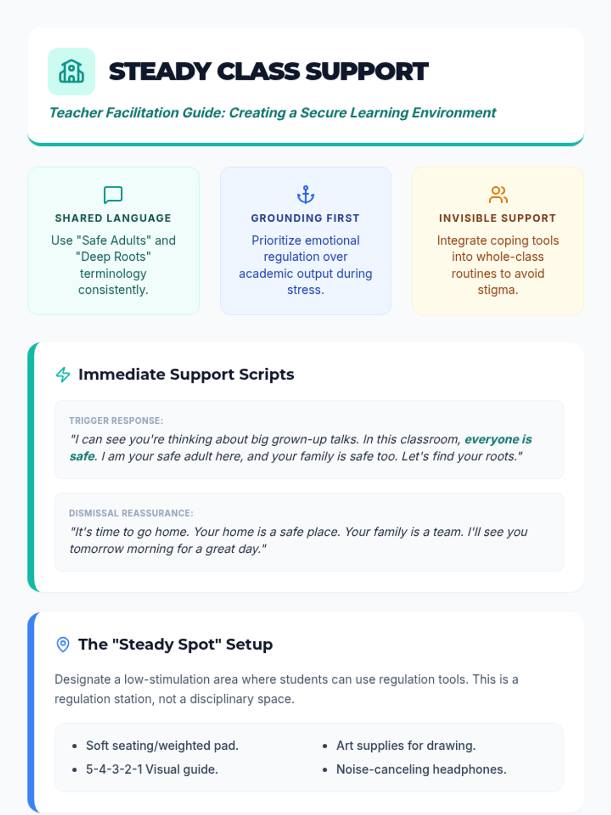 A comprehensive support pack designed for 1st grade students experiencing anxiety about family safety, focusing on grounding, reassurance, and emotional regulation.