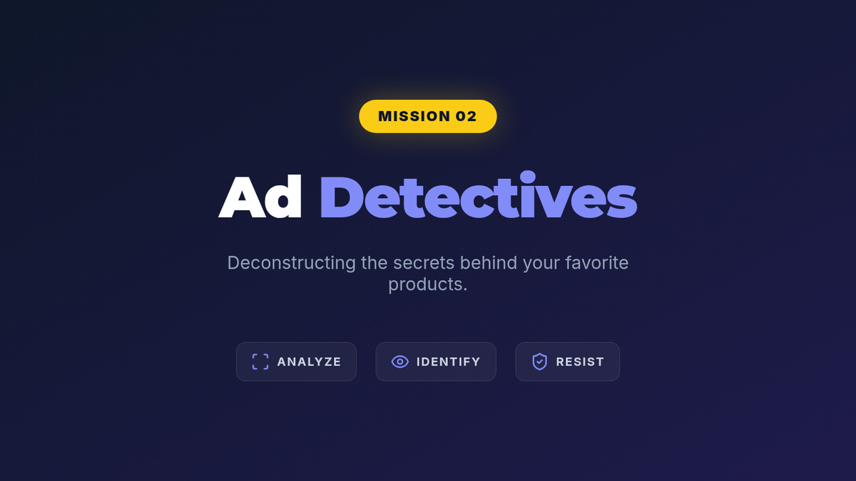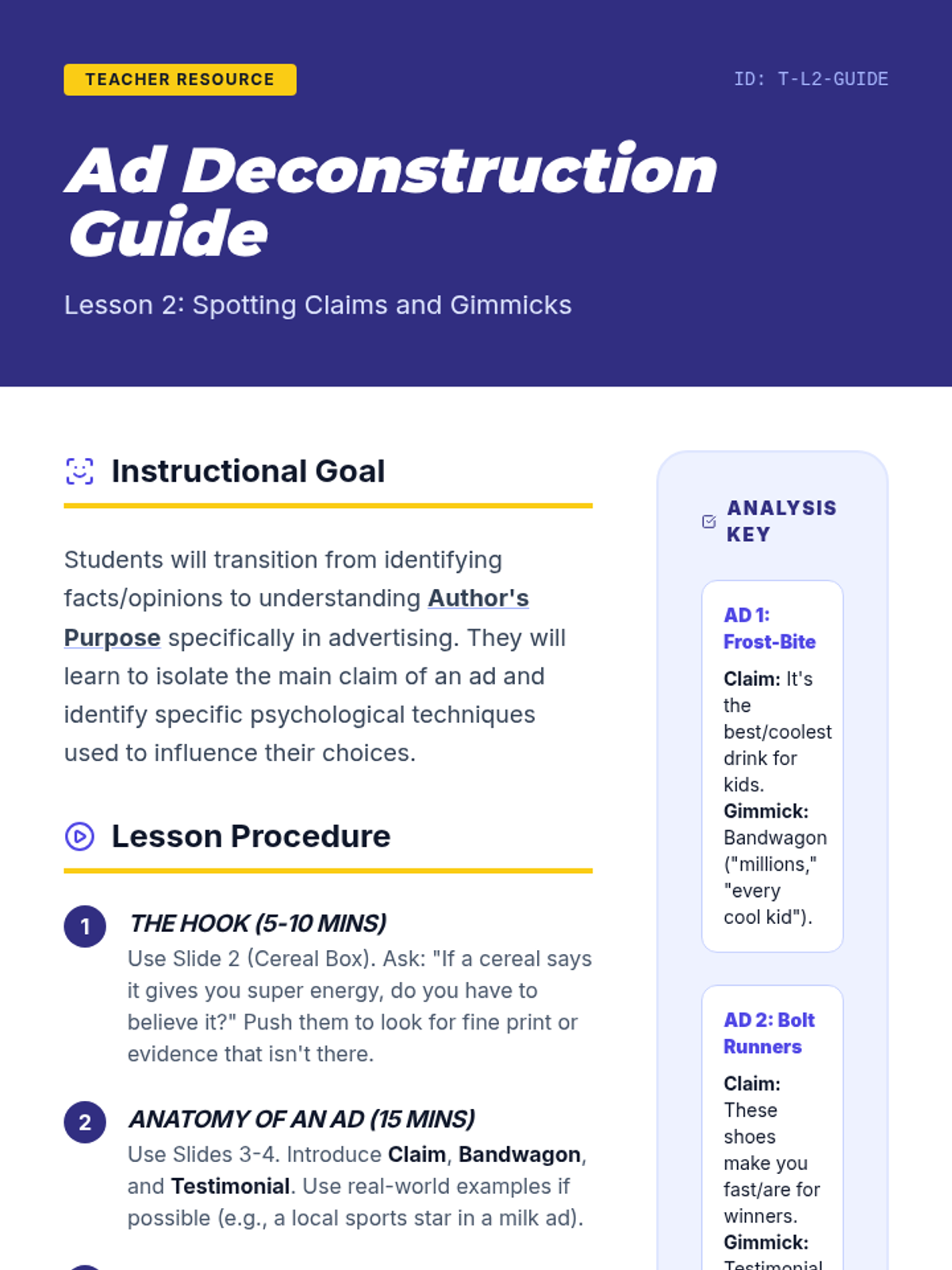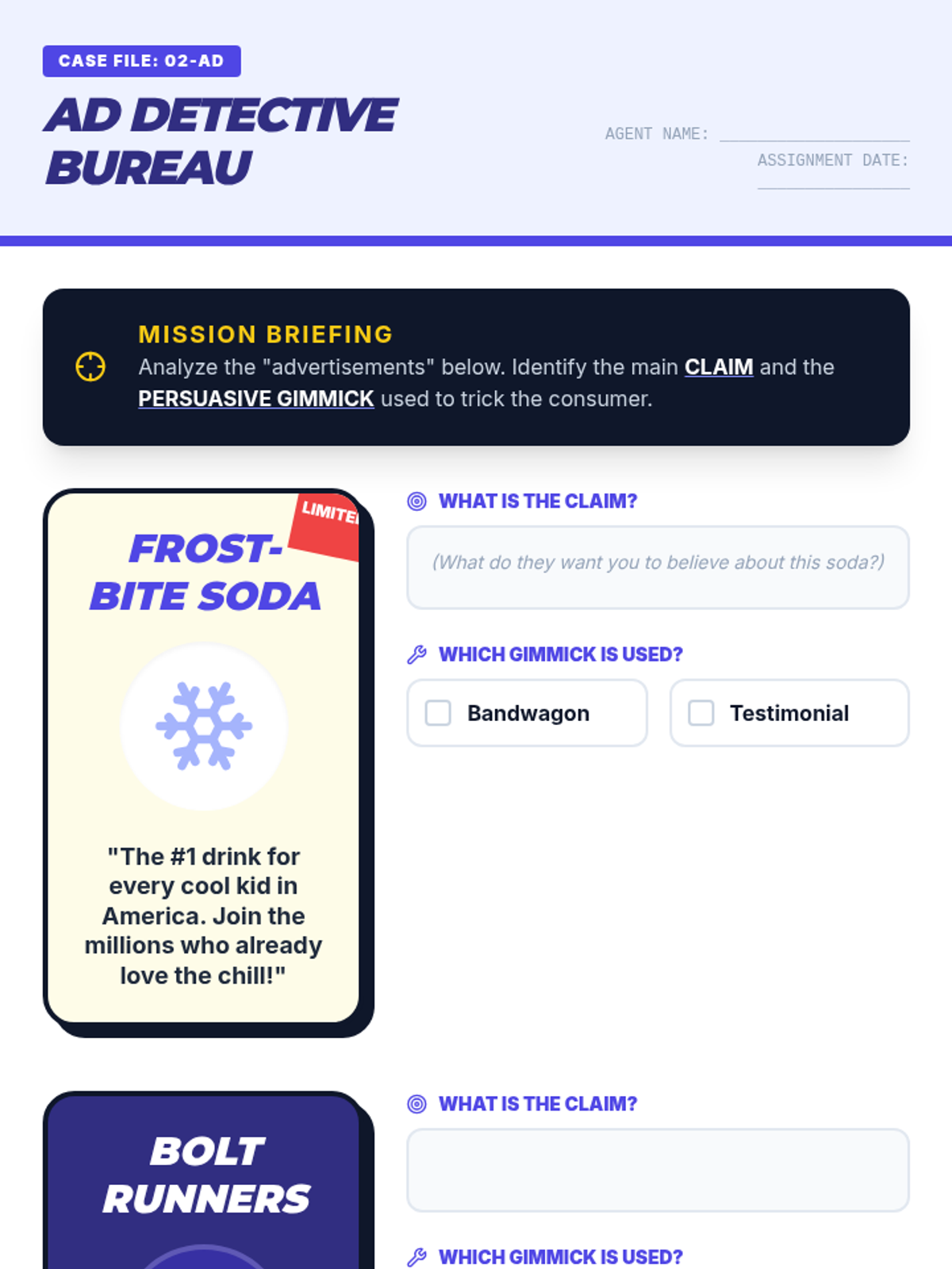 Students deconstruct print advertisements to identify claims and common persuasive gimmicks like celebrity endorsements and bandwagoning.