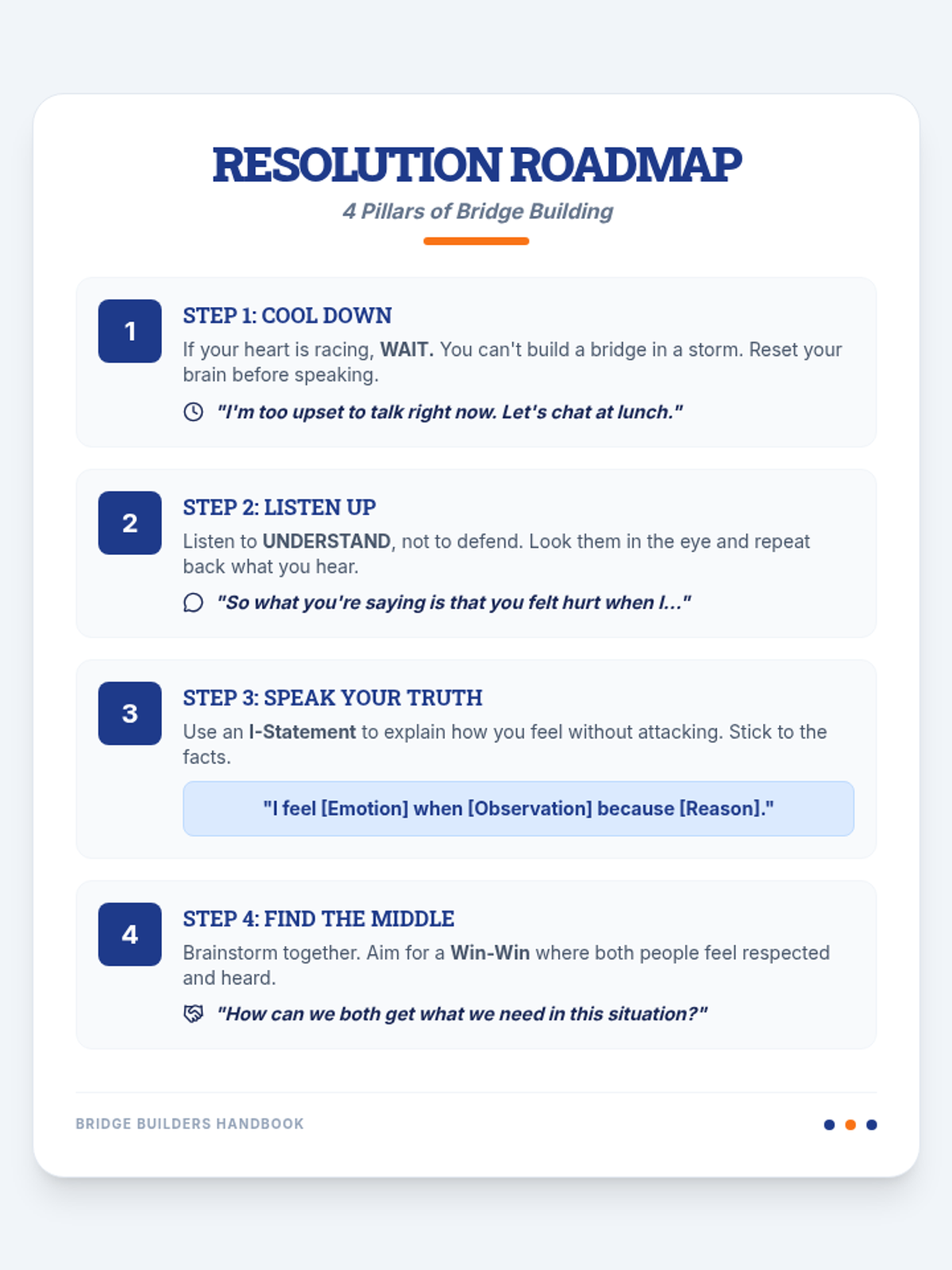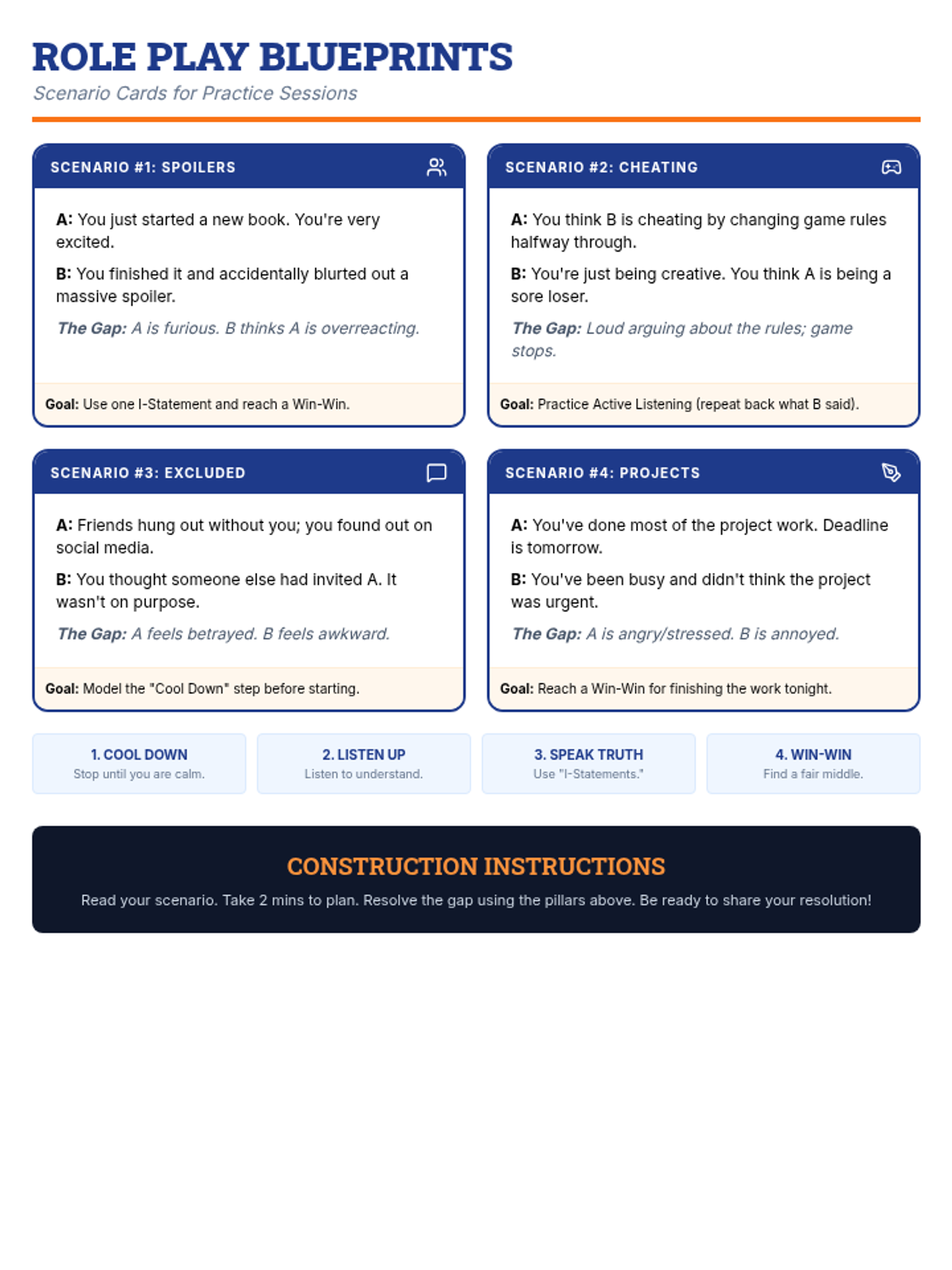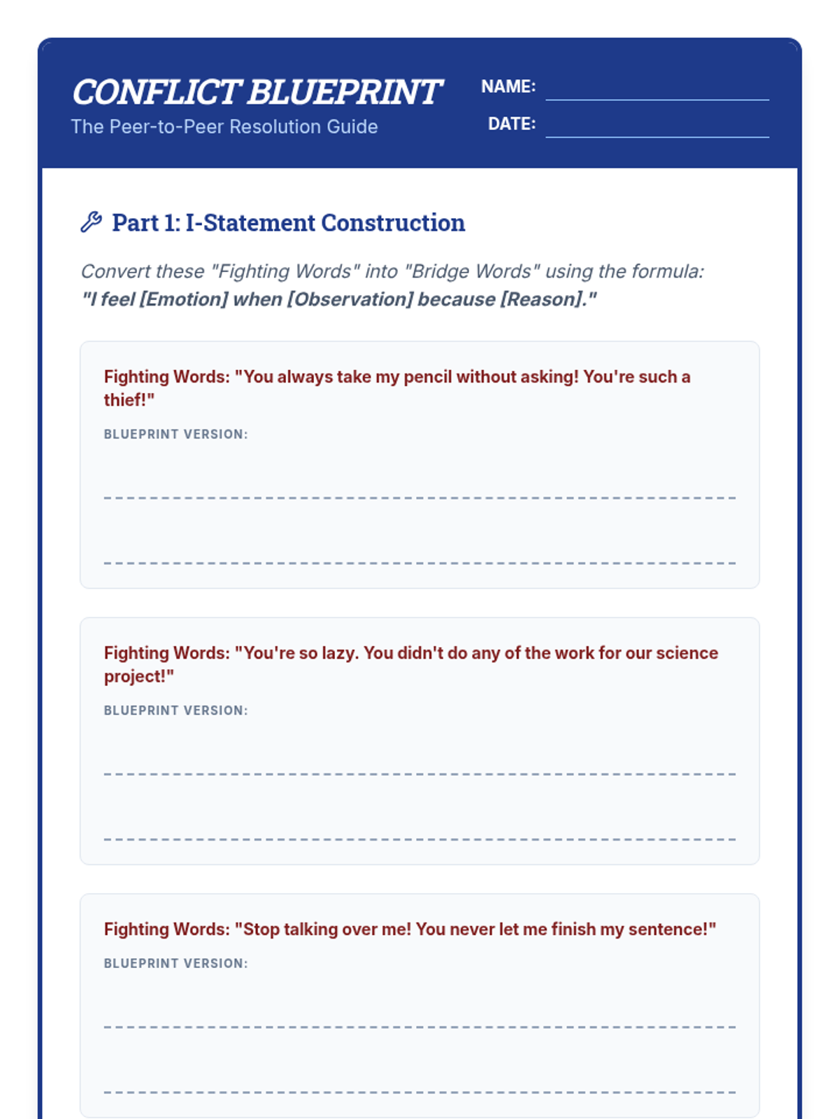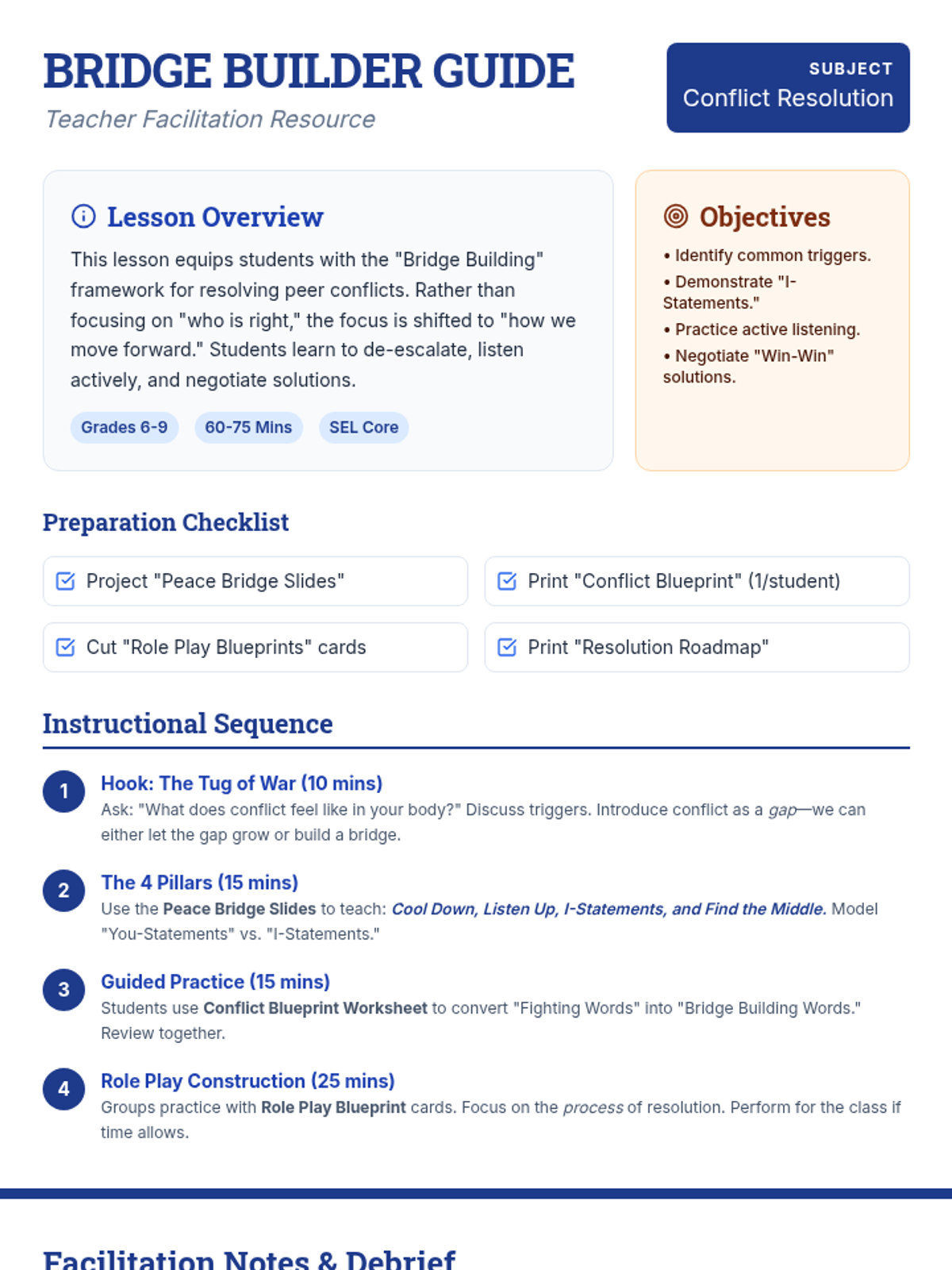 A comprehensive lesson on resolving peer-to-peer conflicts using structured communication strategies like I-statements, active listening, and win-win negotiation. Students will analyze real-world scenarios and practice resolution through role-play.