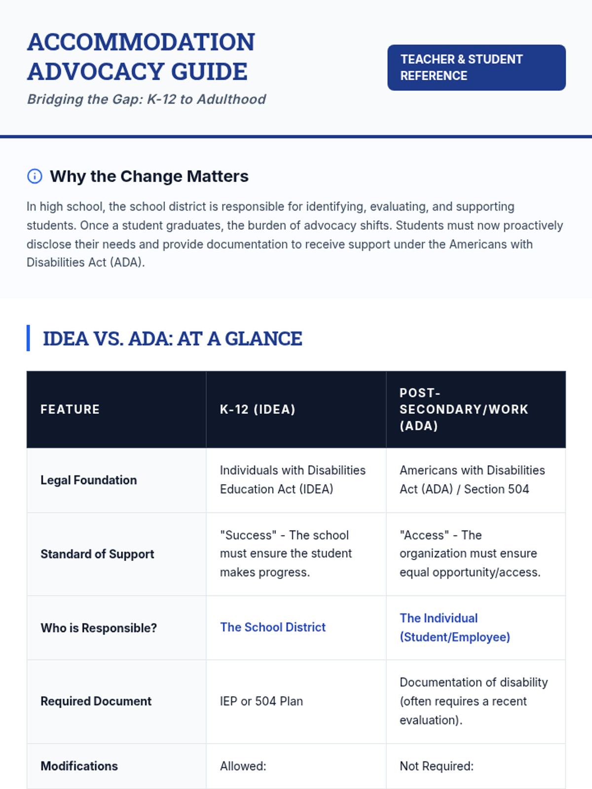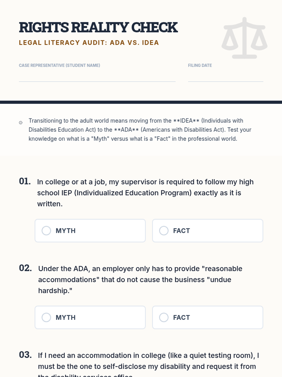 Students transition from K-12 IDEA protections to ADA rights in the adult world, researching how to request reasonable accommodations in college and the workplace.