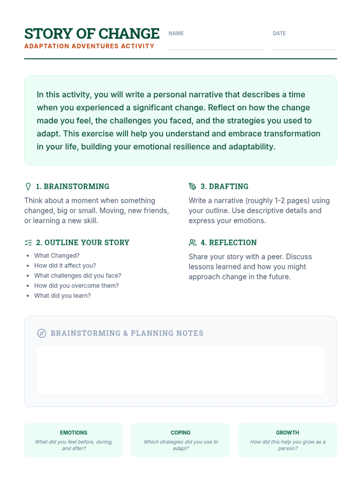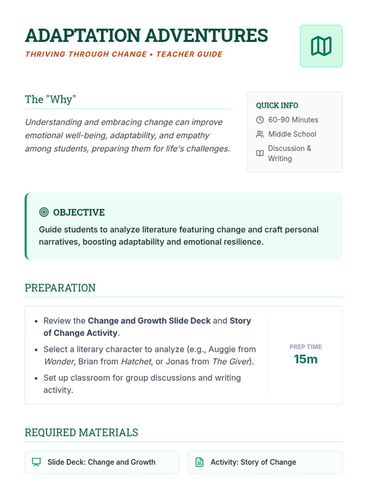 A middle school lesson focused on identifying and embracing change through literature analysis and personal storytelling to build emotional resilience.