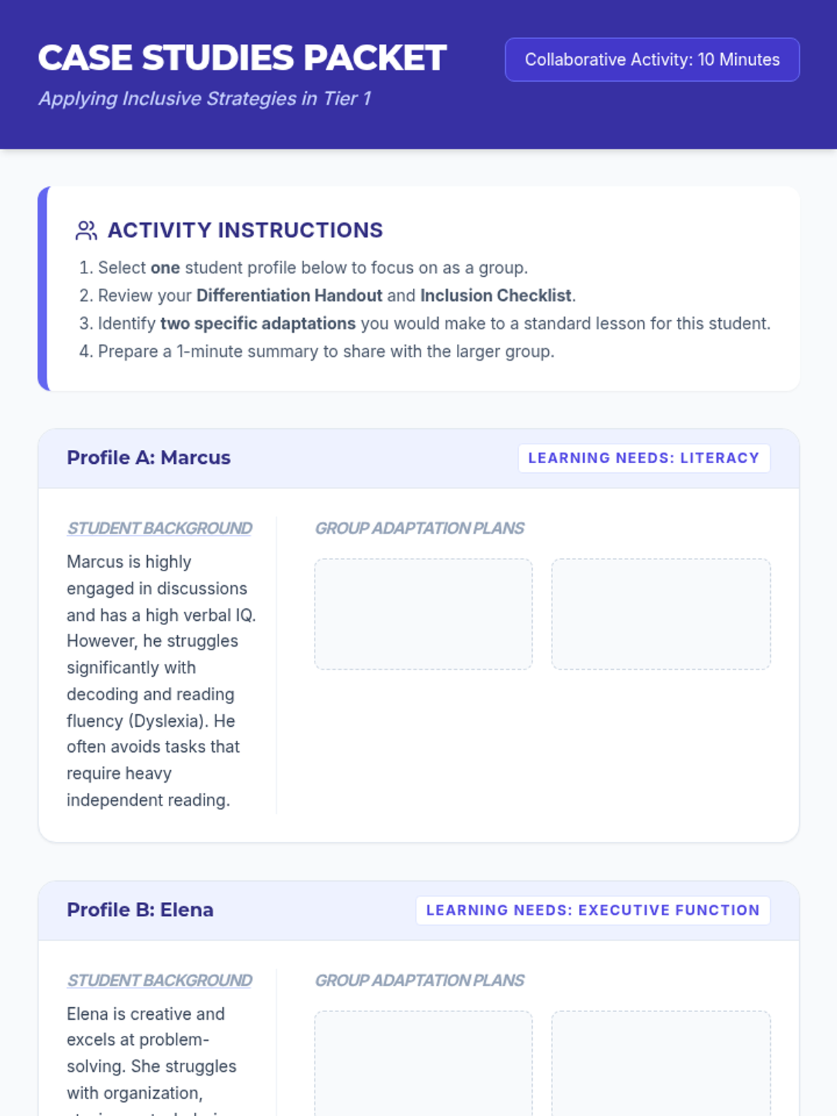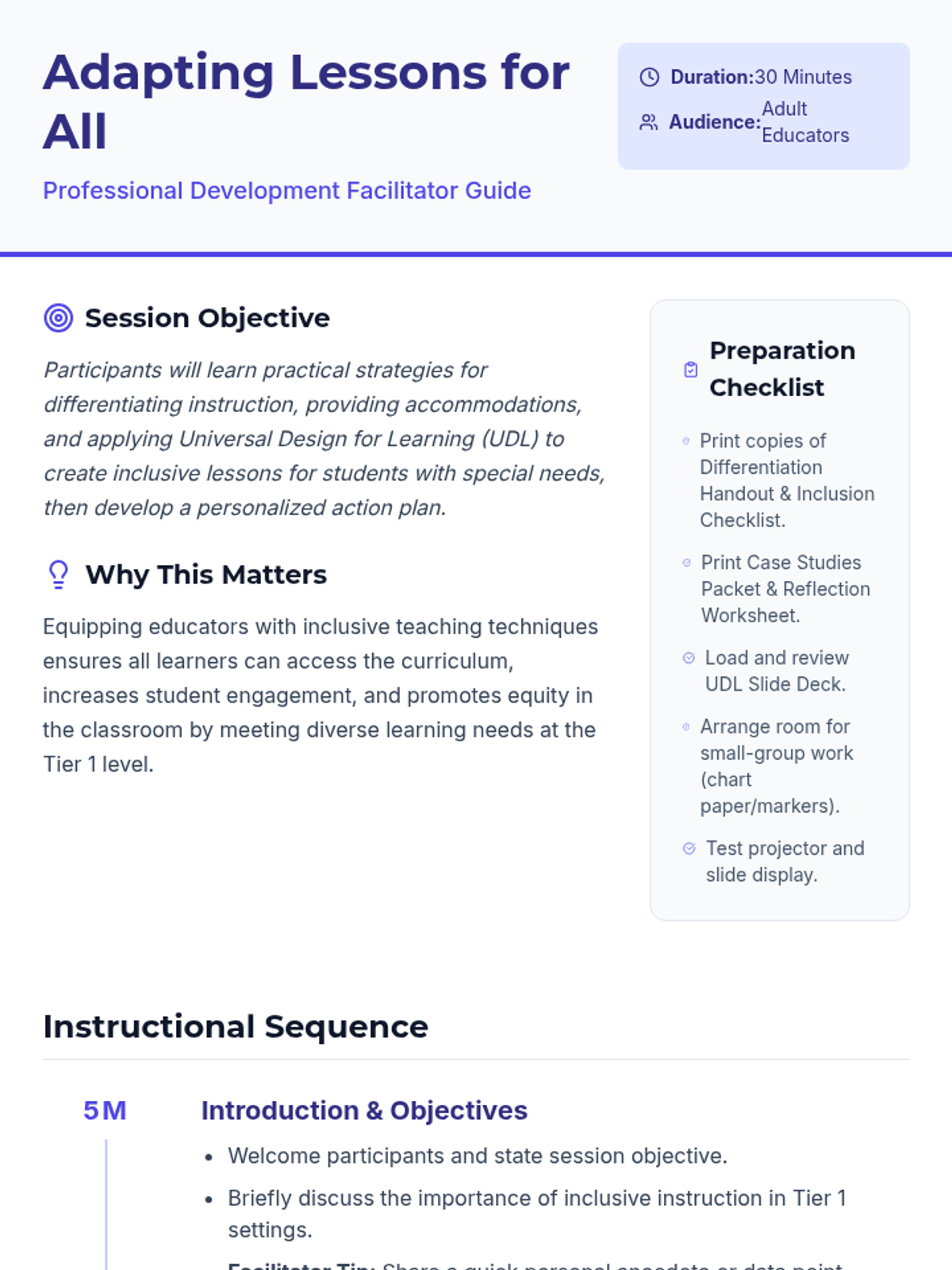 A 30-minute professional development session for adult educators focused on inclusive lesson design, practical accommodations, and Universal Design for Learning (UDL) principles. Participants will explore strategies for supporting students with special needs and develop a personalized action plan.