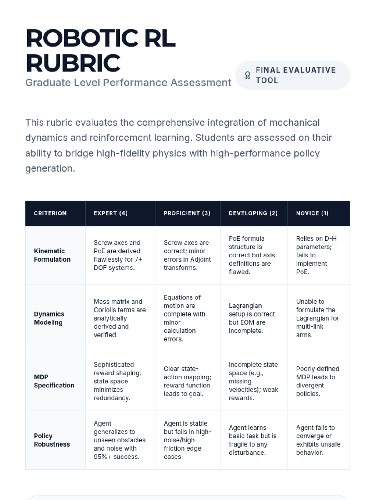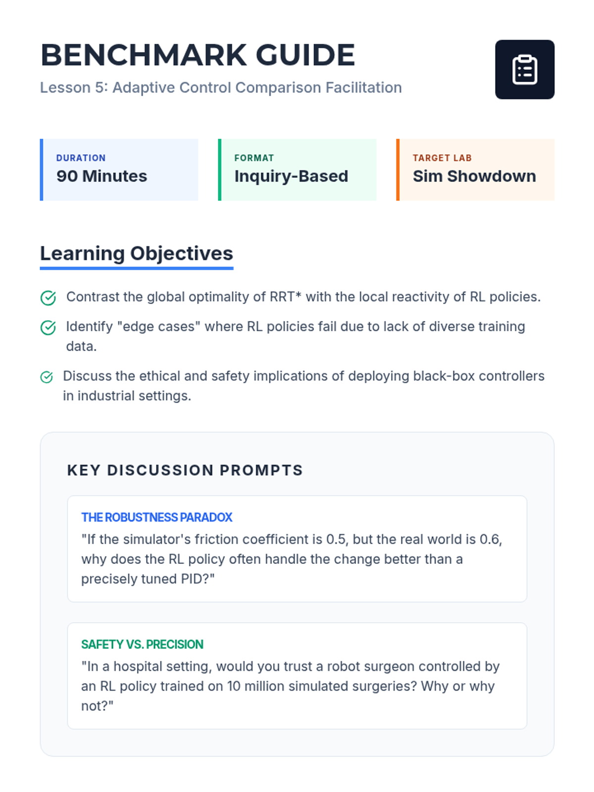 A comparison of traditional path planning (RRT/A*) with RL policies. Students analyze robustness, safety, and reliability in unstructured industrial environments.