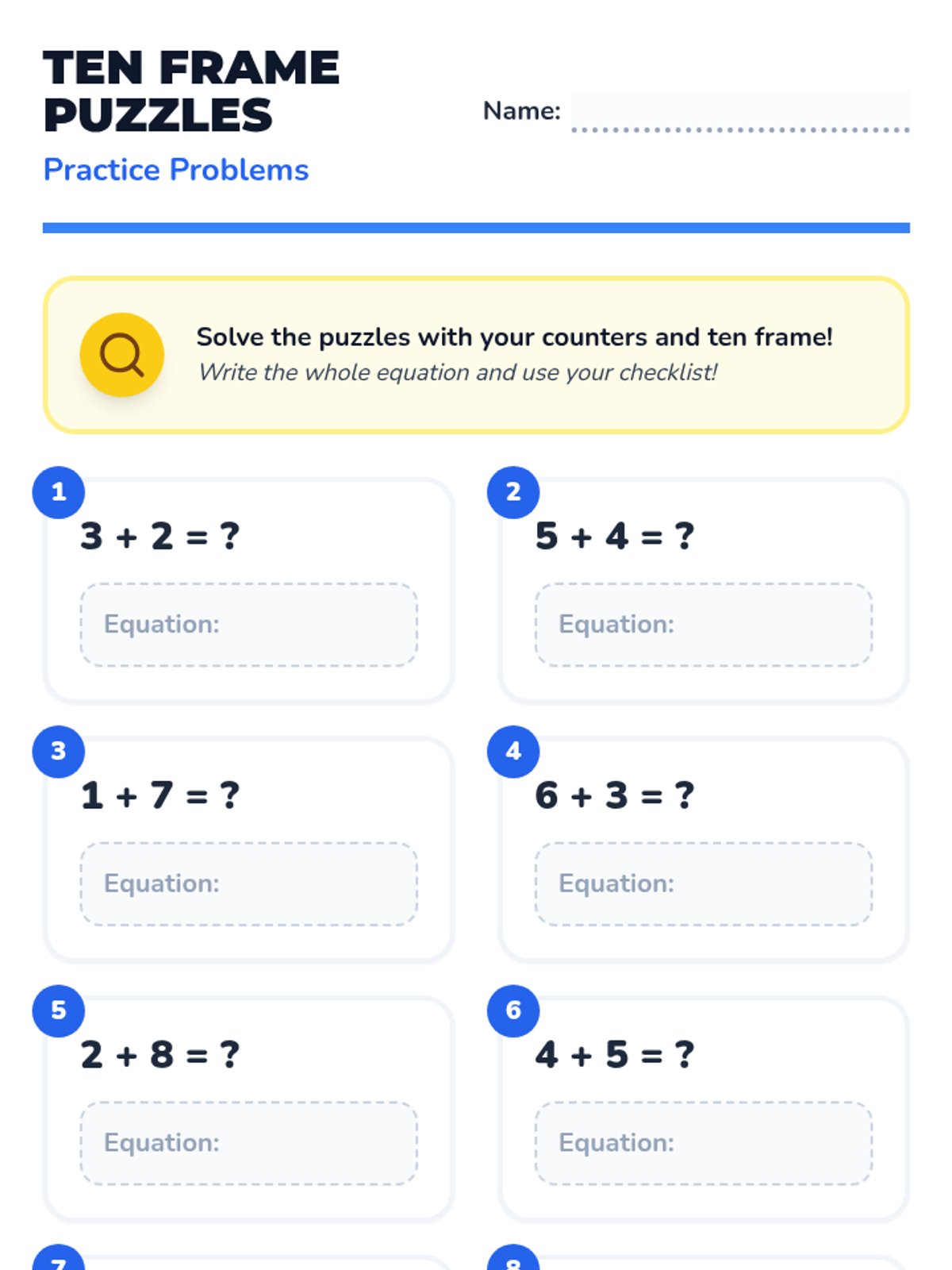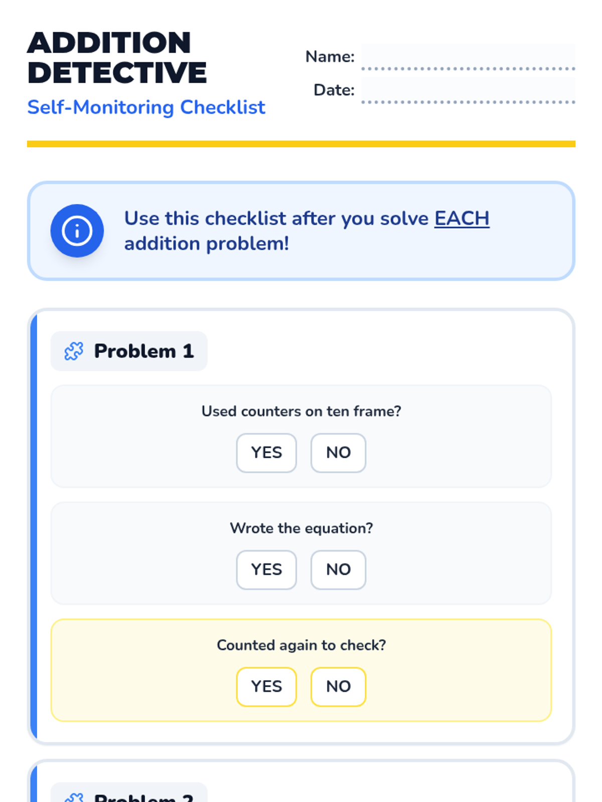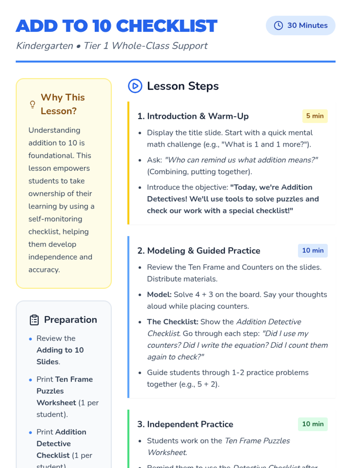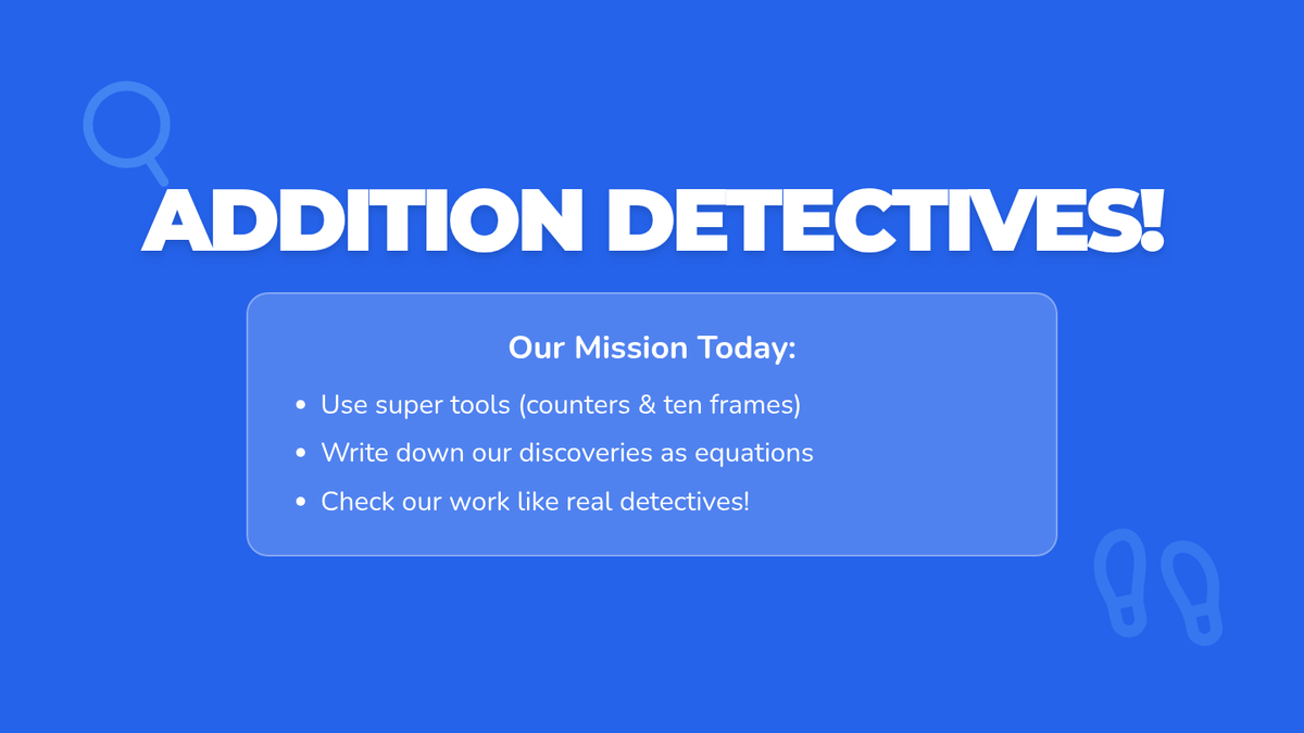 A Kindergarten lesson focused on adding within 10 using counters and ten frames, featuring a self-monitoring checklist to build independence and accuracy. Students act as 'Addition Detectives' to solve puzzles and verify their work.