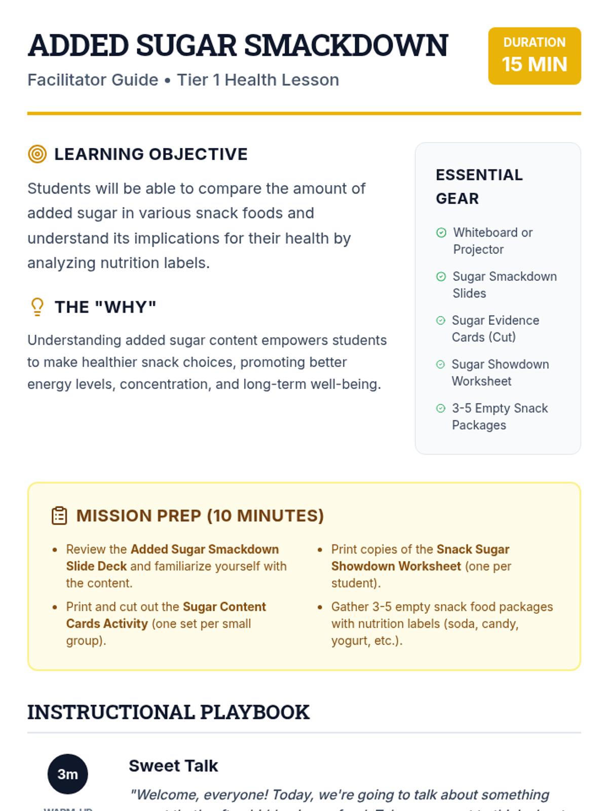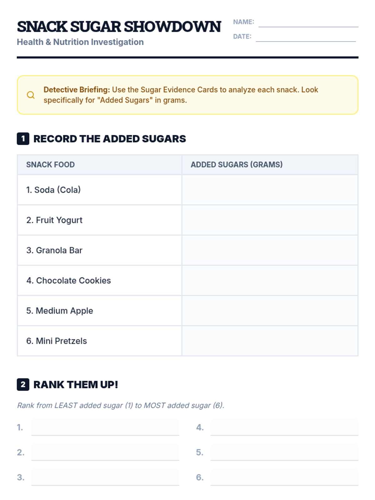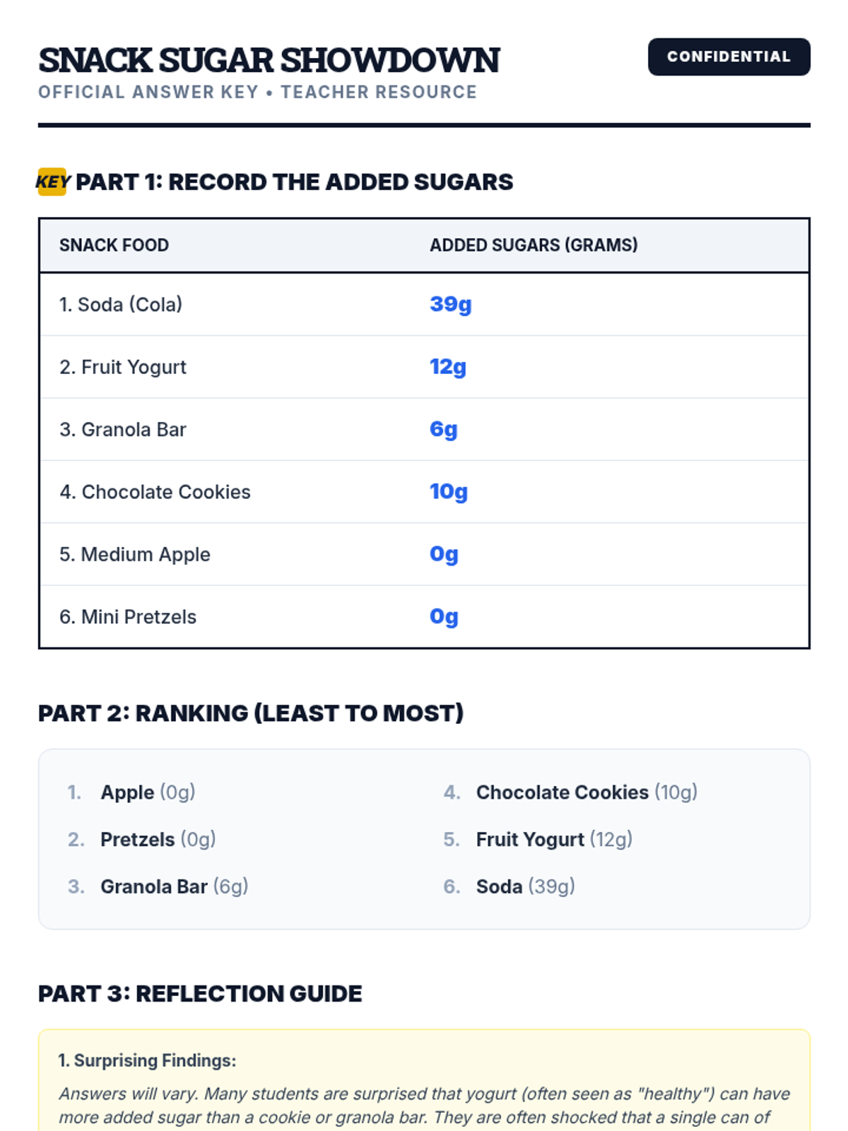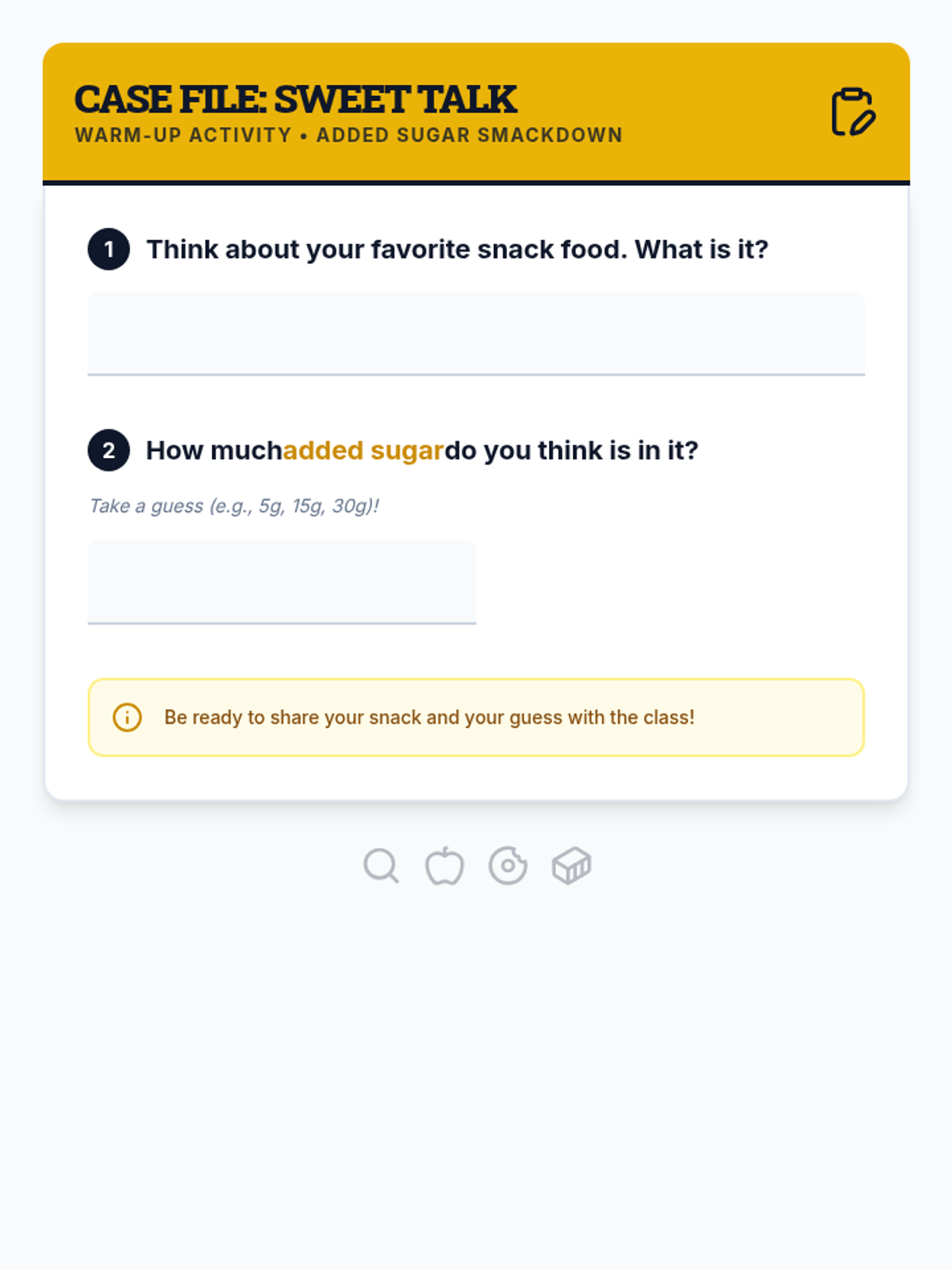 A 15-minute interactive lesson for 10th graders to uncover hidden added sugars in common snacks and make healthier dietary choices.