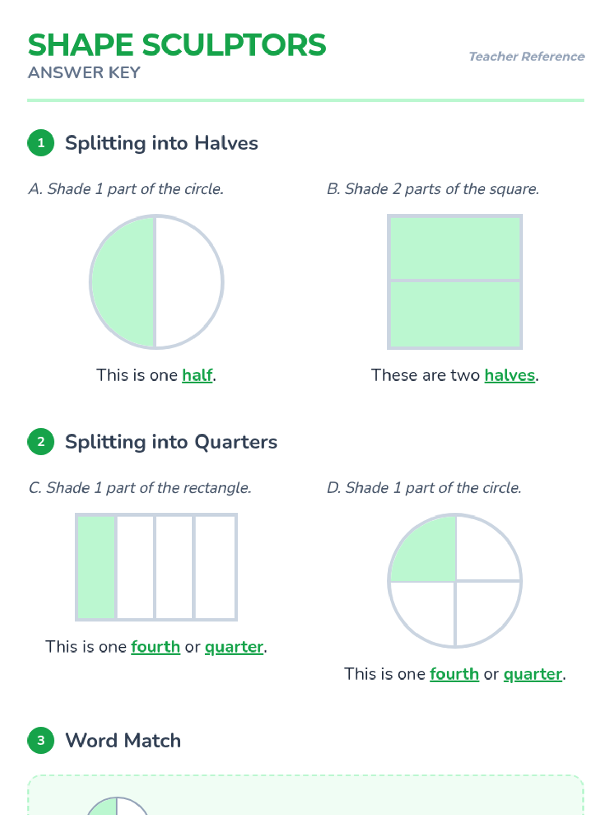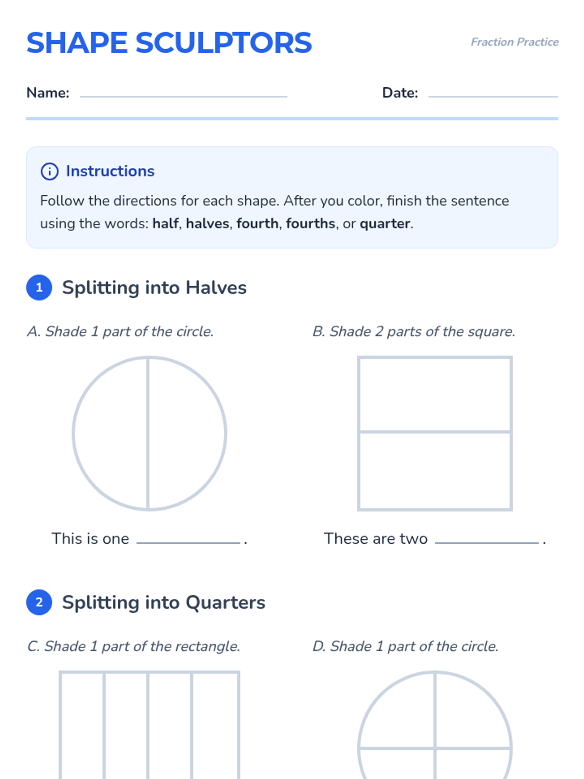 A first-grade lesson focused on partitioning shapes and identifying equal parts as halves and fourths (quarters). Students will practice shading partitioned shapes and completing descriptive sentences using fraction vocabulary.