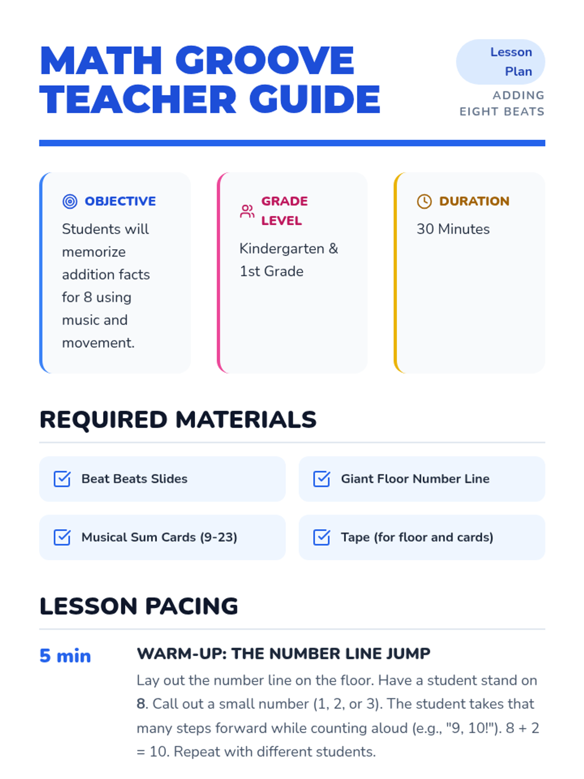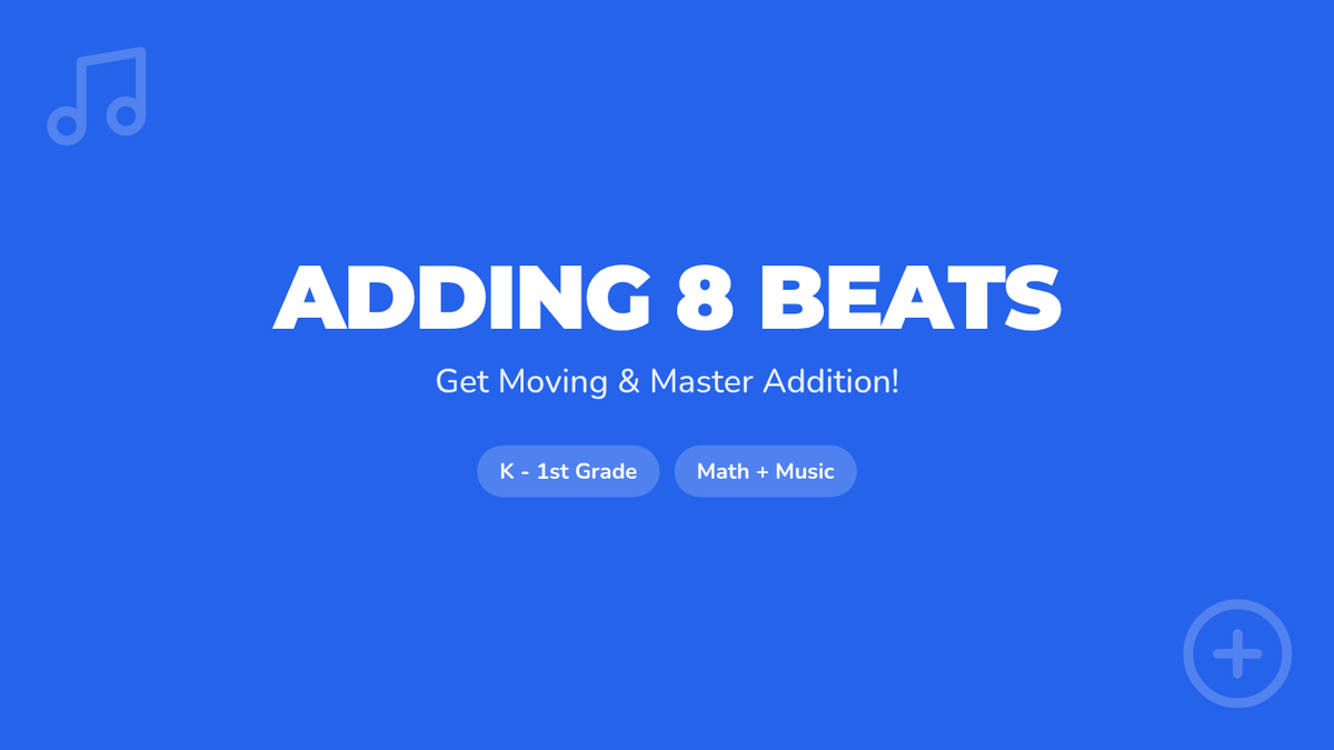 A high-energy, movement-based lesson for Kindergarten and 1st Grade students to master addition facts for the number 8 using the 'Adding 8 Song' and musical games.