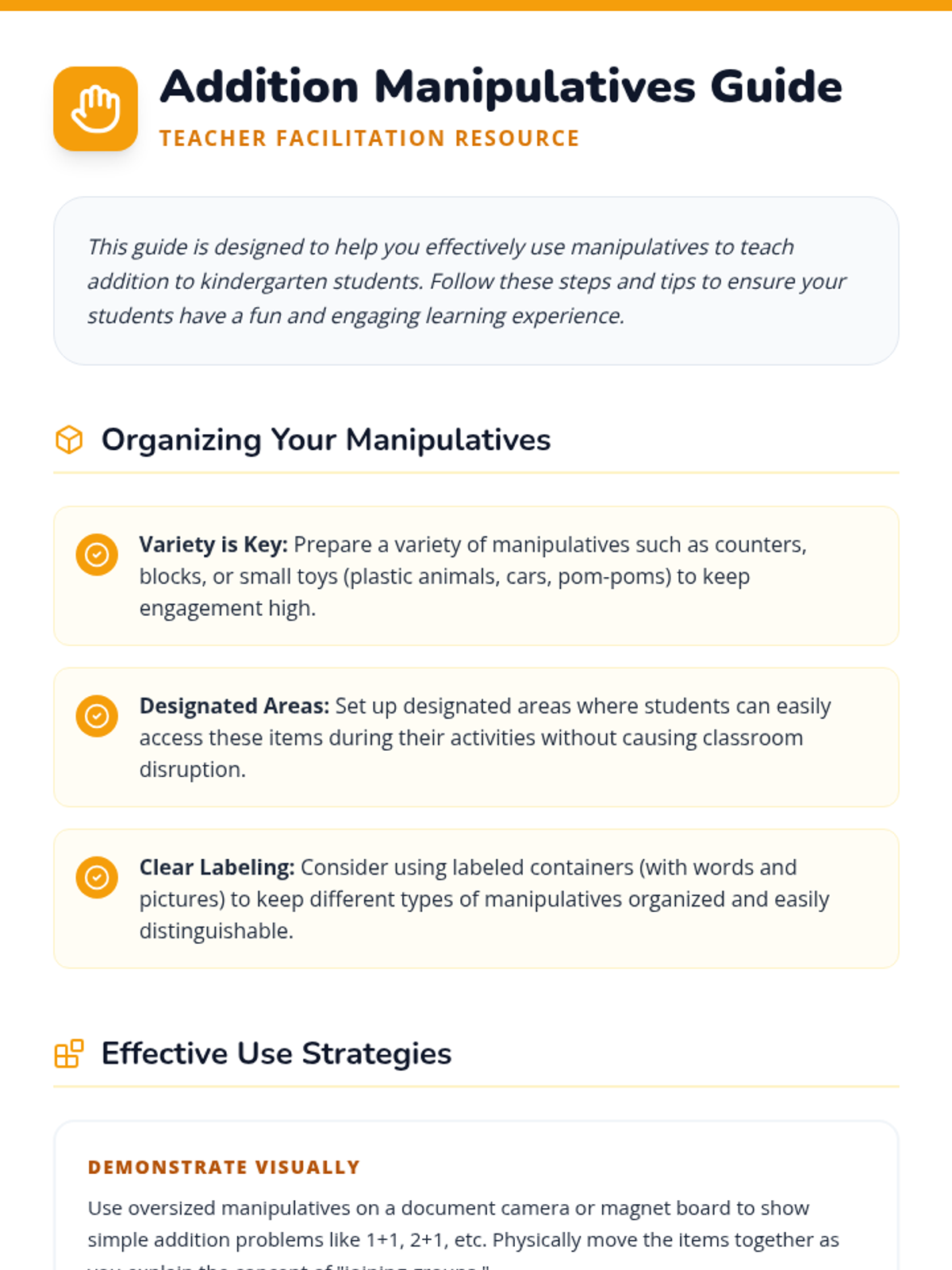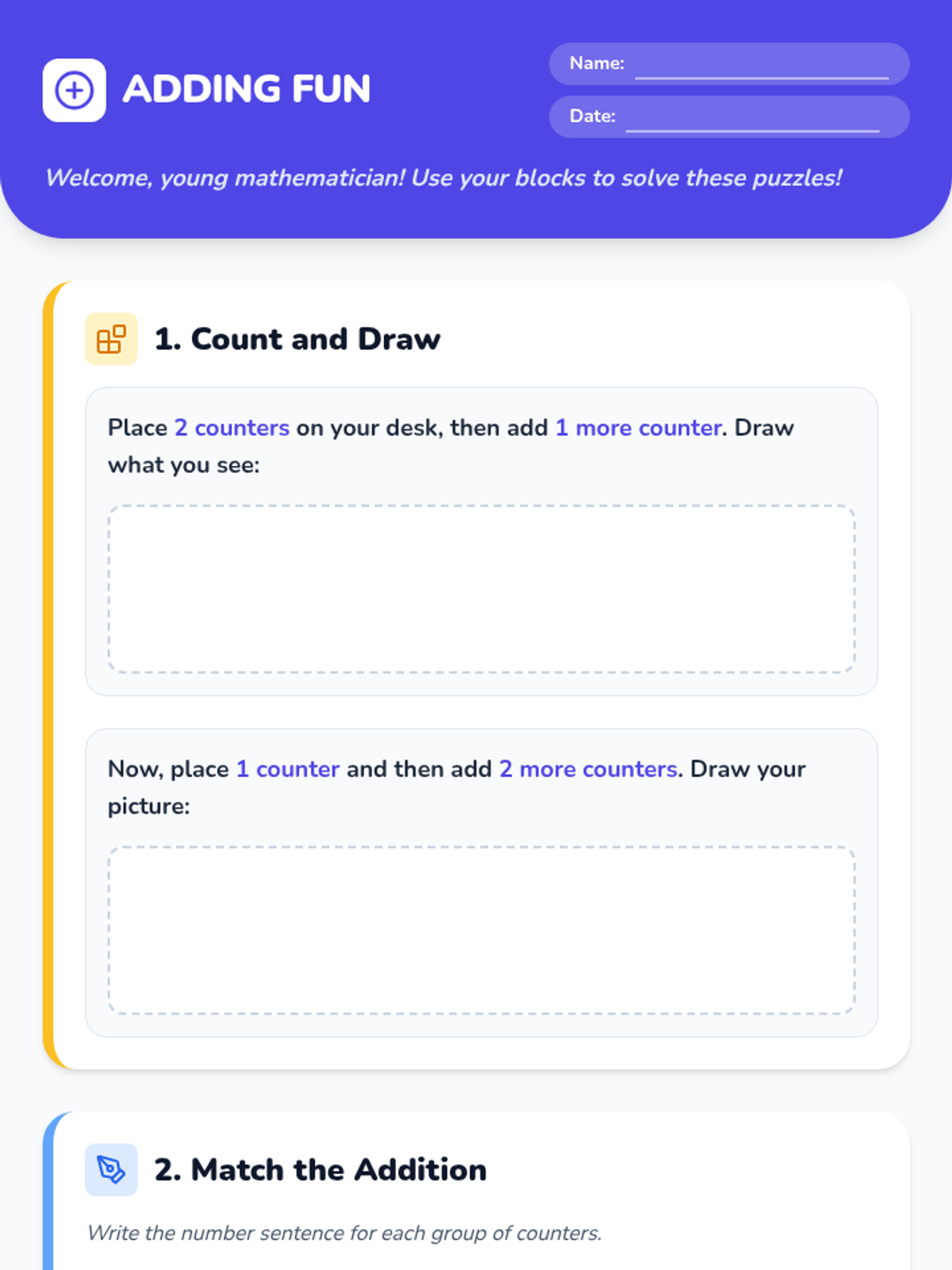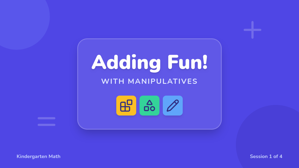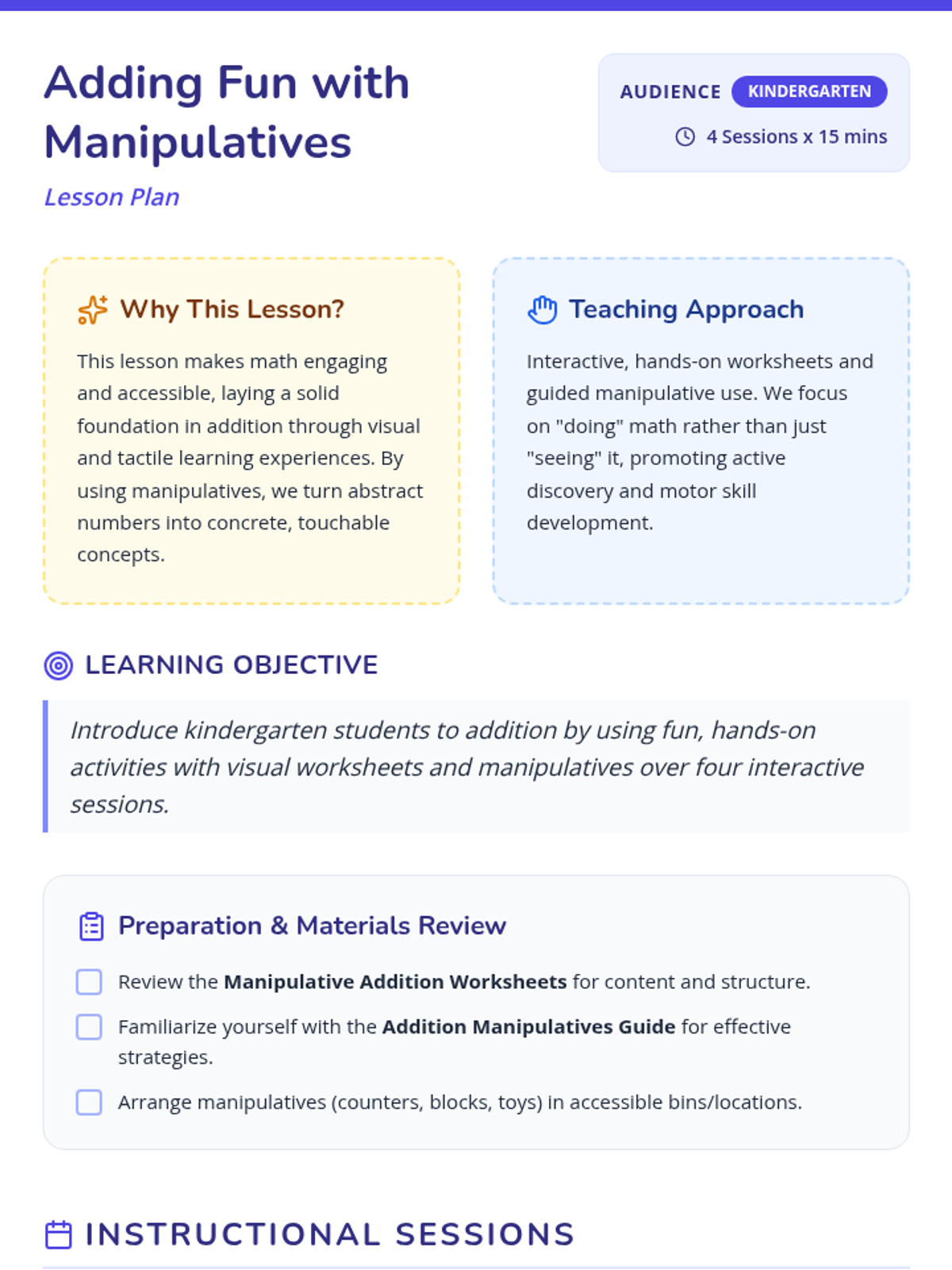 A kindergarten math lesson introducing addition through hands-on play with manipulatives like blocks and counters. Over four 15-minute sessions, students build foundational math skills through interactive worksheets and collaborative activities.