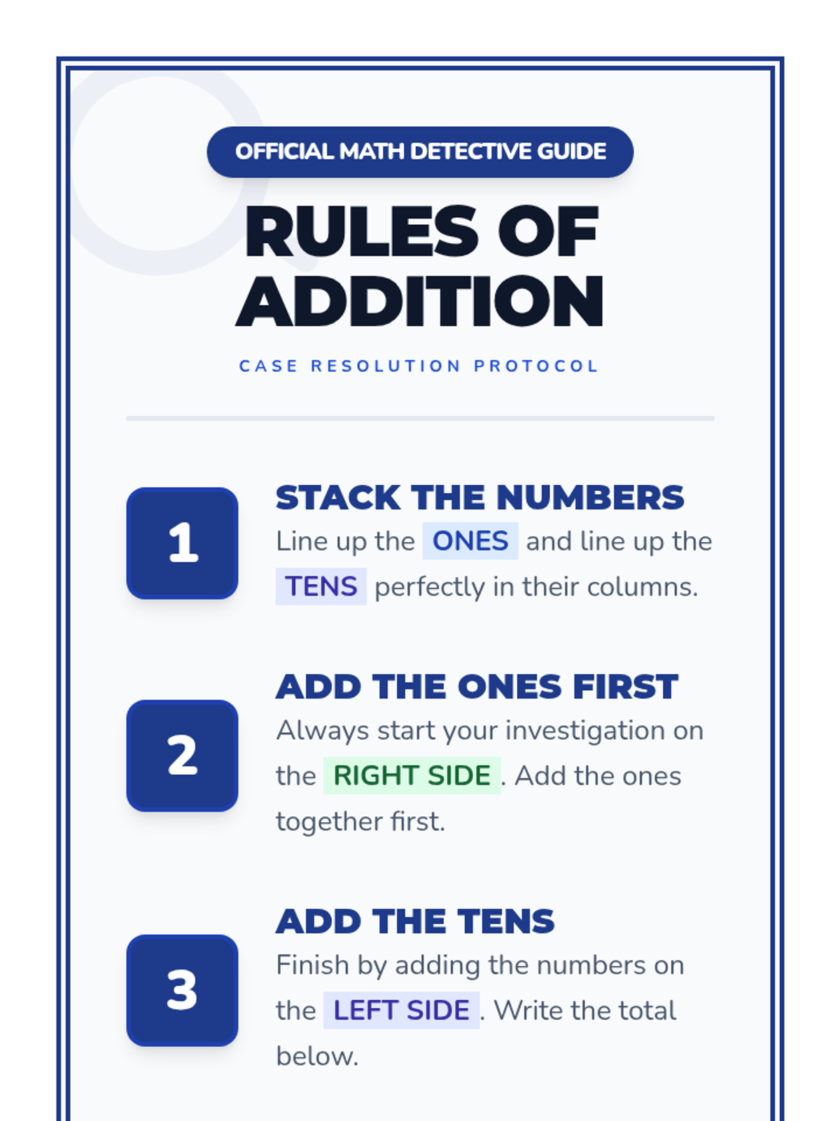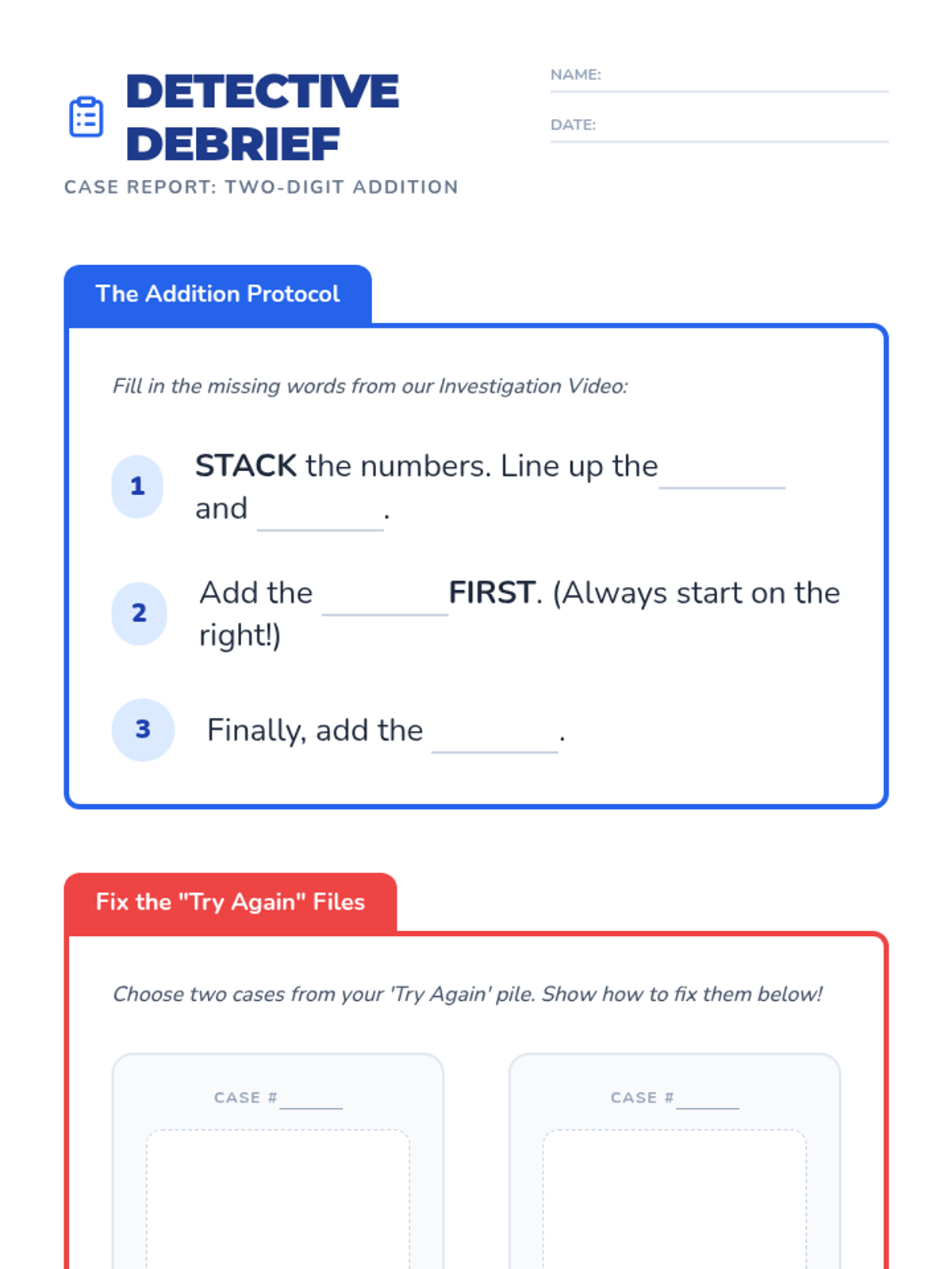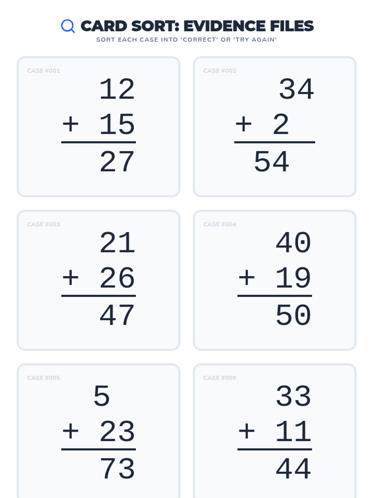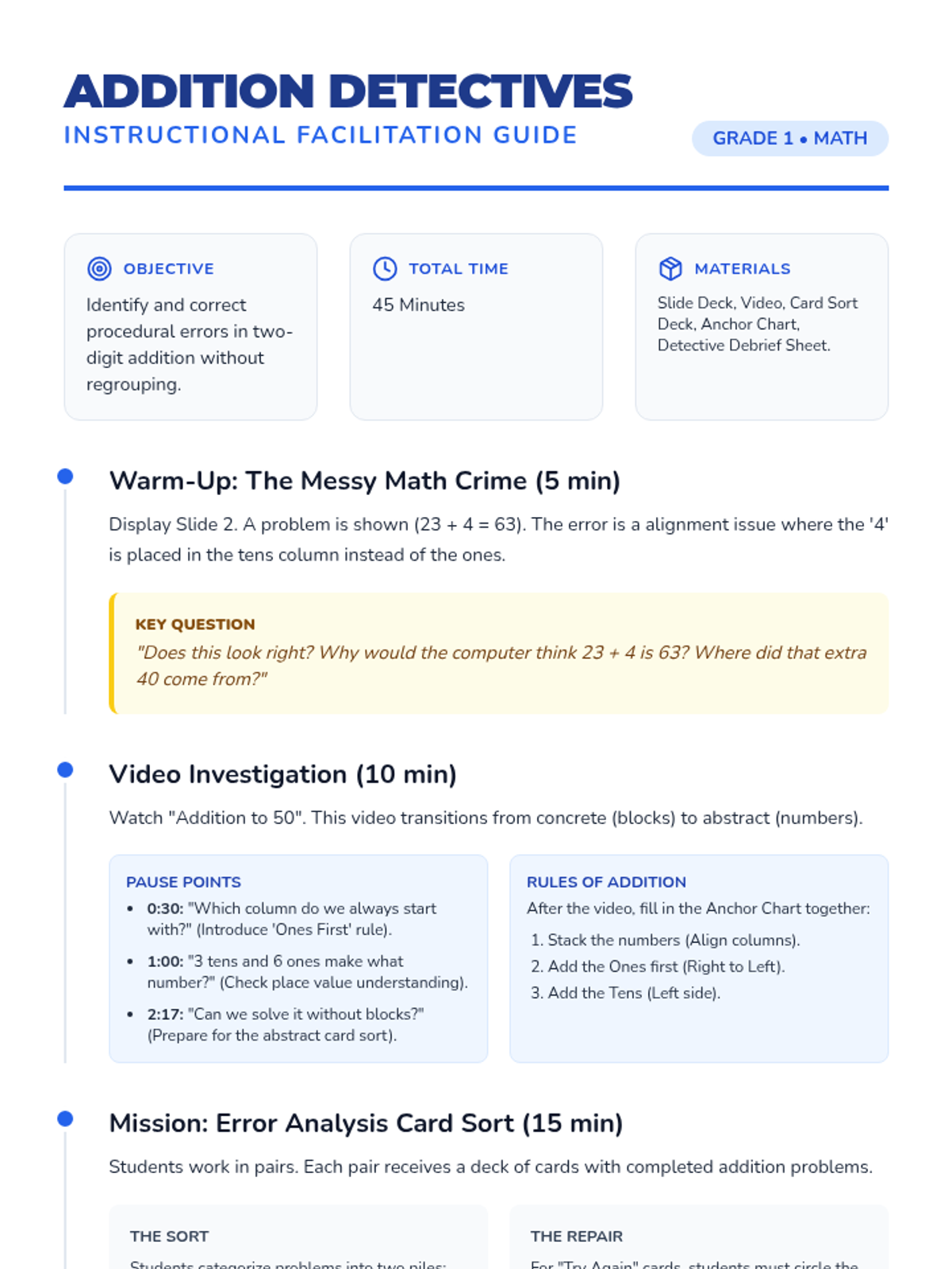A first-grade math lesson where students become 'Math Detectives' to spot and solve errors in two-digit addition. They learn the fundamental rules of vertical addition through a visual video and practice their skills with a collaborative card sort activity.