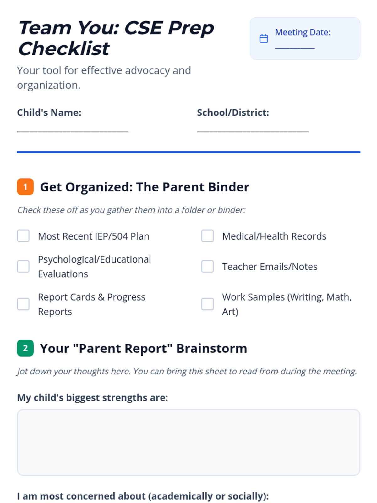 This lesson provides parents of Special Education and ENL students with practical tools and strategies to prepare for CSE meetings, focusing on effective advocacy and organizational skills.