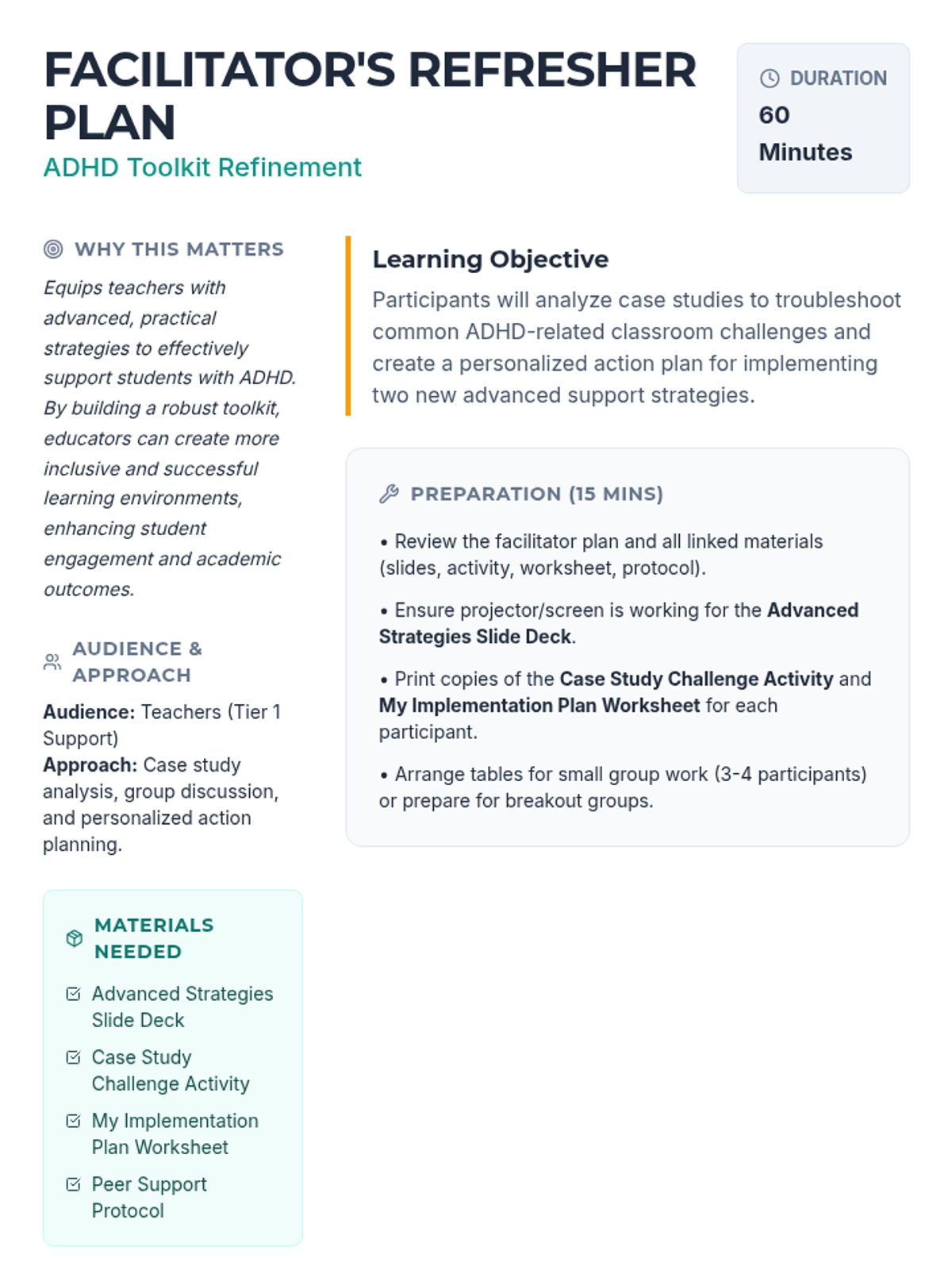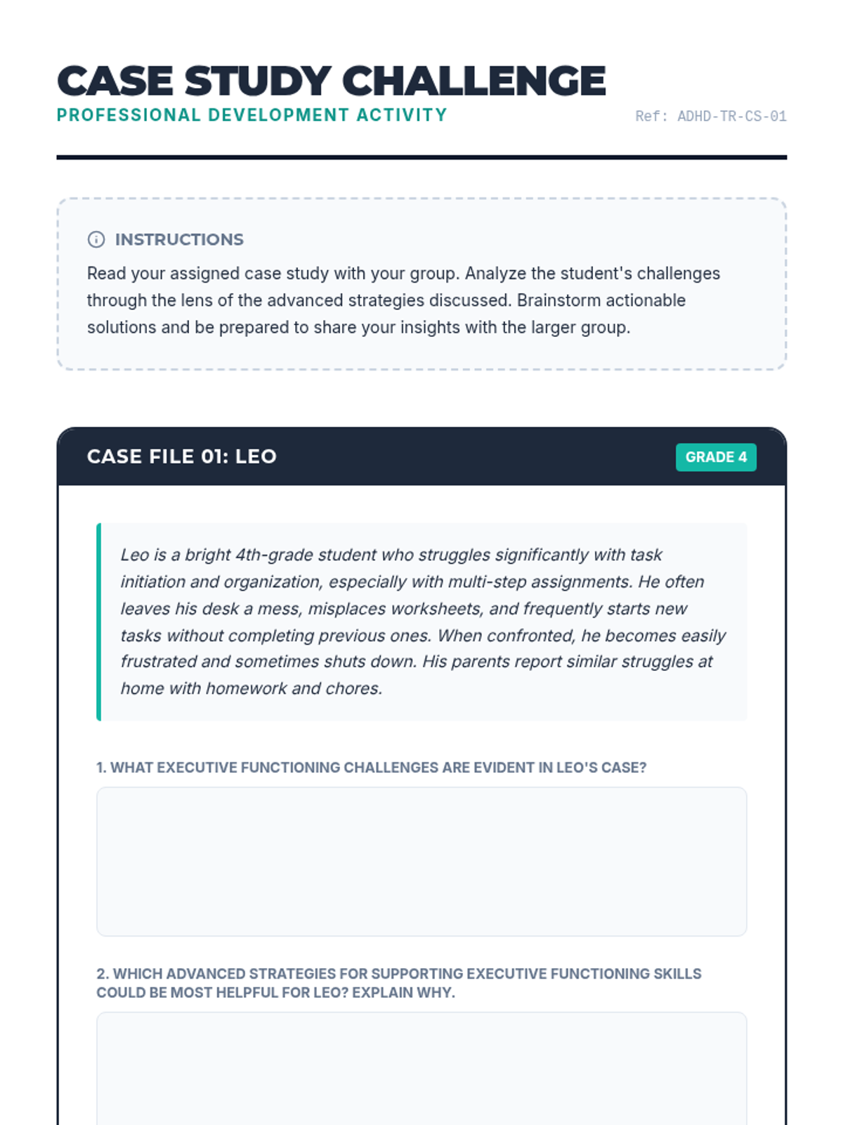 A 60-minute professional development session for teachers focusing on advanced executive function, emotional regulation, and scaffolding strategies to support students with ADHD. Educators will analyze case studies and develop personalized action plans.
