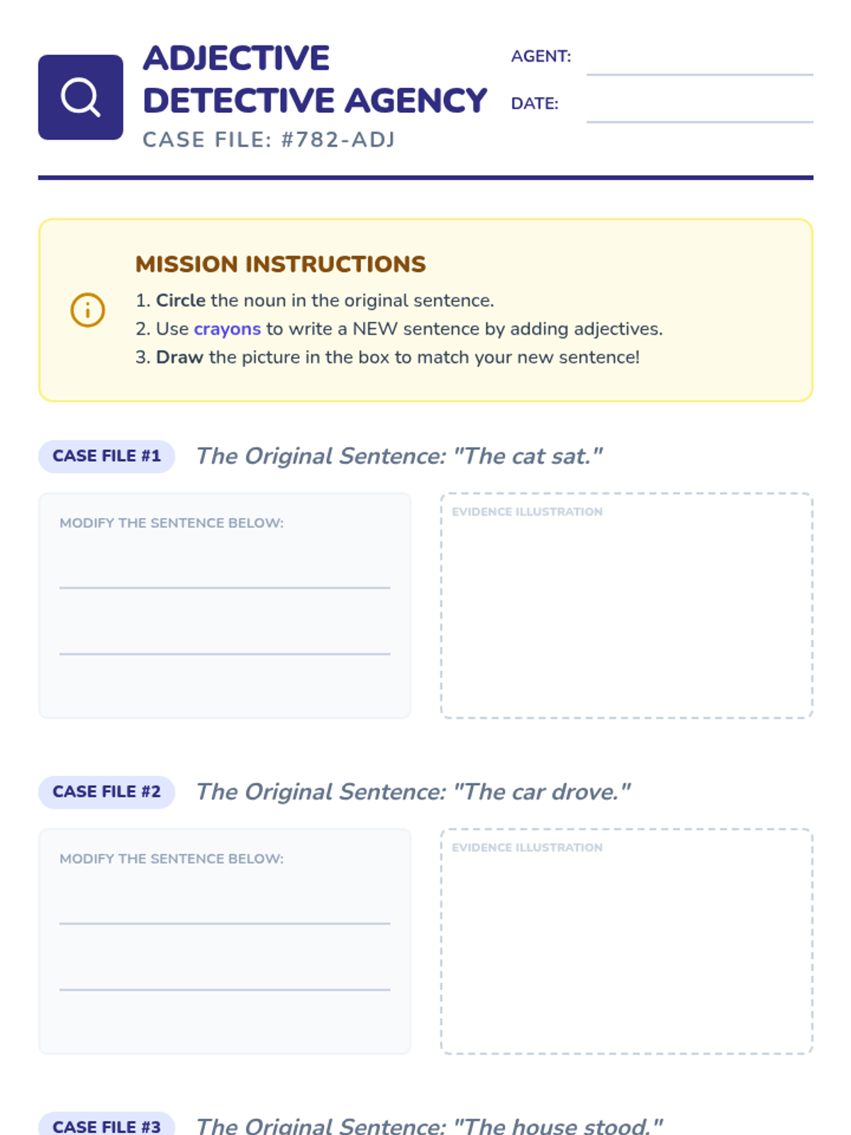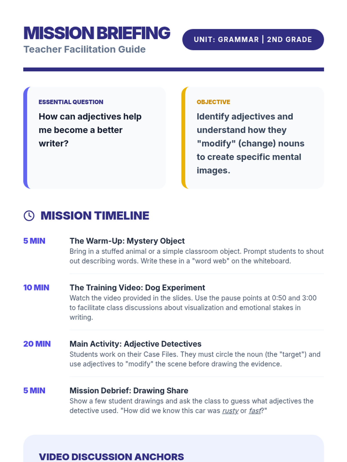 Students become 'Adjective Detectives' to discover how adjectives modify nouns and change the pictures in a reader's head through a video analysis and a hands-on writing and drawing activity.