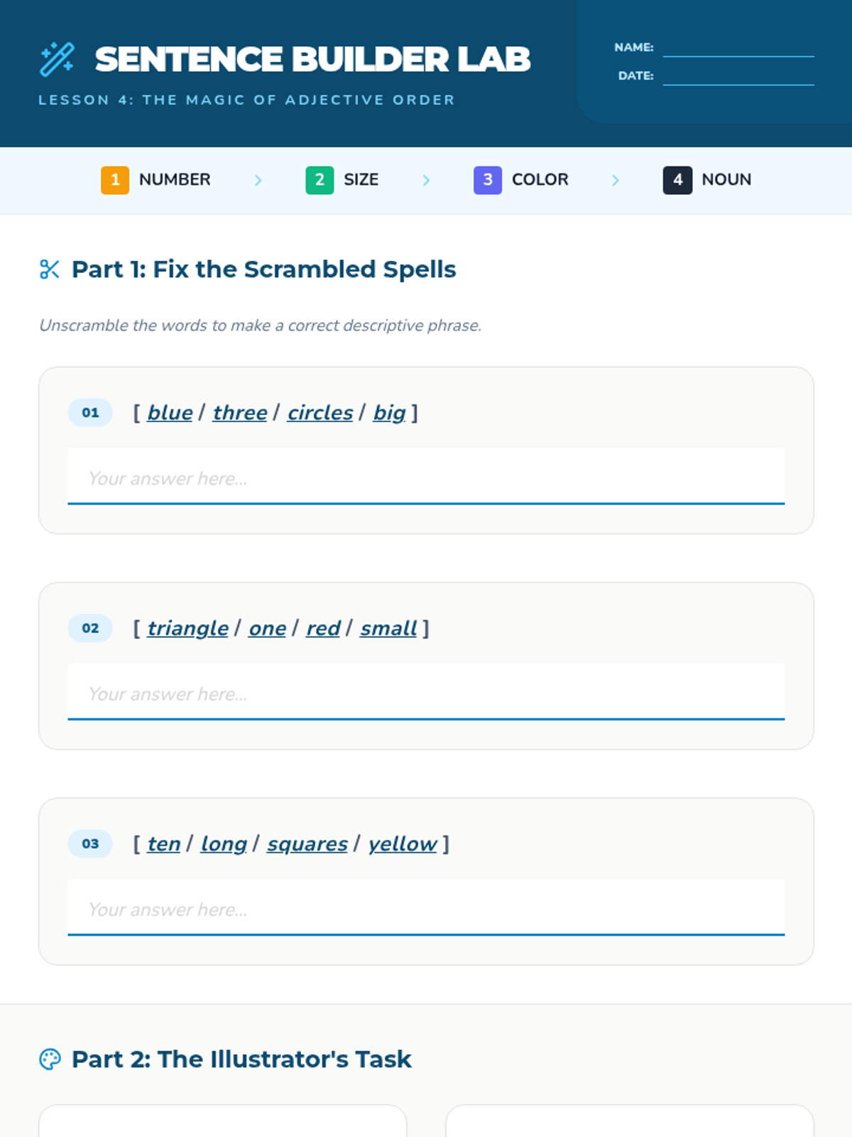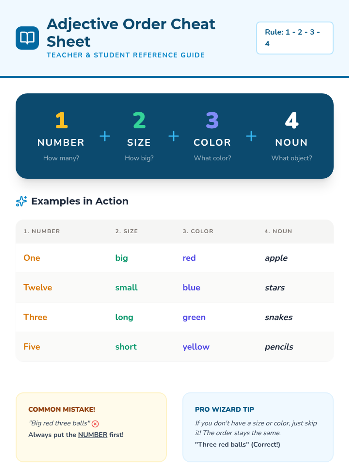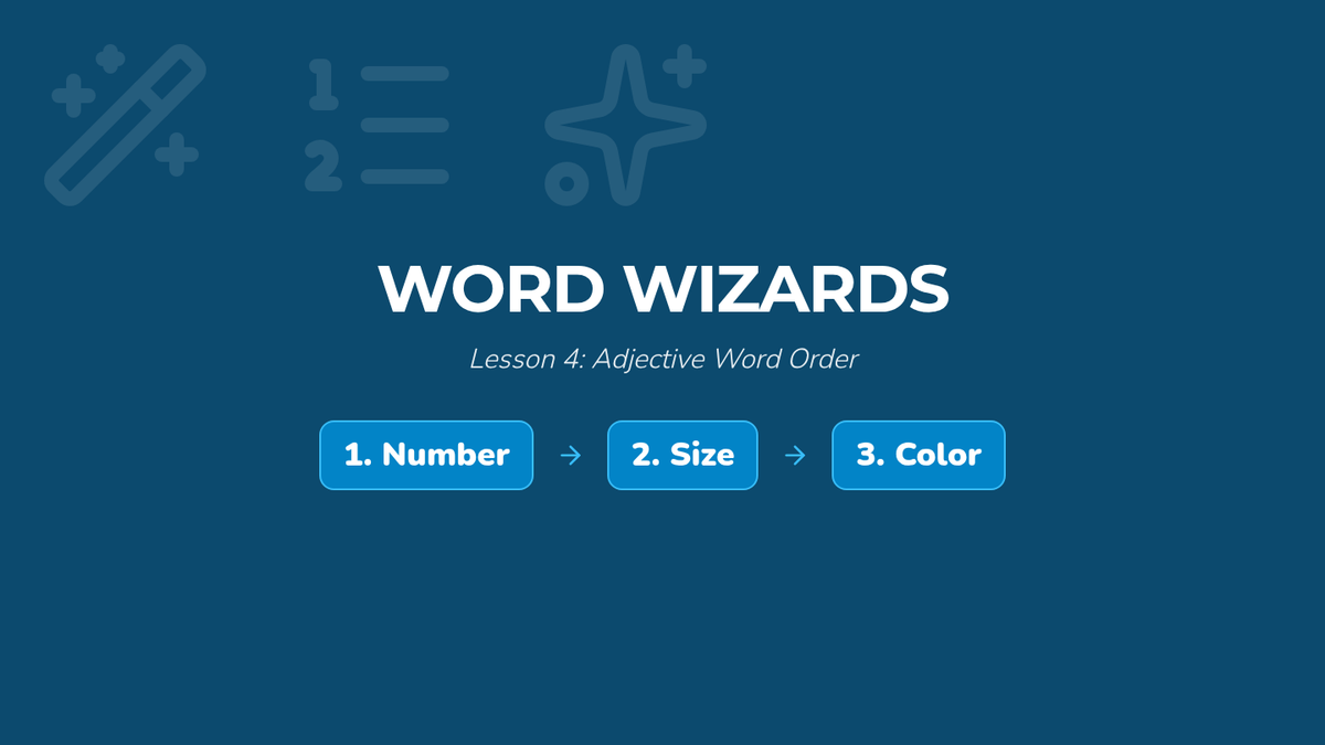 Students master the syntactic order of adjectives (Number + Size + Color + Noun) to create descriptive phrases.