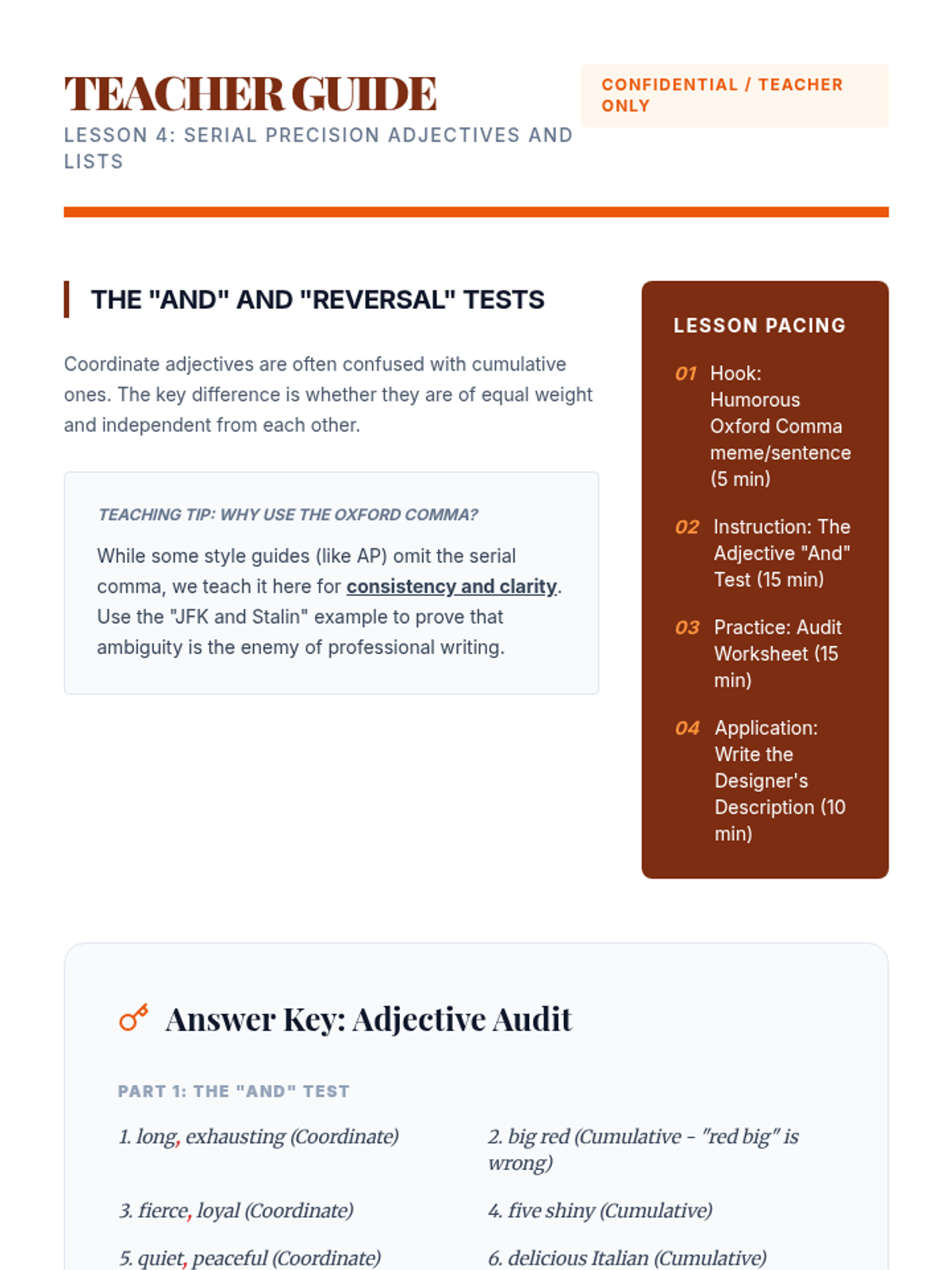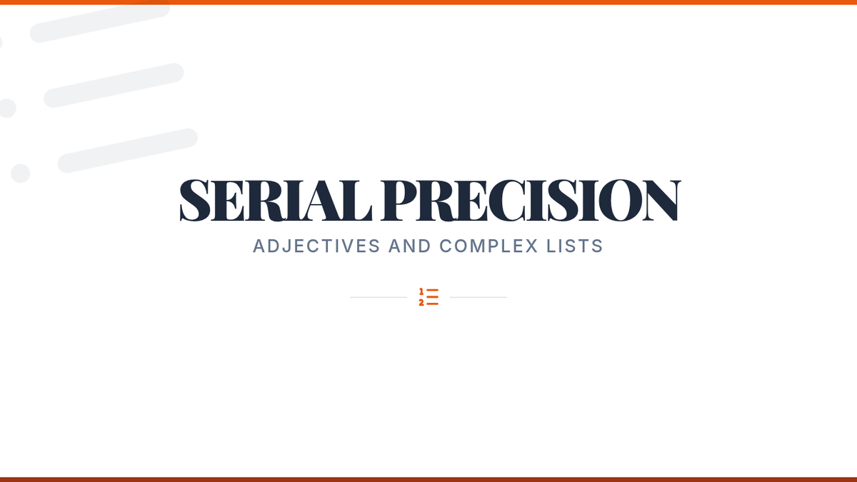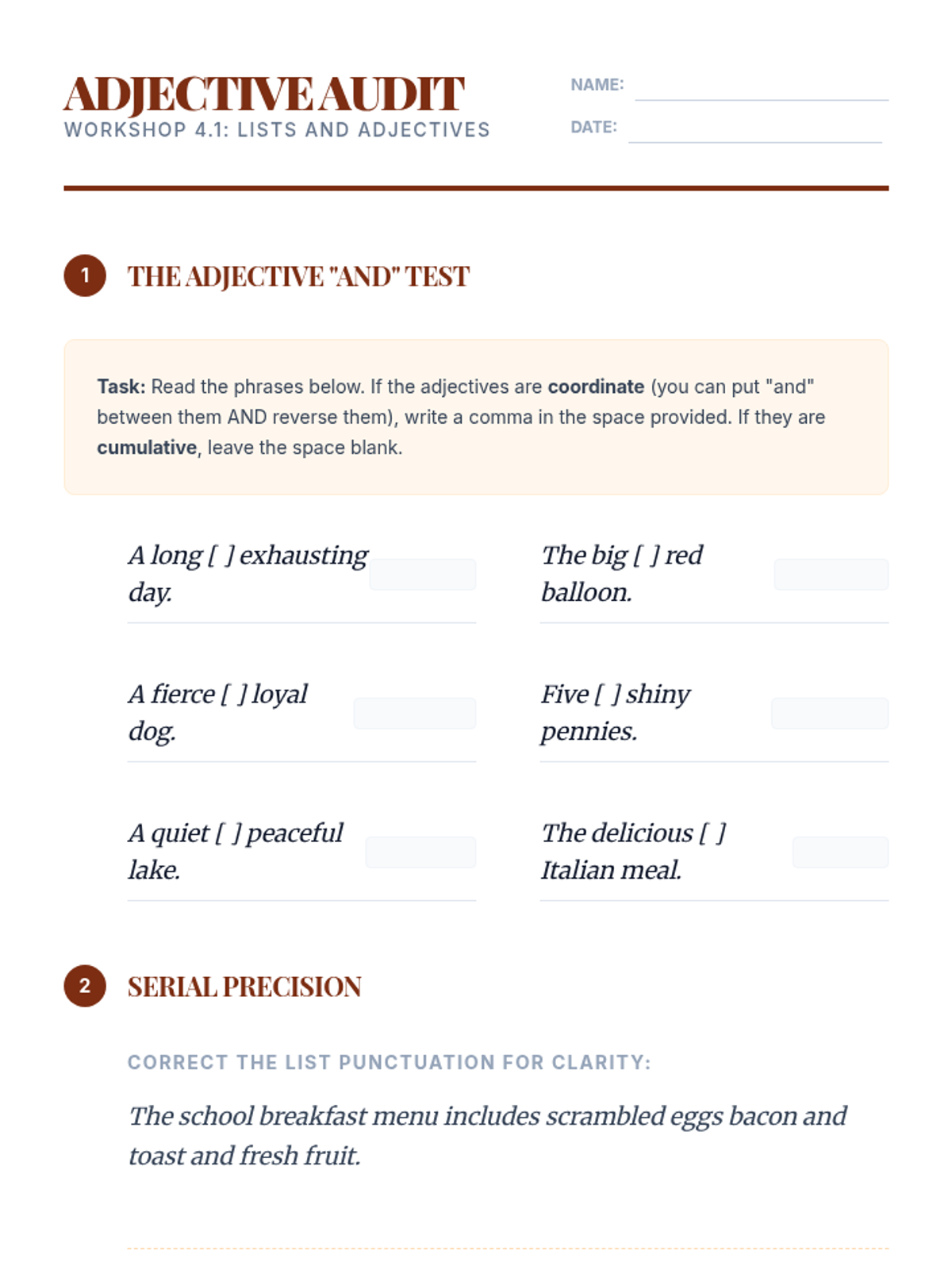 Students learn to use the 'and' test for coordinate adjectives and the serial comma for complex lists.