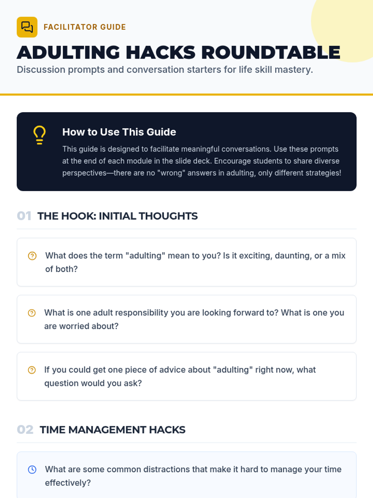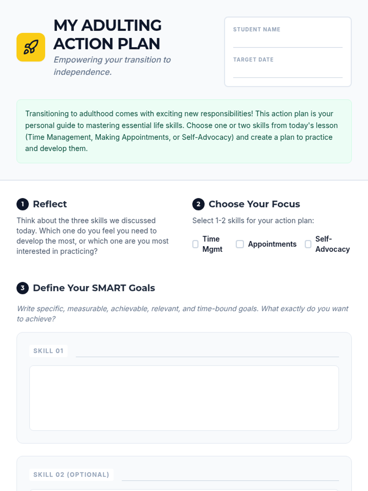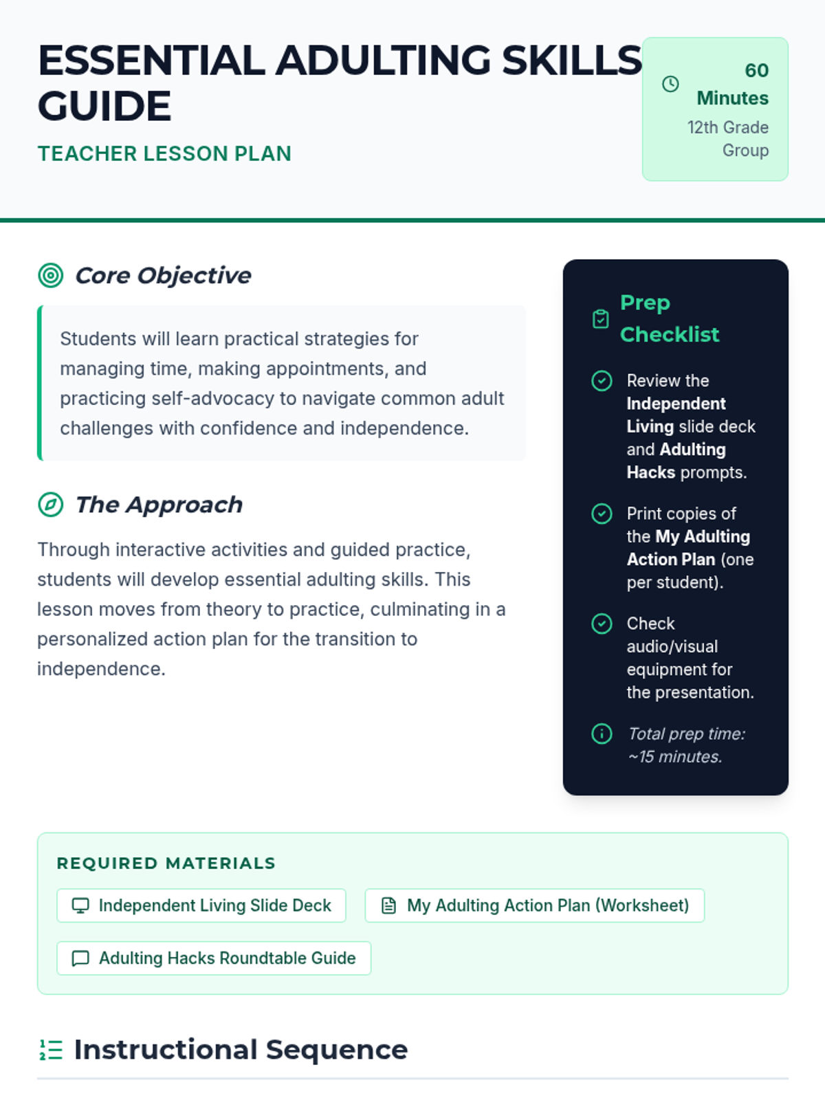 A comprehensive workshop for 12th graders to master essential life skills like time management, appointment setting, and self-advocacy as they transition to independence.