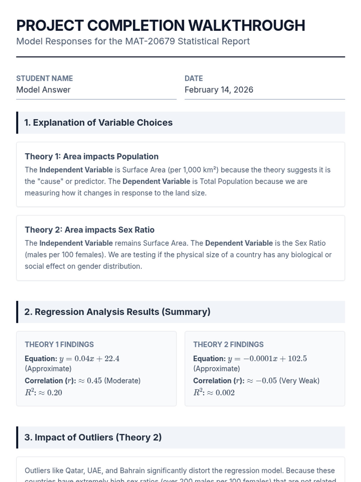 A comprehensive lesson focused on performing and interpreting linear regression analysis using real-world UN population and surface area data. Students will learn to identify variables, evaluate the impact of outliers, and draw conclusions based on correlation coefficients.
