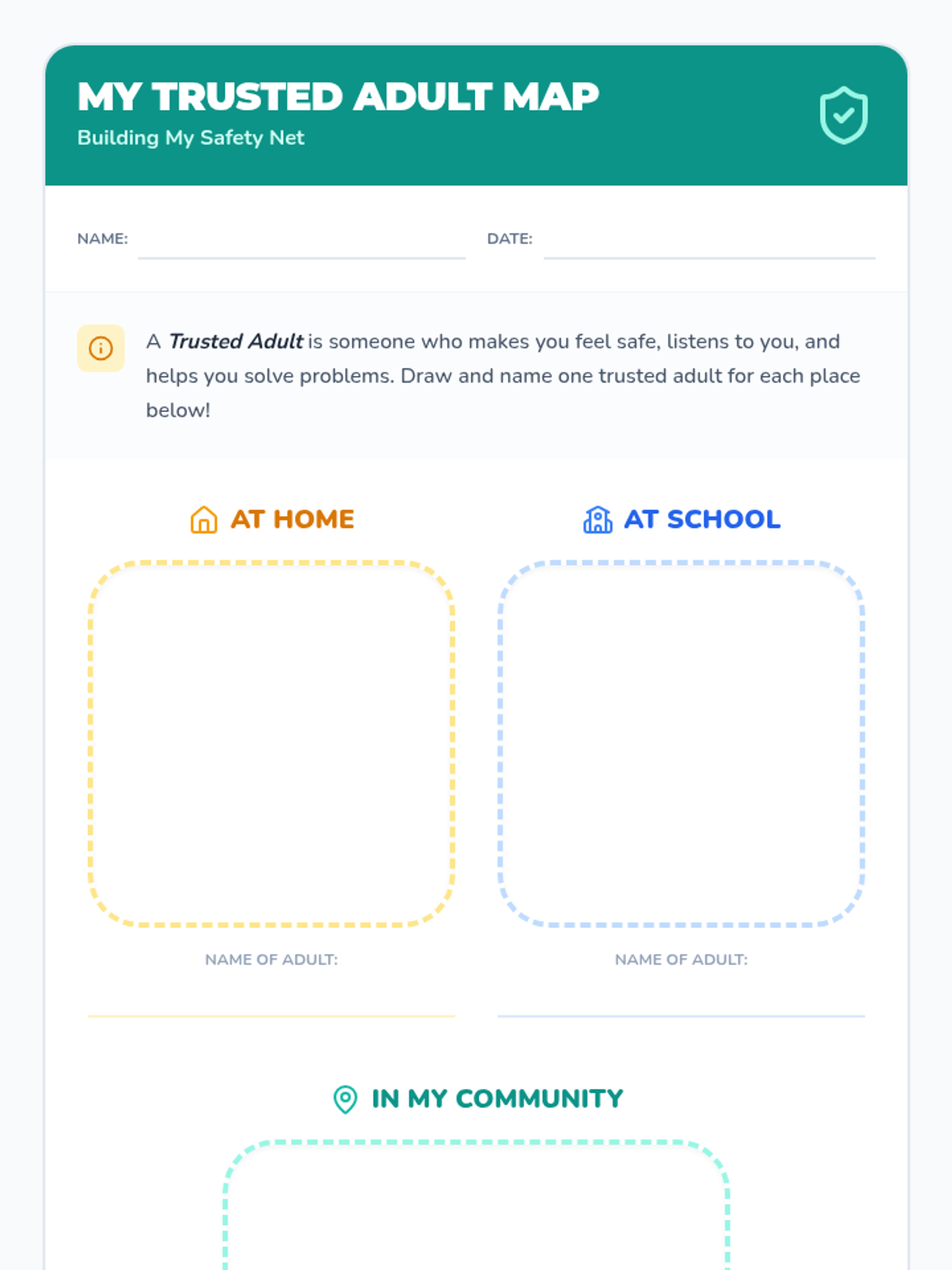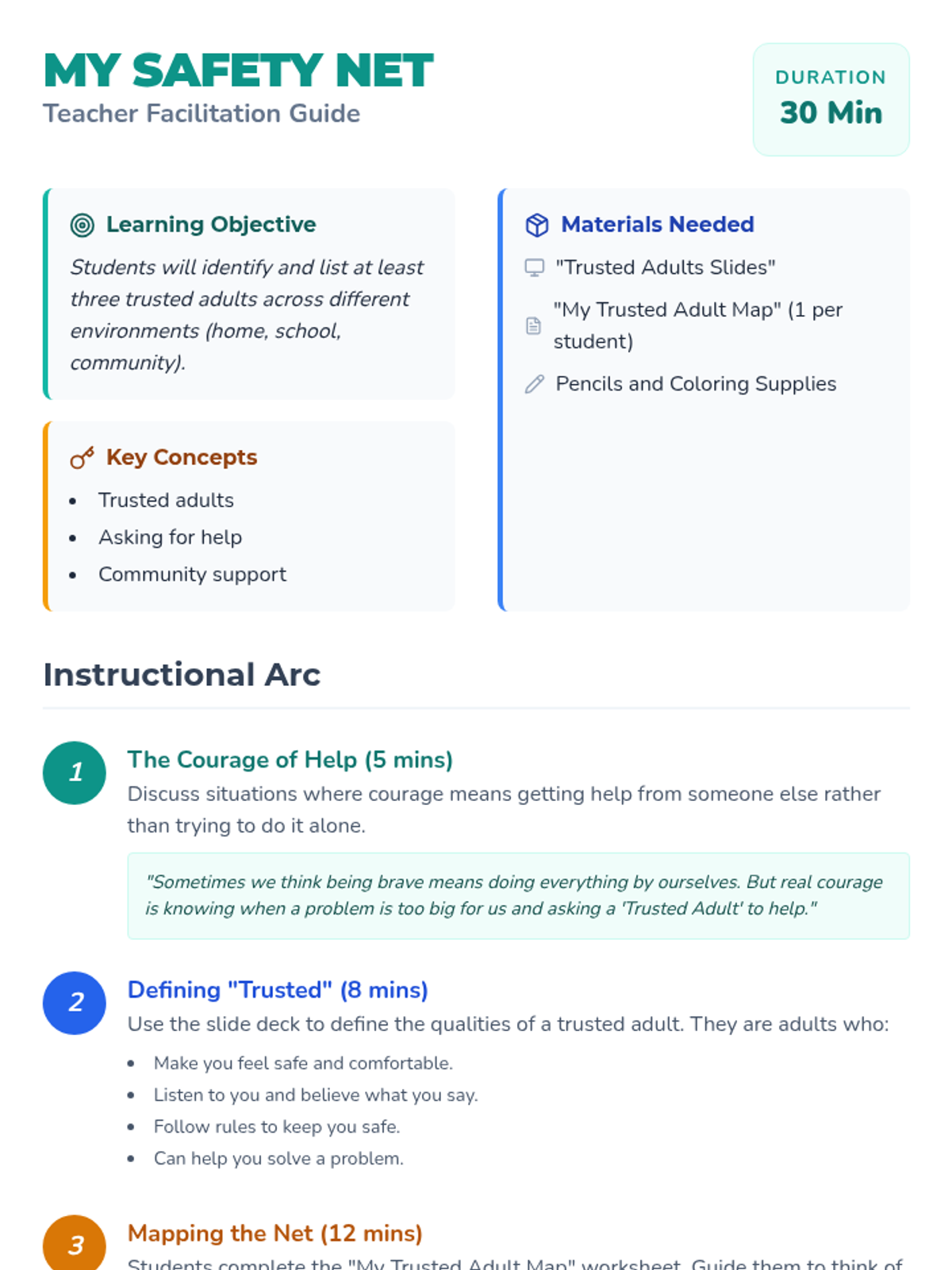 A 30-minute lesson for 1st graders to identify their personal support system of trusted adults at home, school, and in the community.