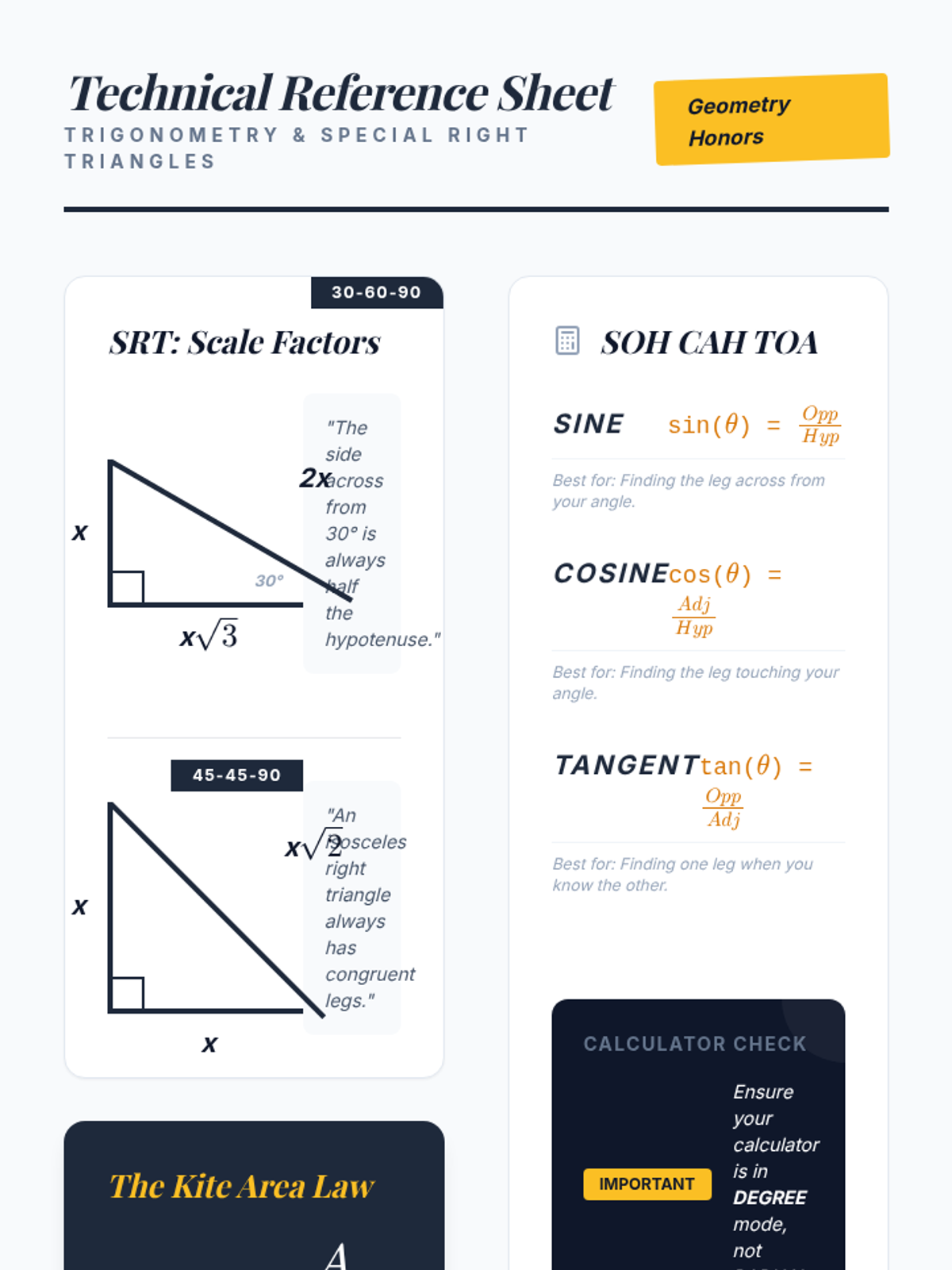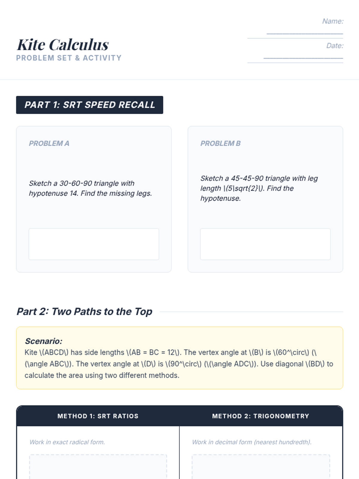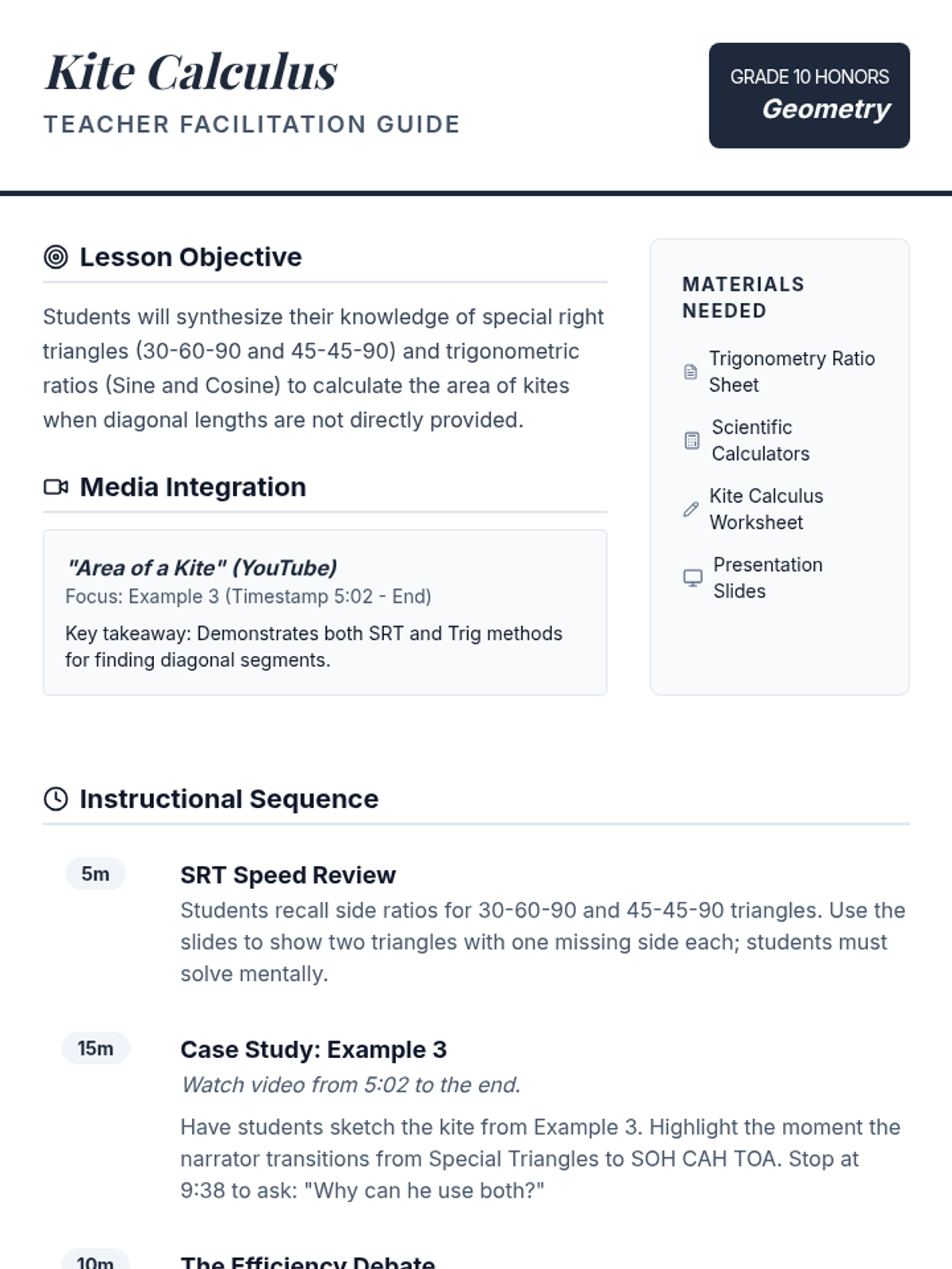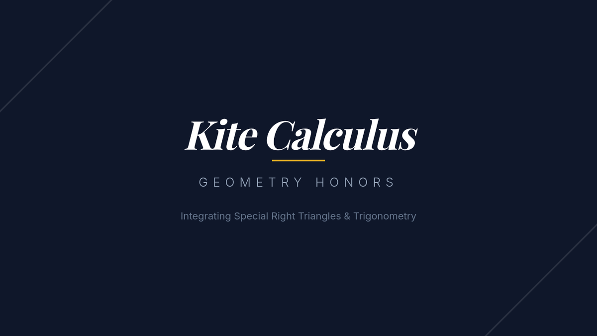 An advanced geometry lesson for 10th-grade honors students focusing on calculating the area of kites by integrating special right triangle ratios and trigonometry. Students compare the efficiency of both methods through a guided video analysis and a 'Two Paths' problem-solving activity.
