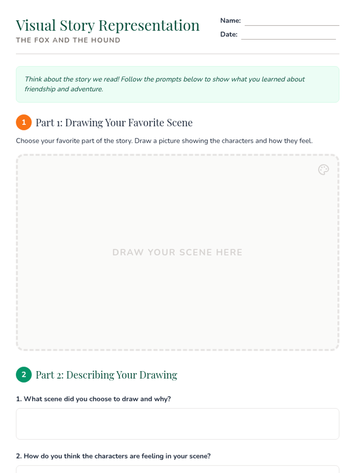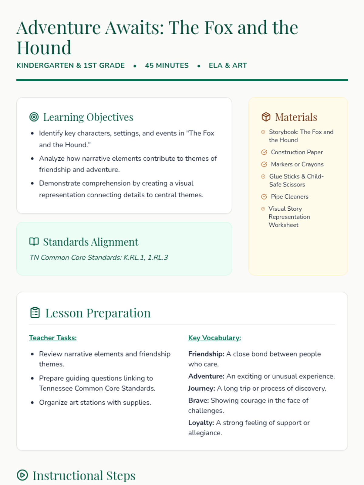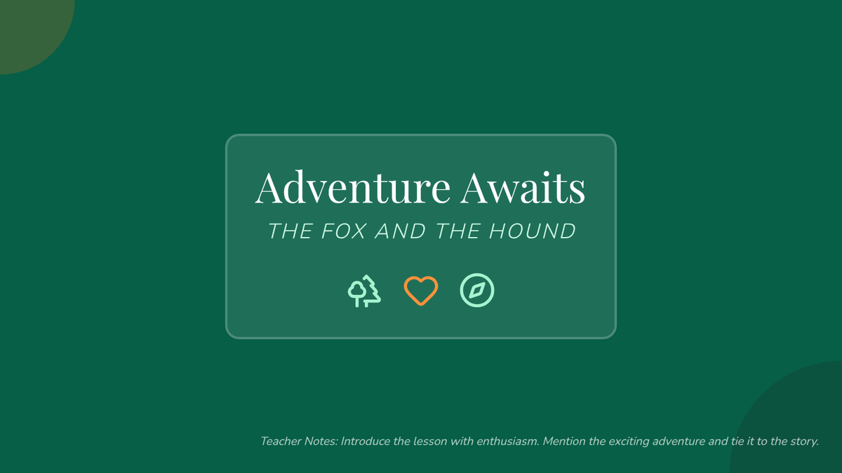 A 45-minute literacy and art lesson for K-1 students exploring themes of friendship and adventure through 'The Fox and the Hound.' Students will identify narrative elements, learn key vocabulary, and create visual story representations.