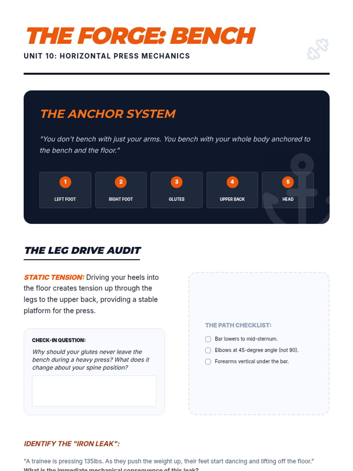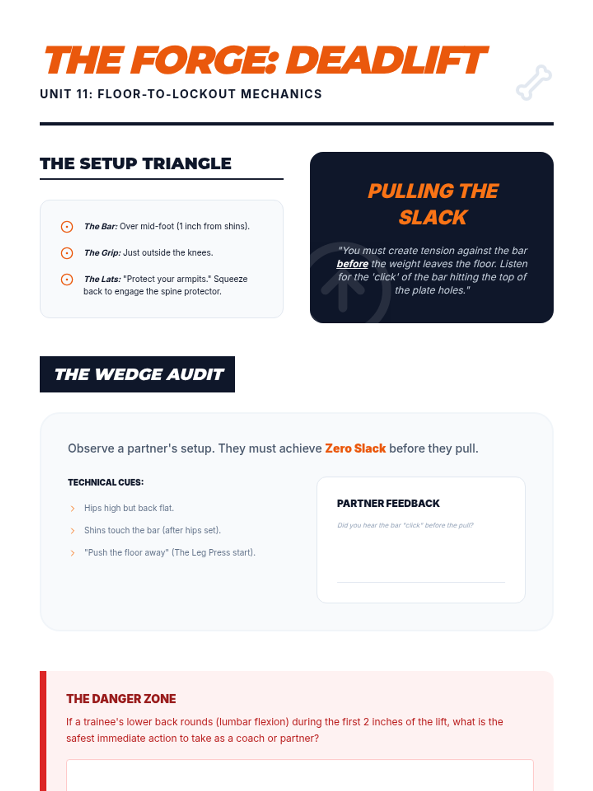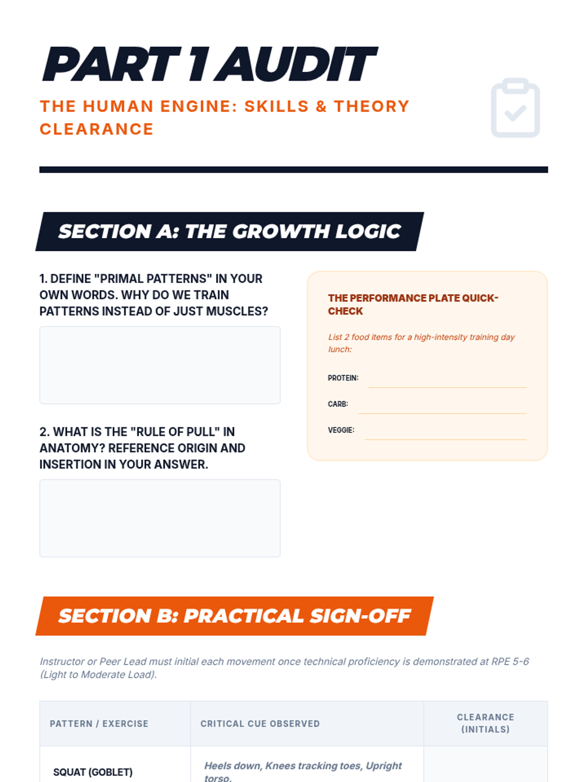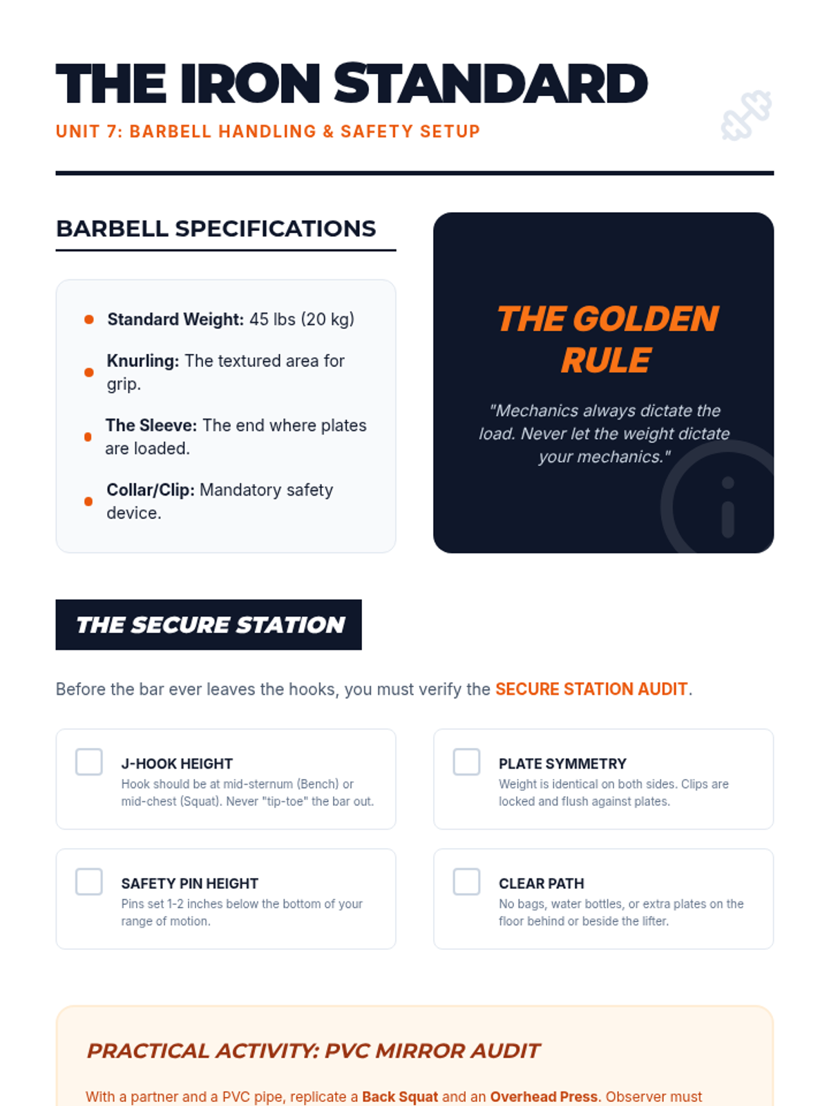 Comprehensive review of Part 1 concepts and a practical skills audit to clear students for the advanced compound lifts of Part 2.