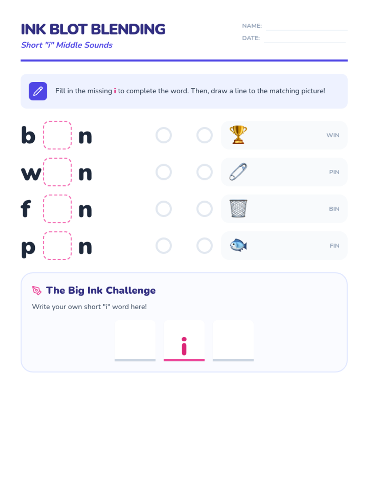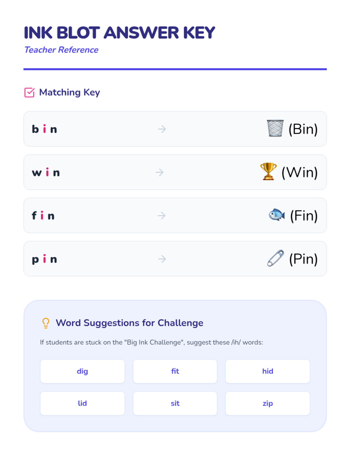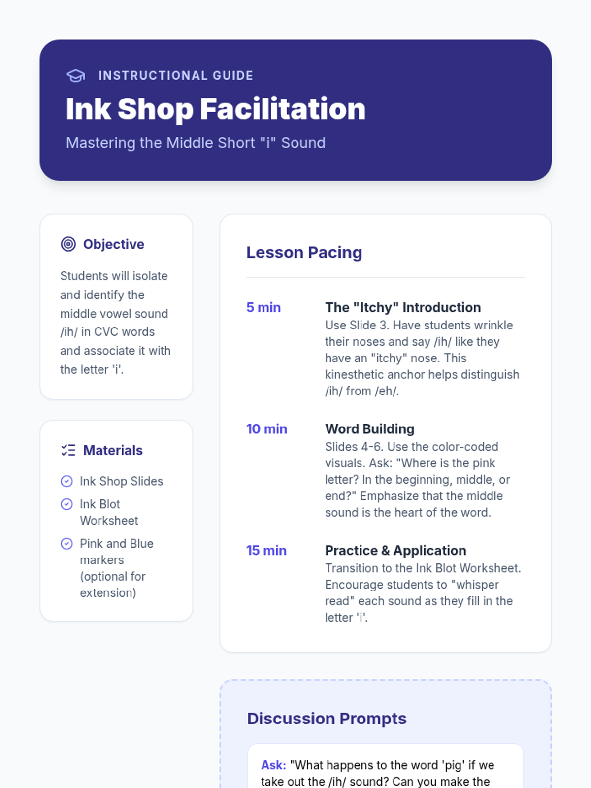 A quick introductory lesson on identifying and pronouncing the short 'i' sound in middle of CVC words using color-coded visual supports.