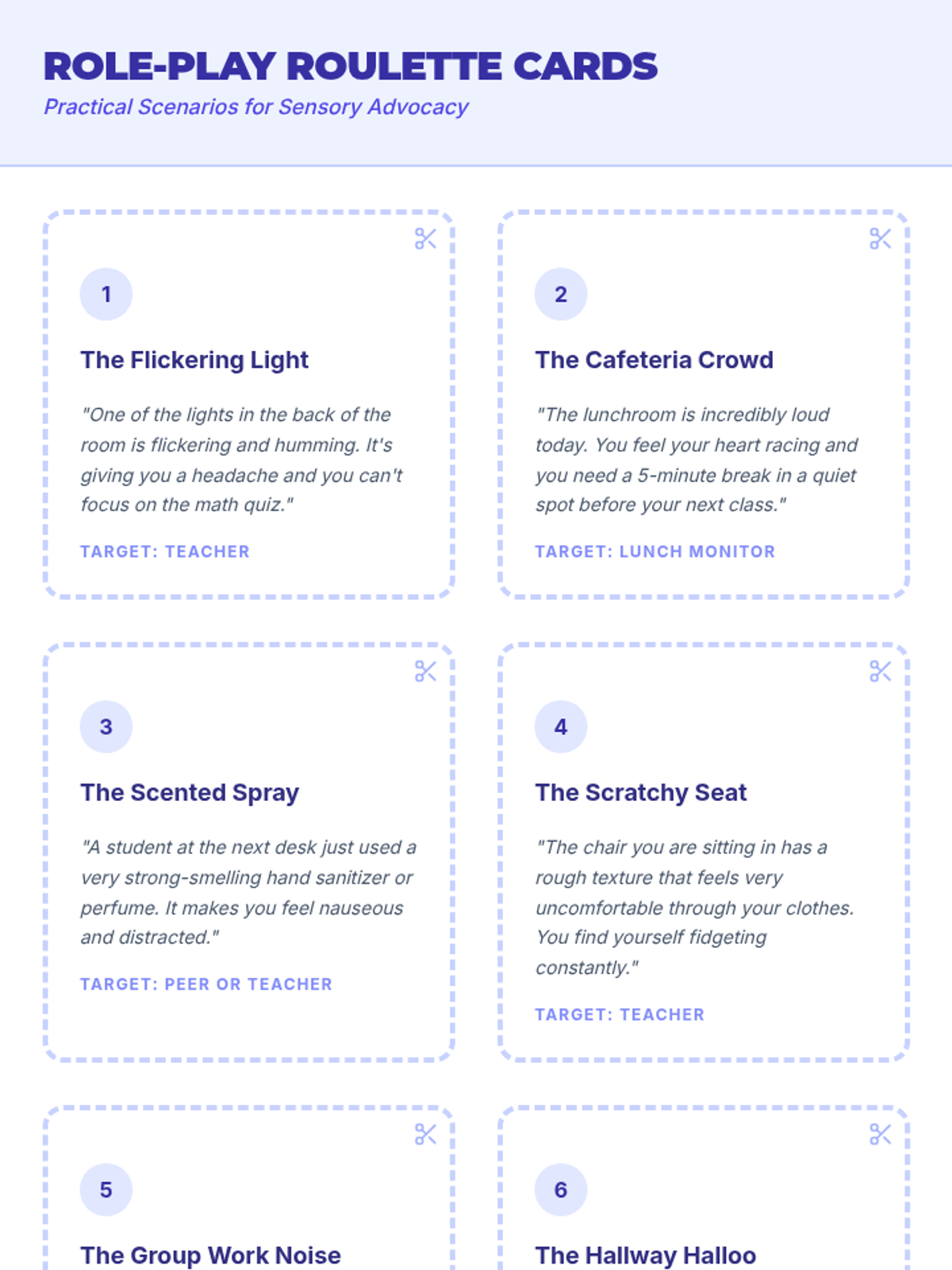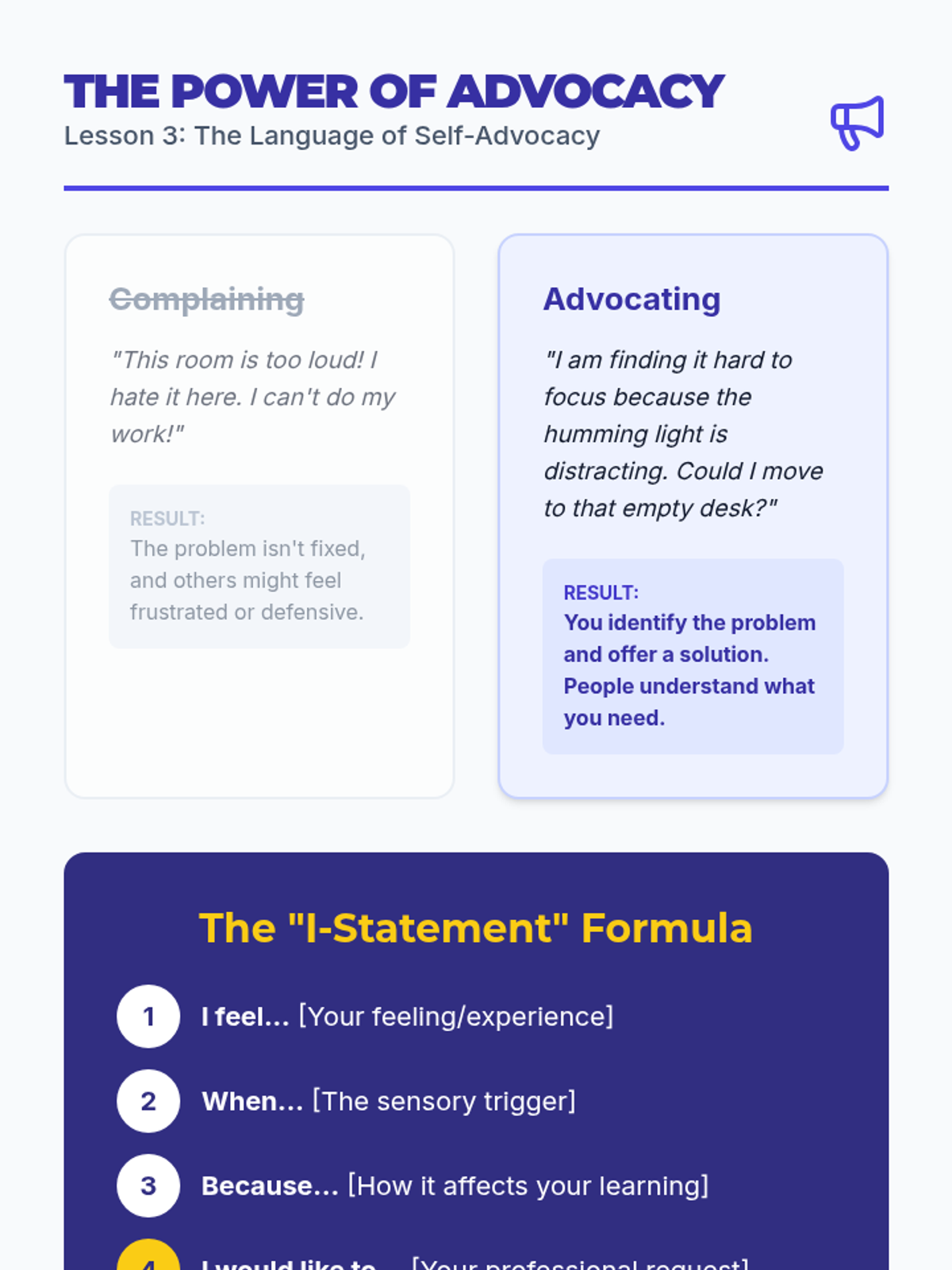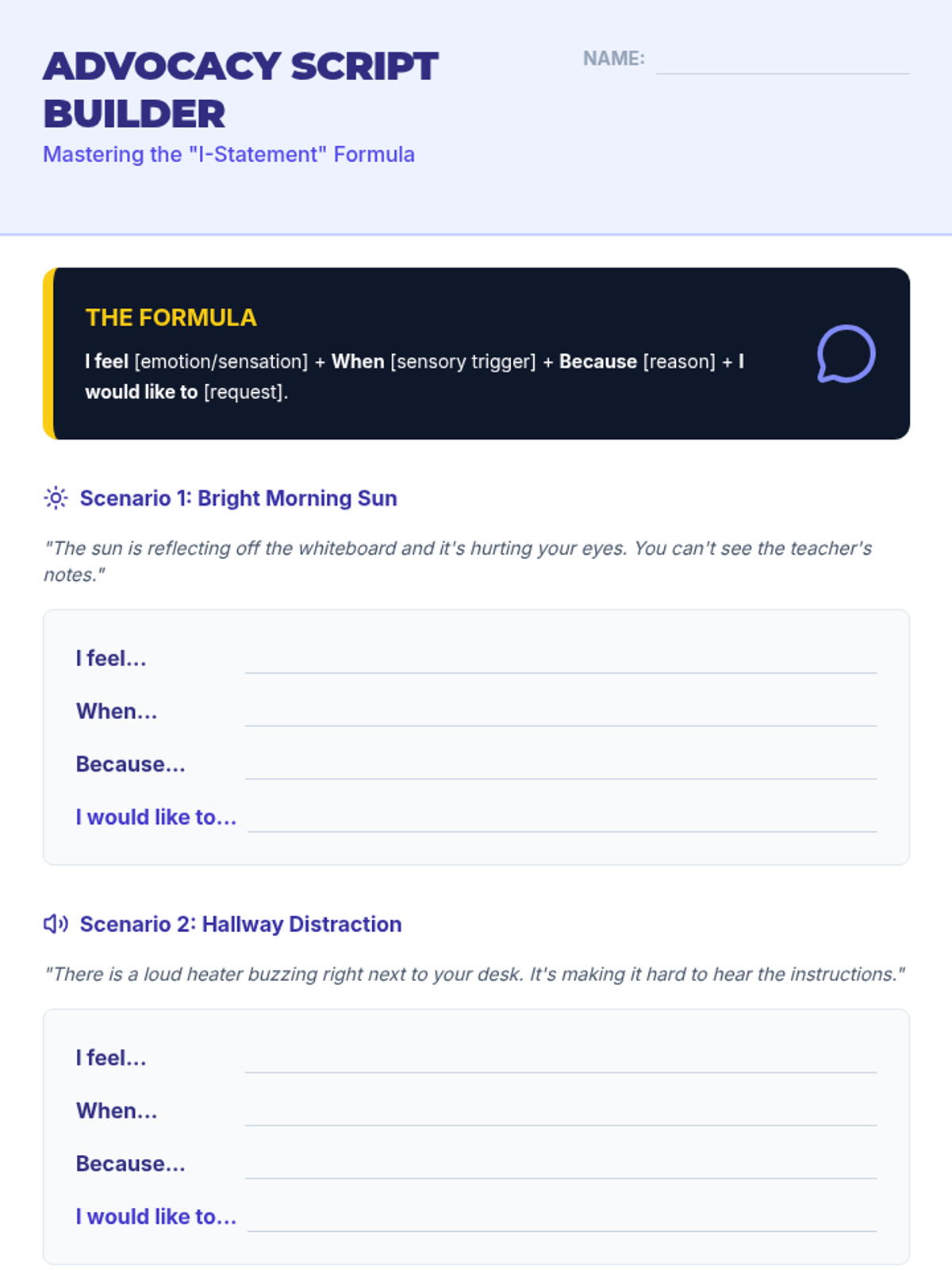 Students learn to use 'I' statements to advocate for their sensory needs. They practice differentiating between complaining and professional advocacy through role-play.
