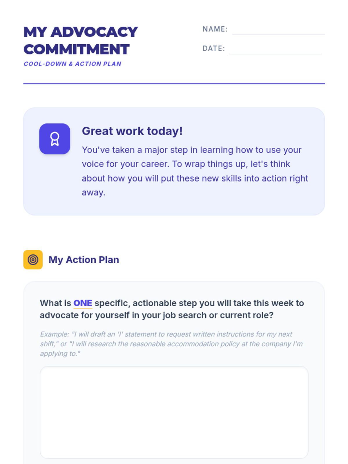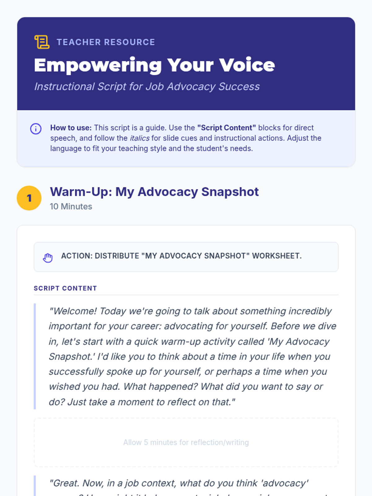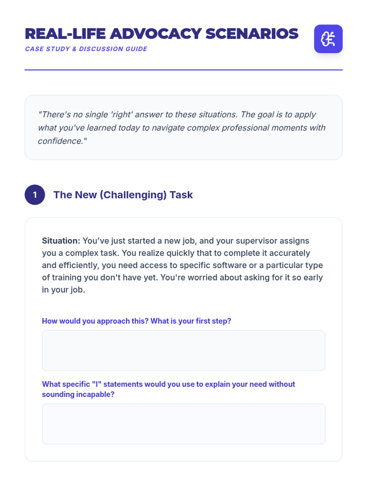 A high-energy, 30-minute coaching session focused on five critical self-advocacy scenarios. Includes role-play, visual aids, and practical toolkits for immediate application in real-world settings.